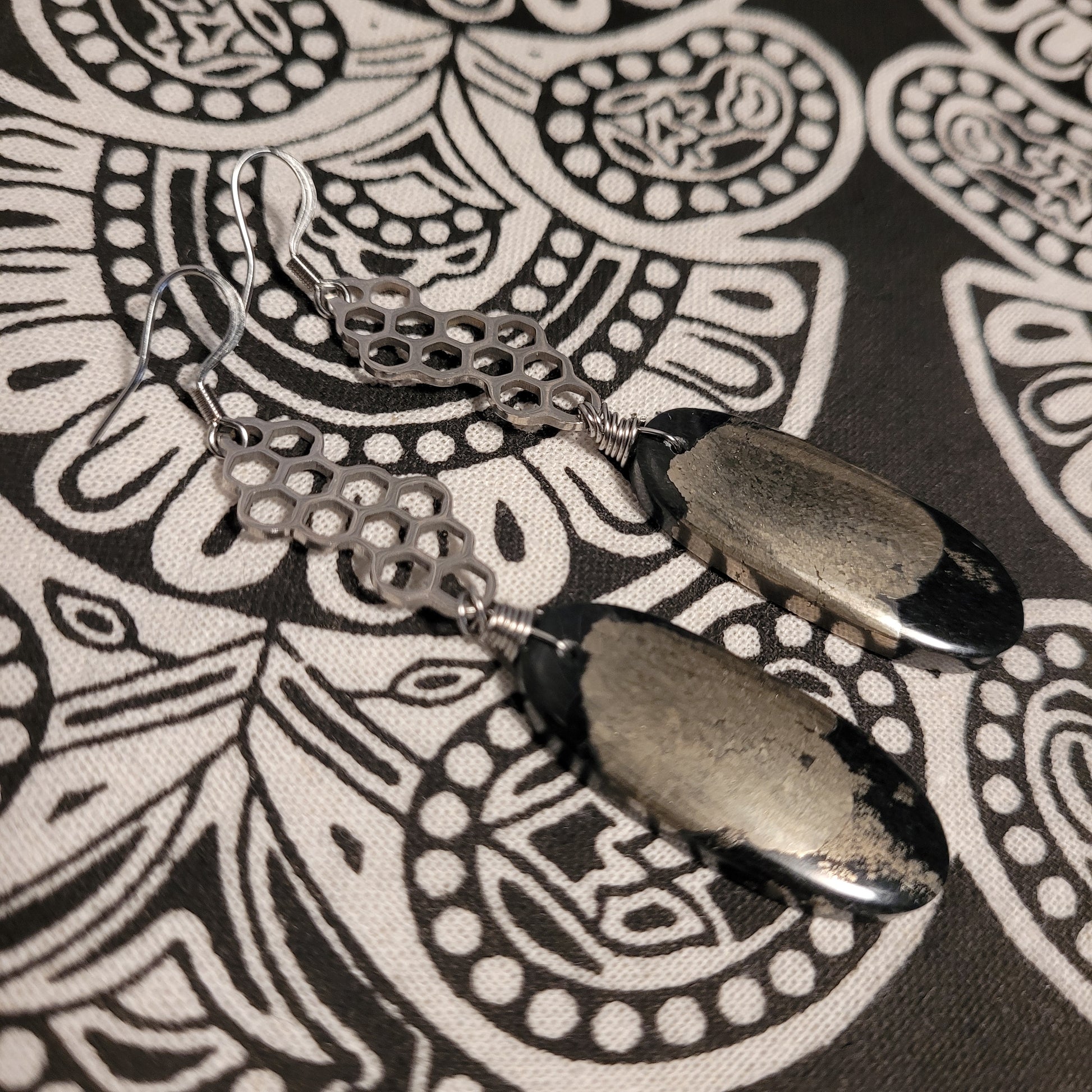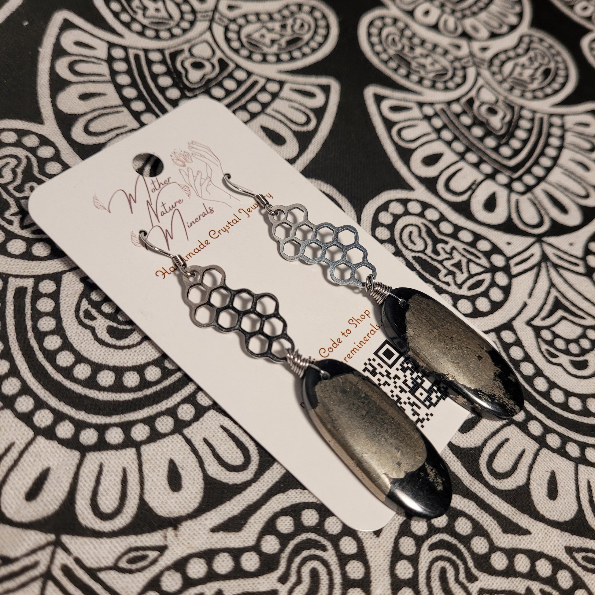 I created these high quality Apache Gold Earrings with stainless steel honeycomb bee charms, stainless steel hooks, and the Apache Gold crystal is ethically sourced from India!
