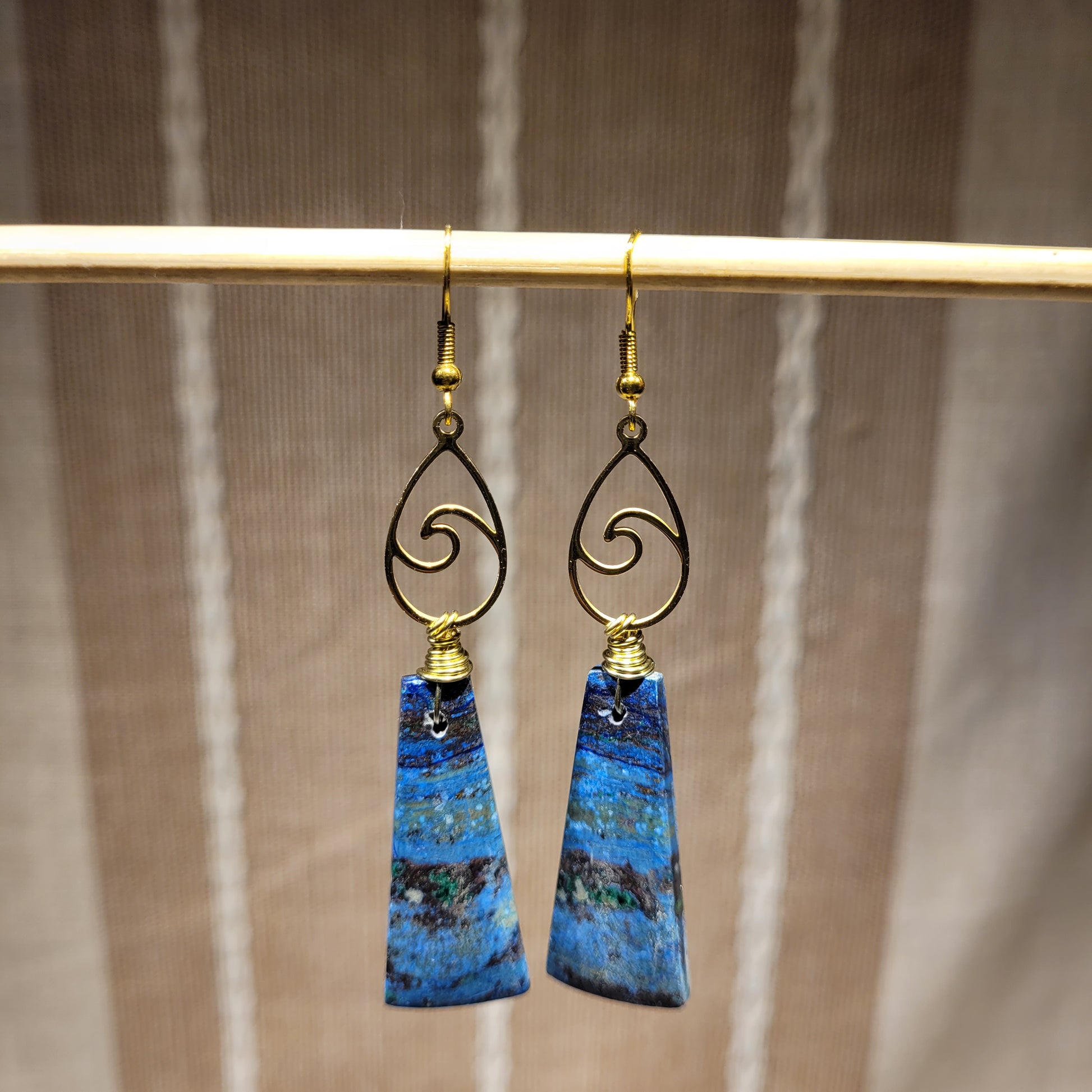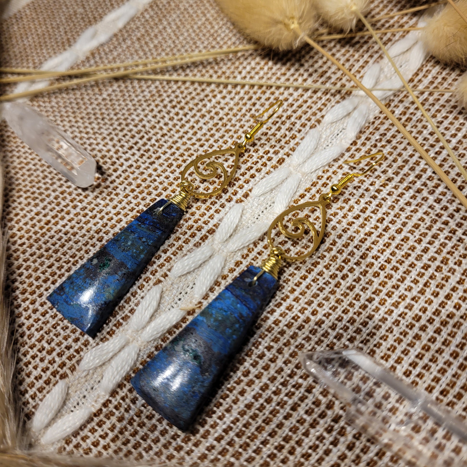 I created these Azurite Malachite Earrings with ethically sourced Azurite Malachite crystals from Arizona, USA, gold plated stainless steel wave beach charms, and stainless steel hooks!