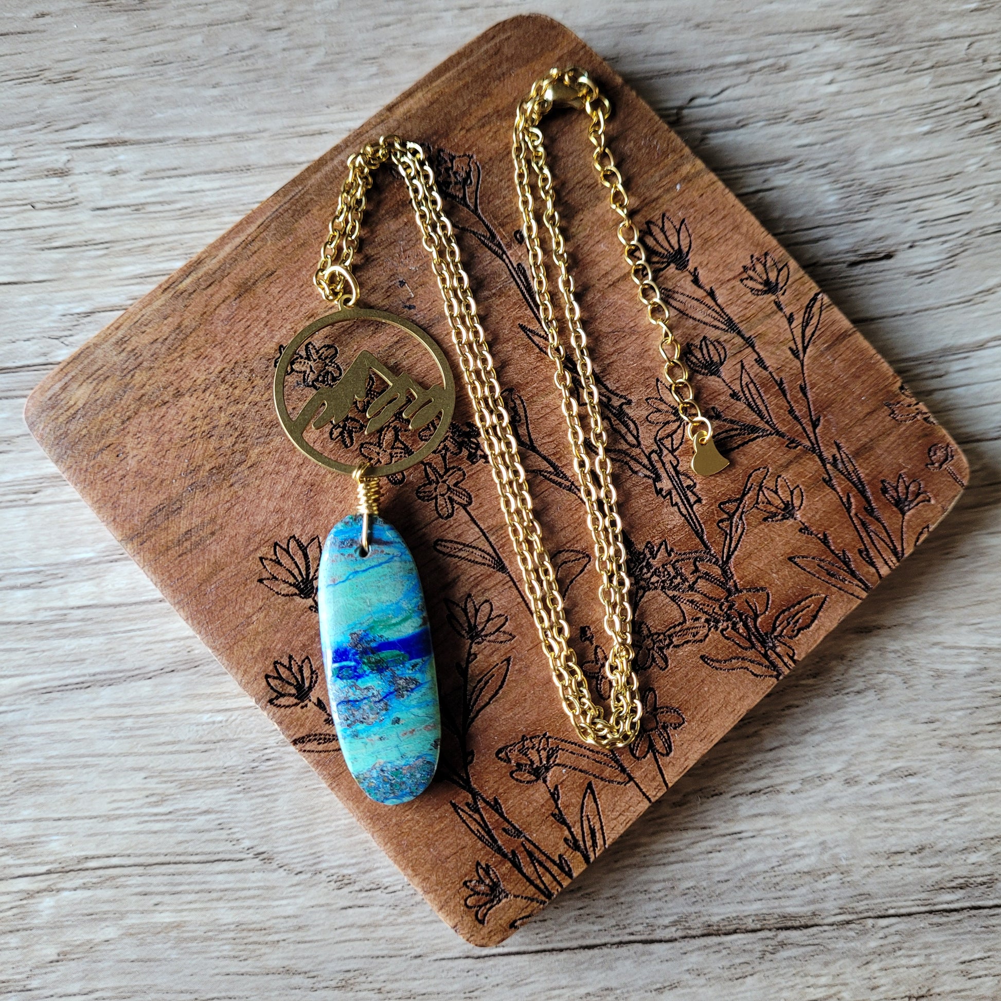I created this high quality Azurite Malachite necklace with gold stainless steel chain, brass mountain charm, brass wire wrap, and the Azurite Malachite crystal is ethically sourced!