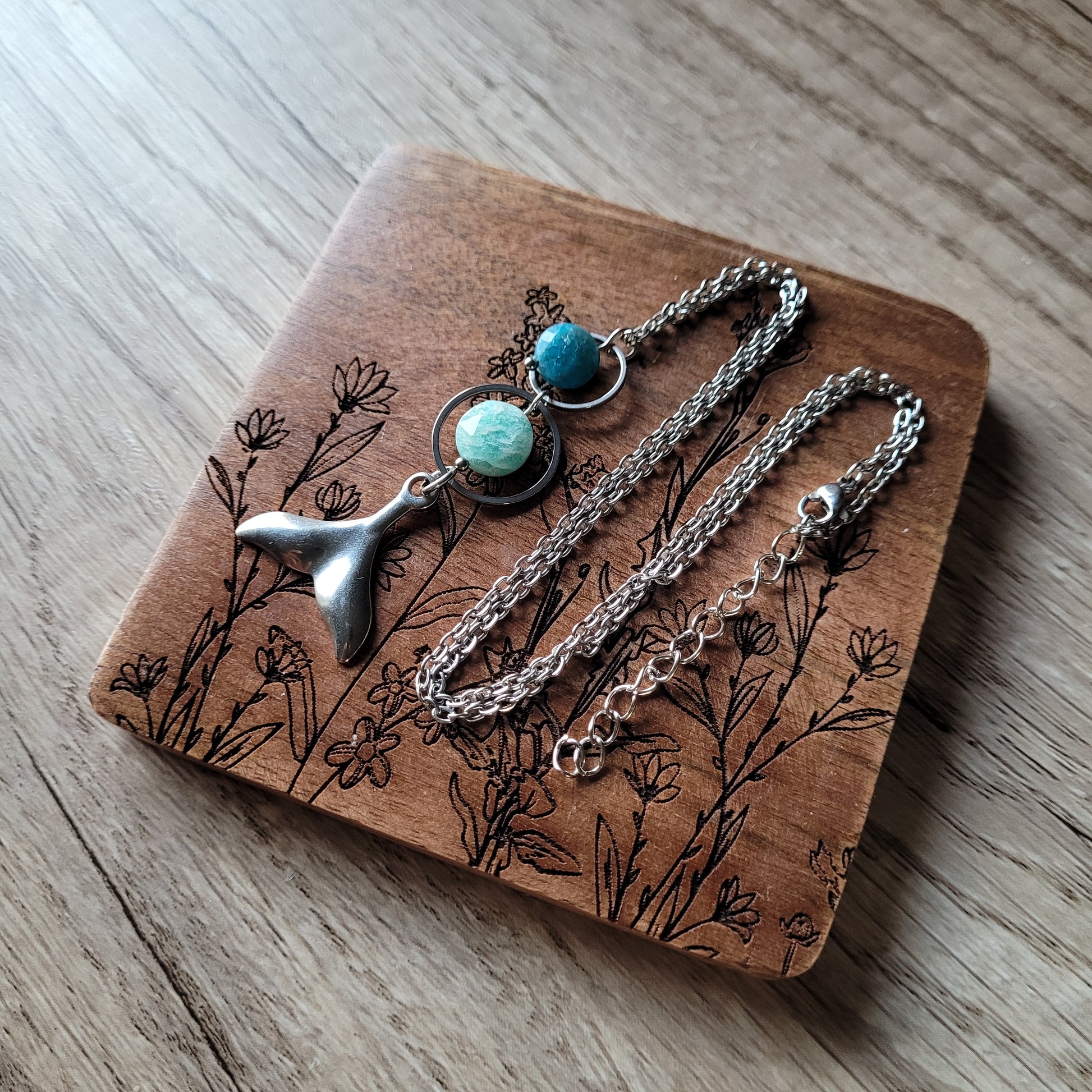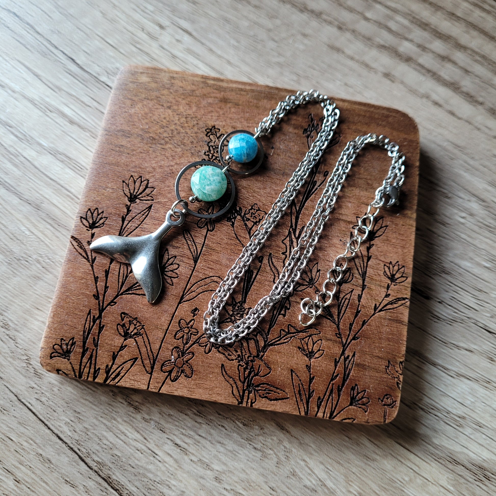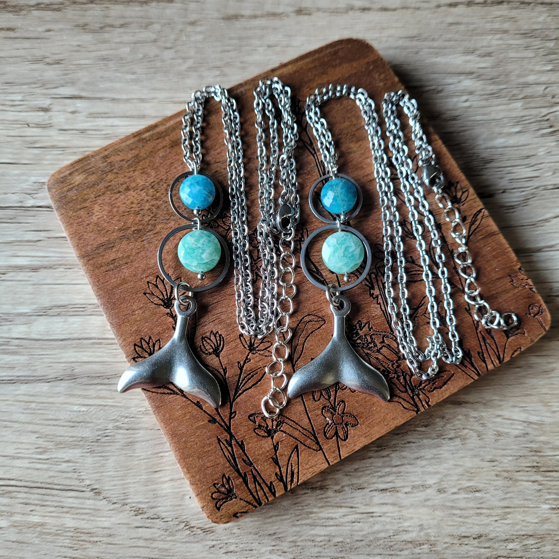 I created this stunning whale mermaid necklace with stainless steel chain, stainless steel hoops, and locally sourced Blue Apatite and Amazonite crystals!