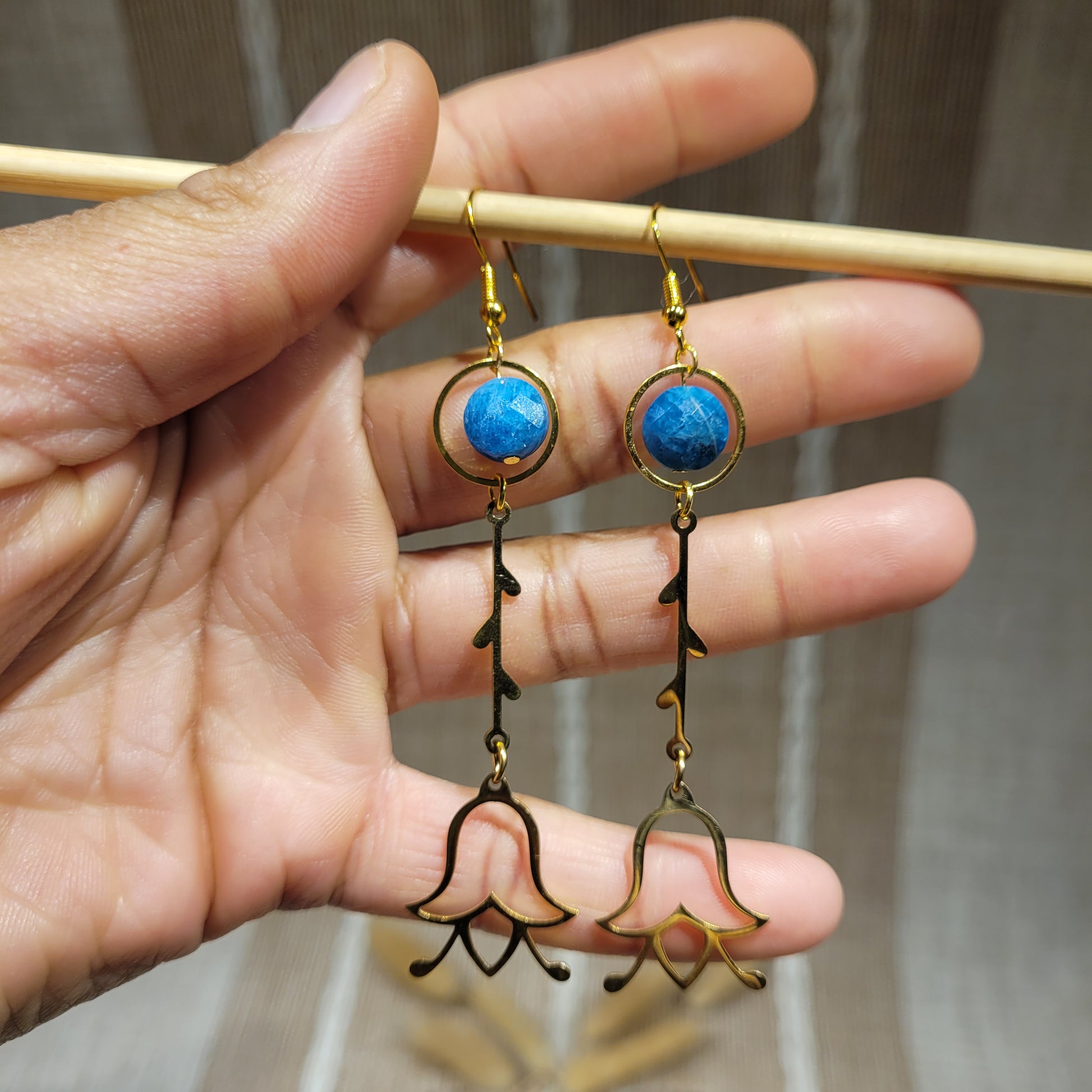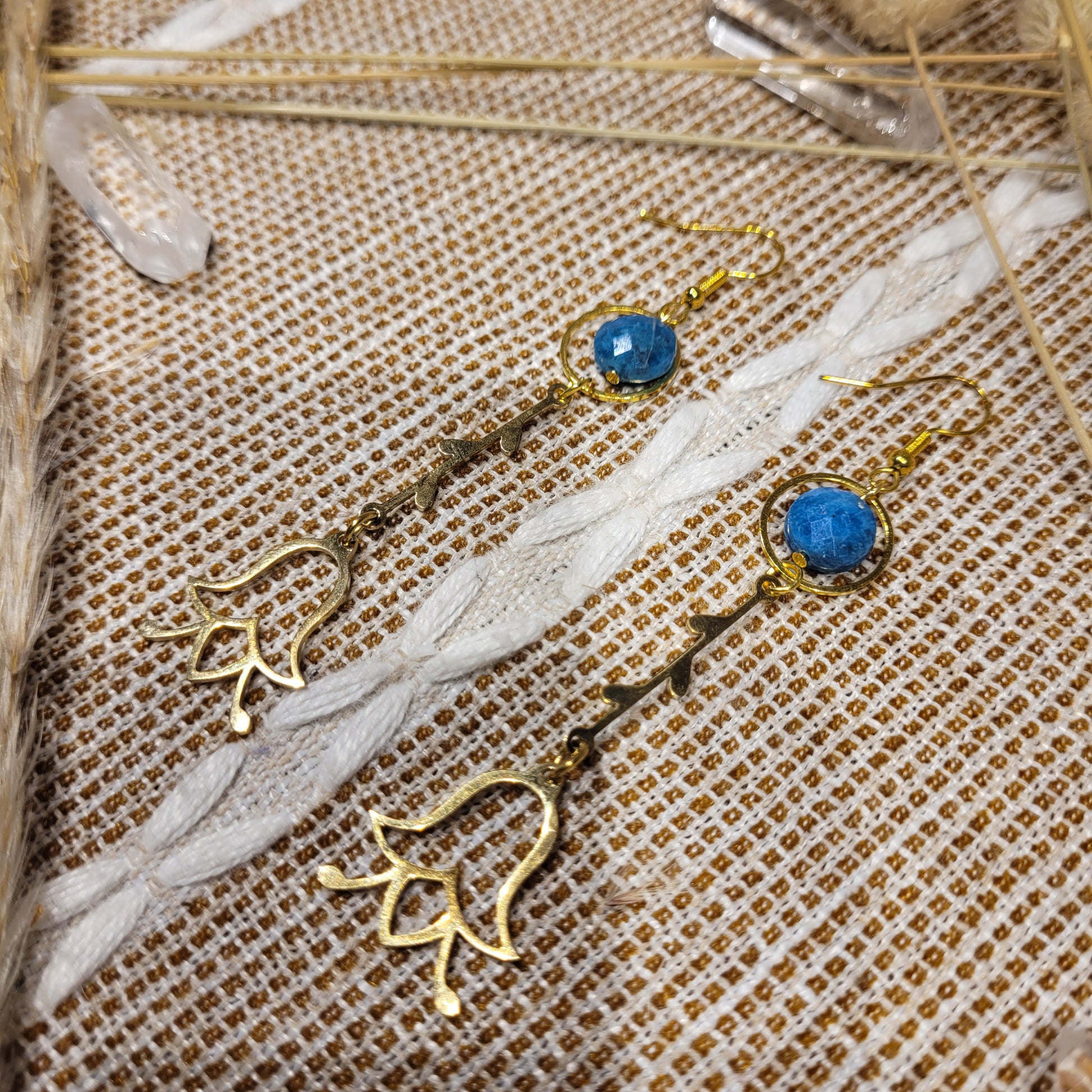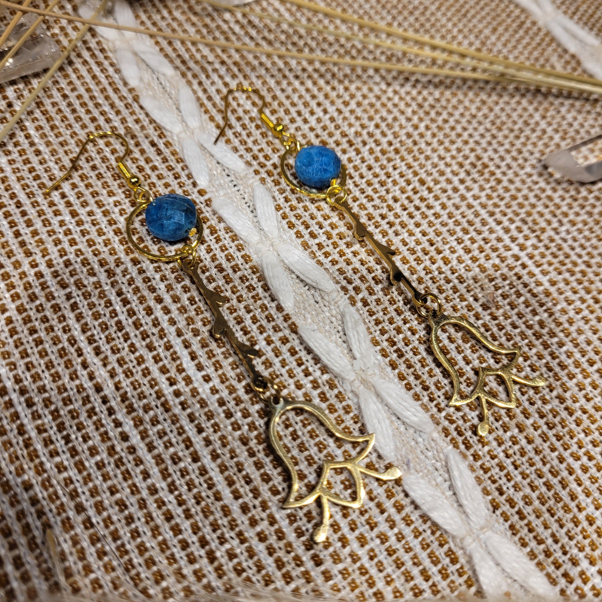 I created these Blue Apatite earrings with faceted Blue Apatite crystals, gold stainless steel floral charms, and with gold stainless steel hooks!