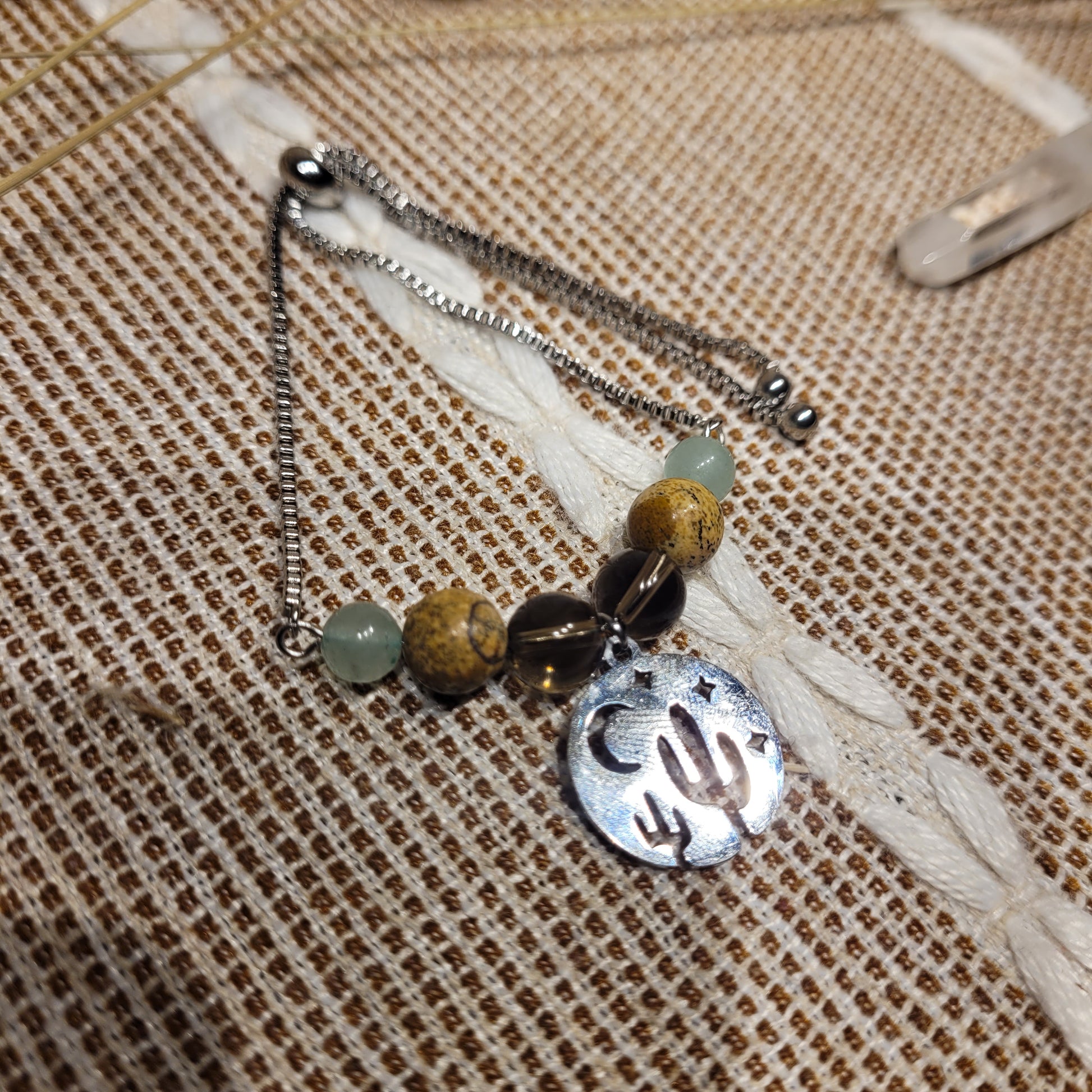 I made this Cactus Mixed Crystal Bracelet with high-quality Picture Jasper, Smoky Quartz, and Green Aventurine crystal beads, stainless steel Cactus desert scene charm, stainless steel pin, and stainless steel chain! It's giving root chakra healing vibes!