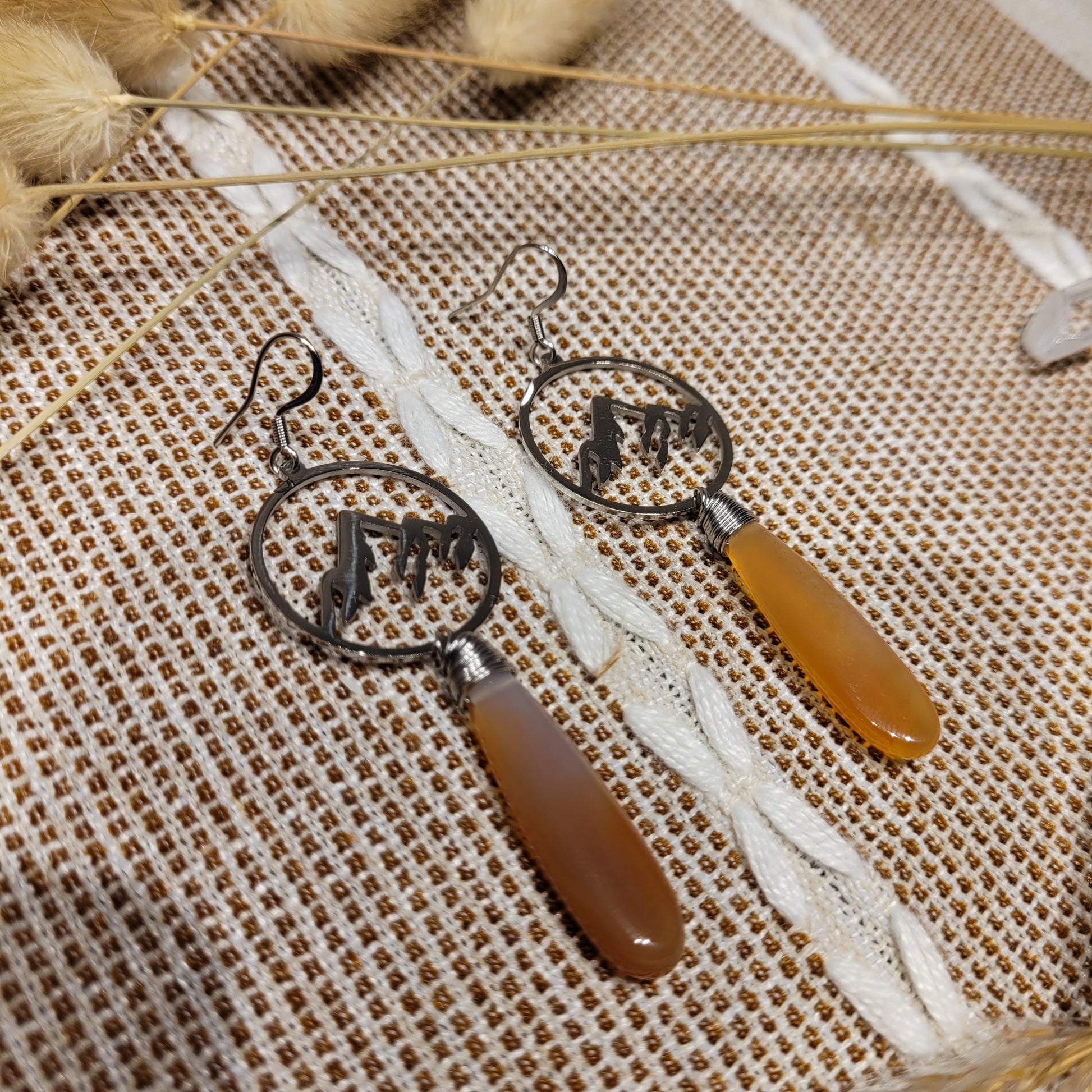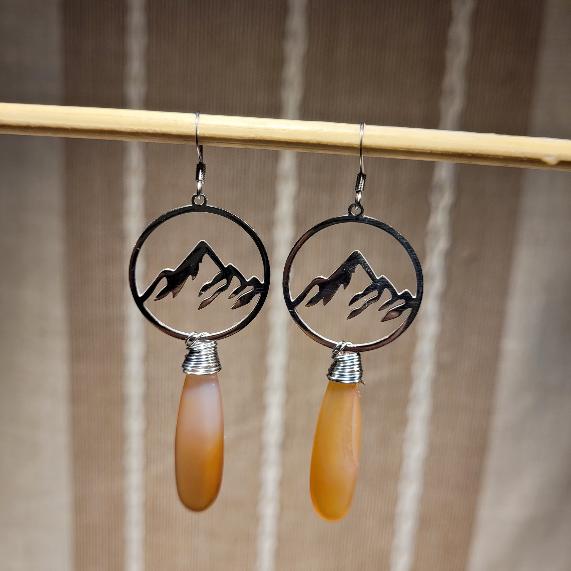I created these Carnelian Agate Earrings with stainless steel mountain charms, stainless steel hooks, and stainless steel wire wrapped Carnelian Agate crystal.