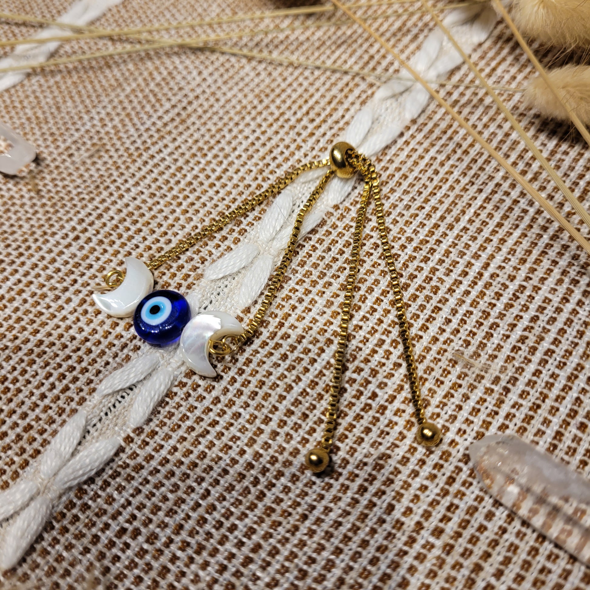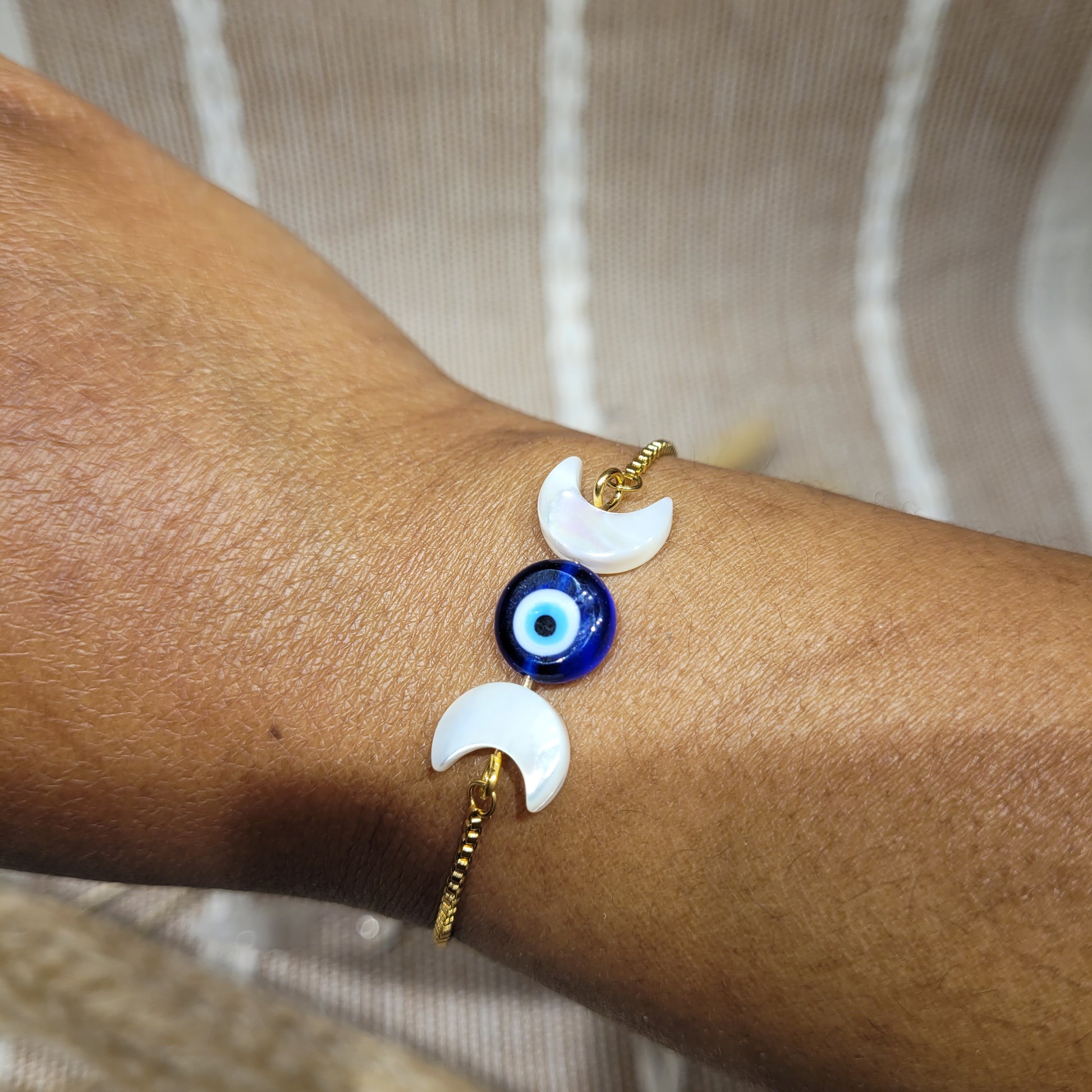 I made this Evil Eye Moon Bracelet with high-quality Mother of Pearl moon bead charms, glass Evil Eye bead charm, brass pin, and gold plated stainless steel chain!