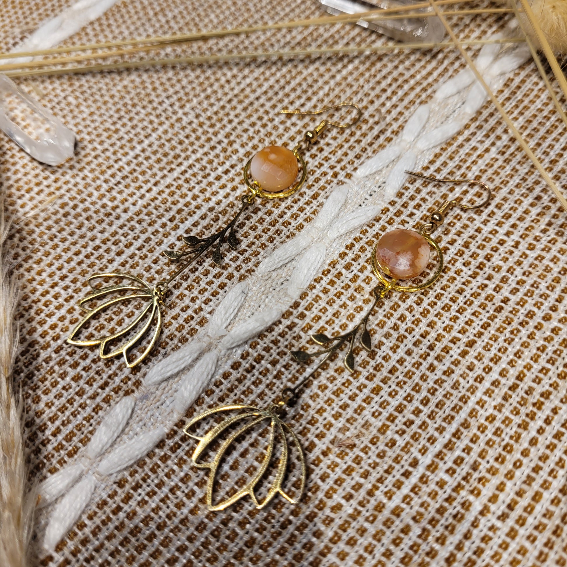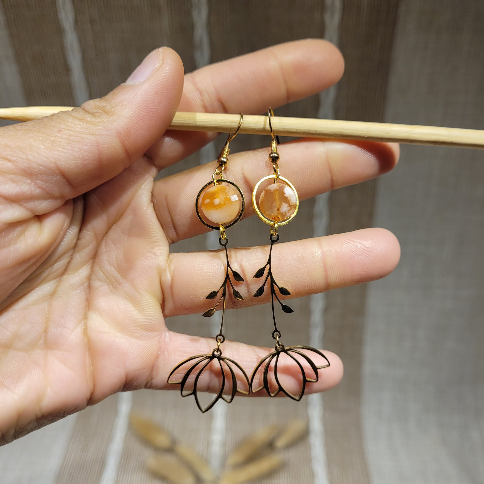 I created these Flower Agate earrings with Flower Agate crystals, gold stainless steel floral charms, and with gold stainless steel hooks!