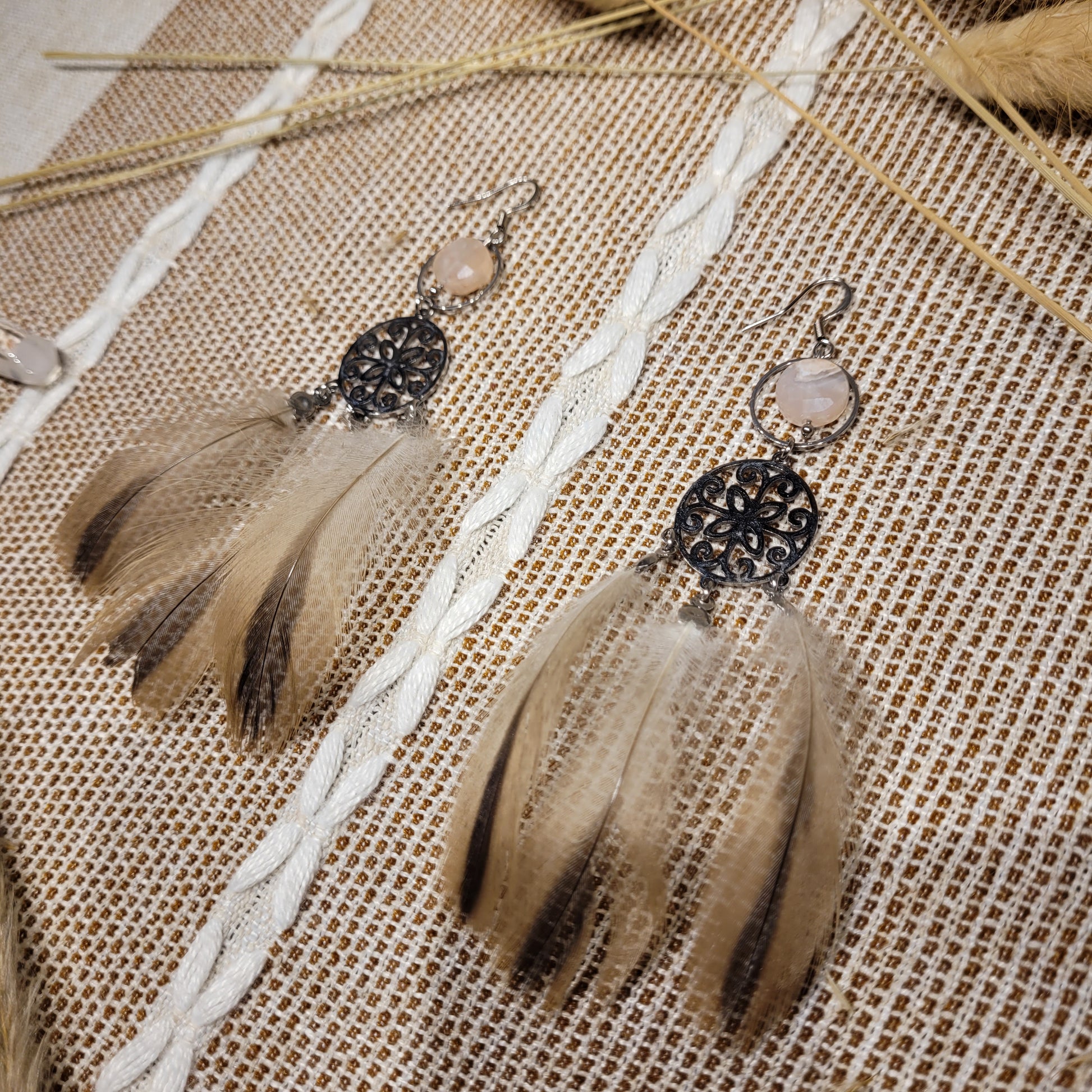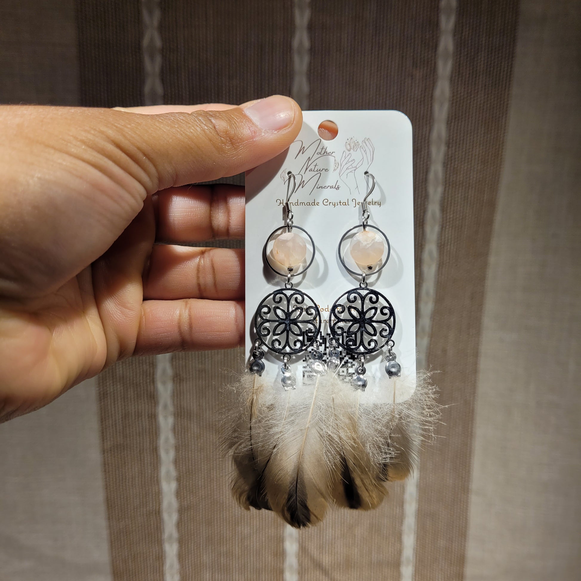 I created these lovely Flower Agate Earrings with ethically sourced phesant feathers and high quality Flower Agate beads, stainless steel mandala charms, and high quality stainless steel!