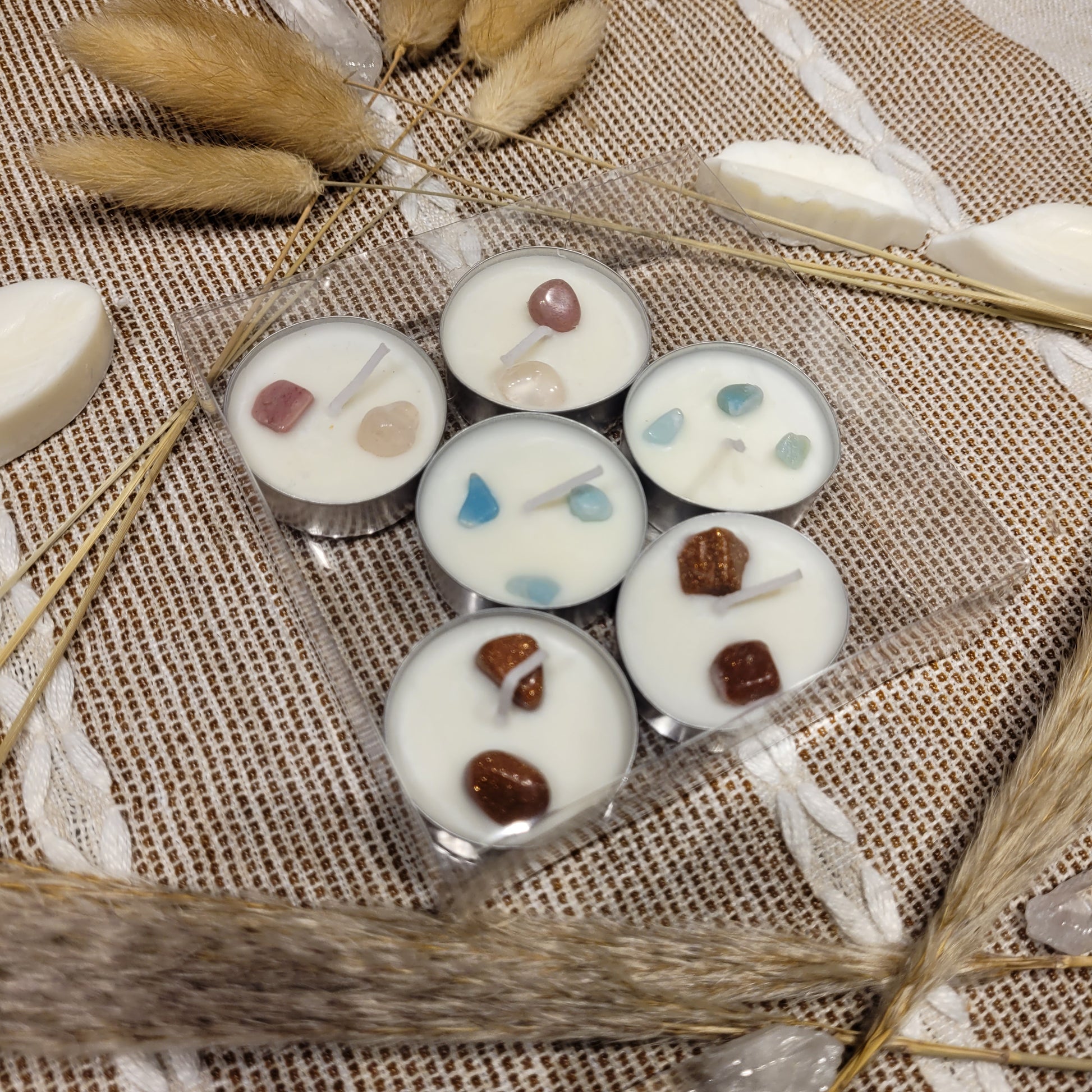 Handmade soy candles created with high quality, clean burning fragrance oil, cotton wick, and decorated with high-quality crystals on top!