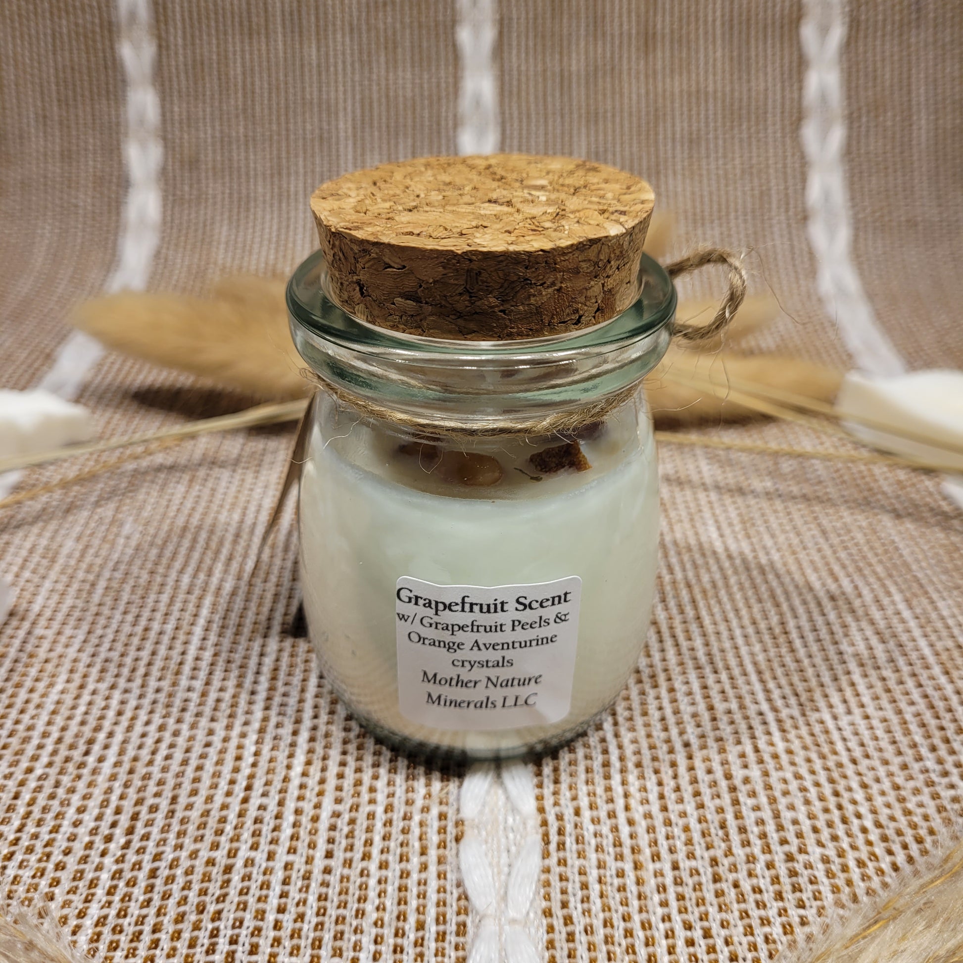 This candle has a lovely Grapefruit scent and decorated with Grapefruit peels and Orange Aventurine Crystal chips on top!
