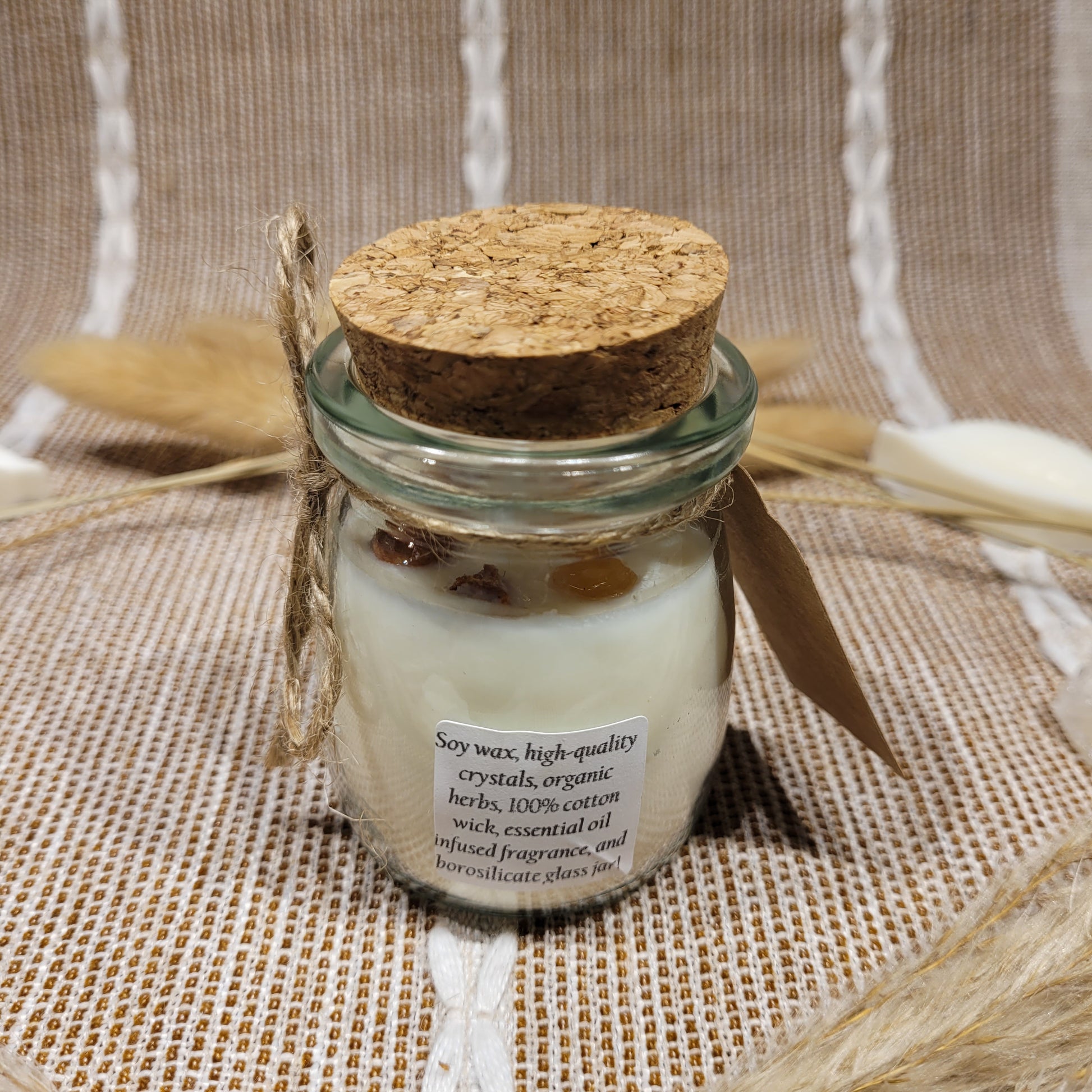 Handmade soy candles created with high-quality clean burning essential oil infused fragrance, 100% cotton wick, lead free borosilicate glass jar, decorated with organic dried herbs and ethically sourced crystals in a 3.4 oz Jar. Plus there is a hidden crystal on the bottom!