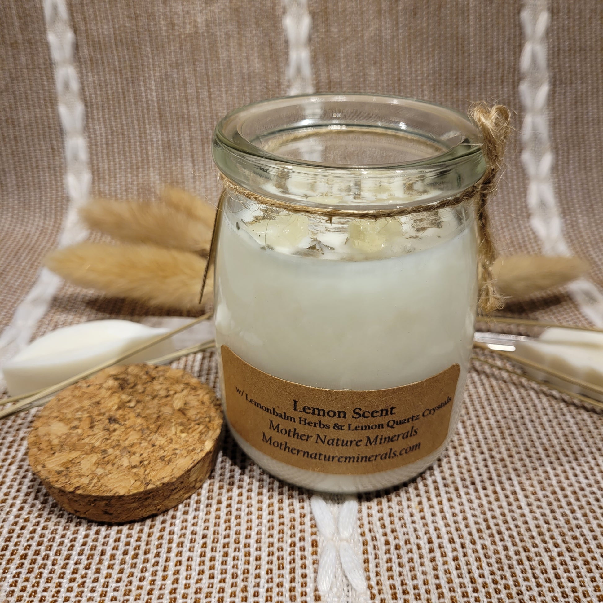 This candle has a lovely Lemon scent and is decorated with Lemon balm herbs and Lemon Quartz Crystal chips on top!