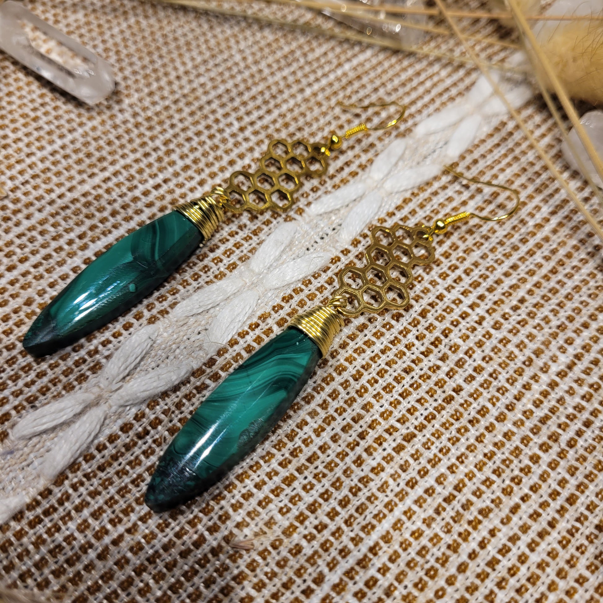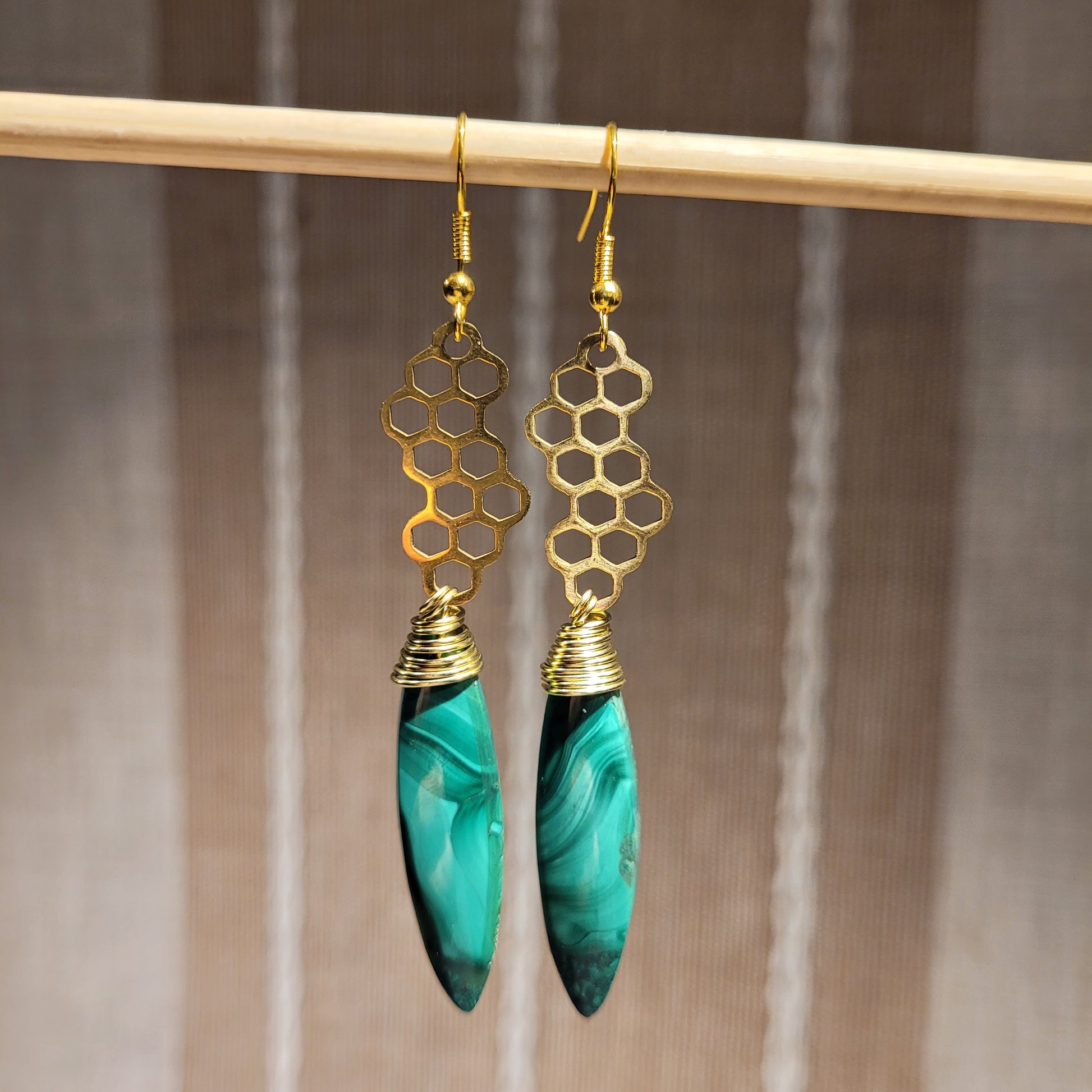 I created these Malachite earrings with Malachite crystals, gold stainless steel honeycomb charms, brass wire wrap, and with gold stainless steel hooks!
