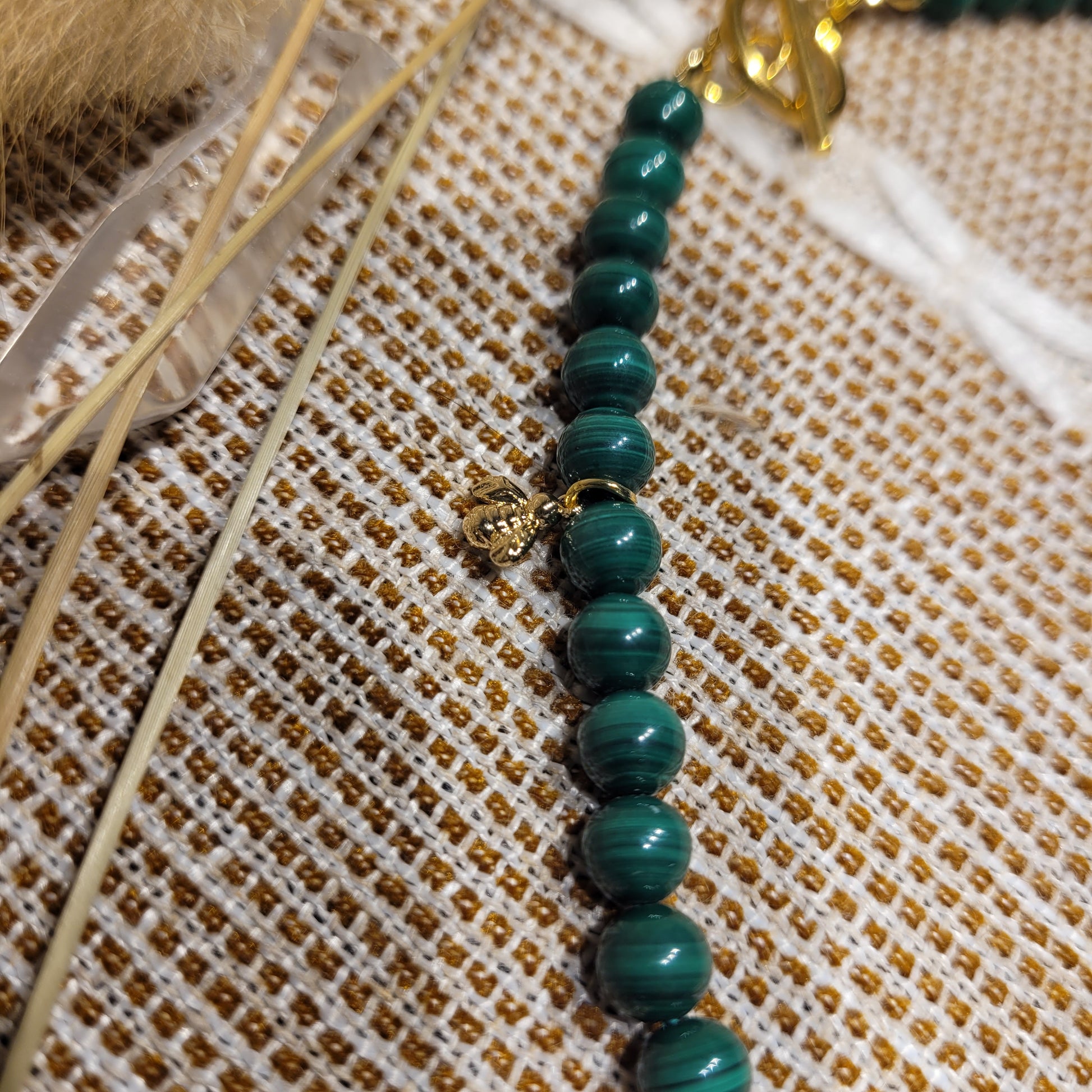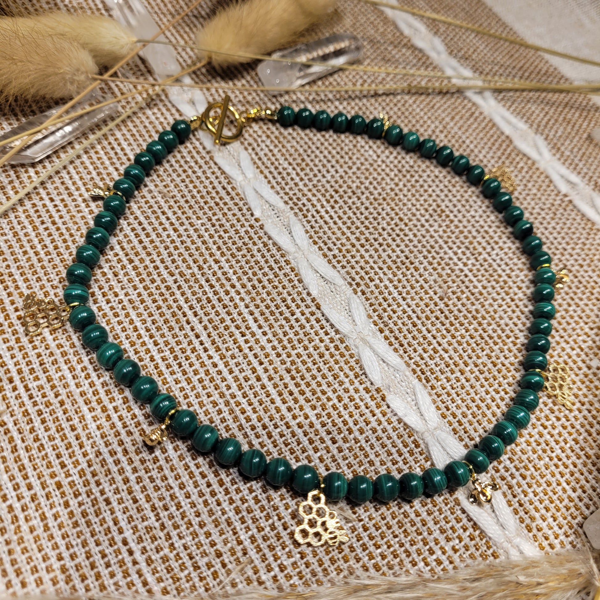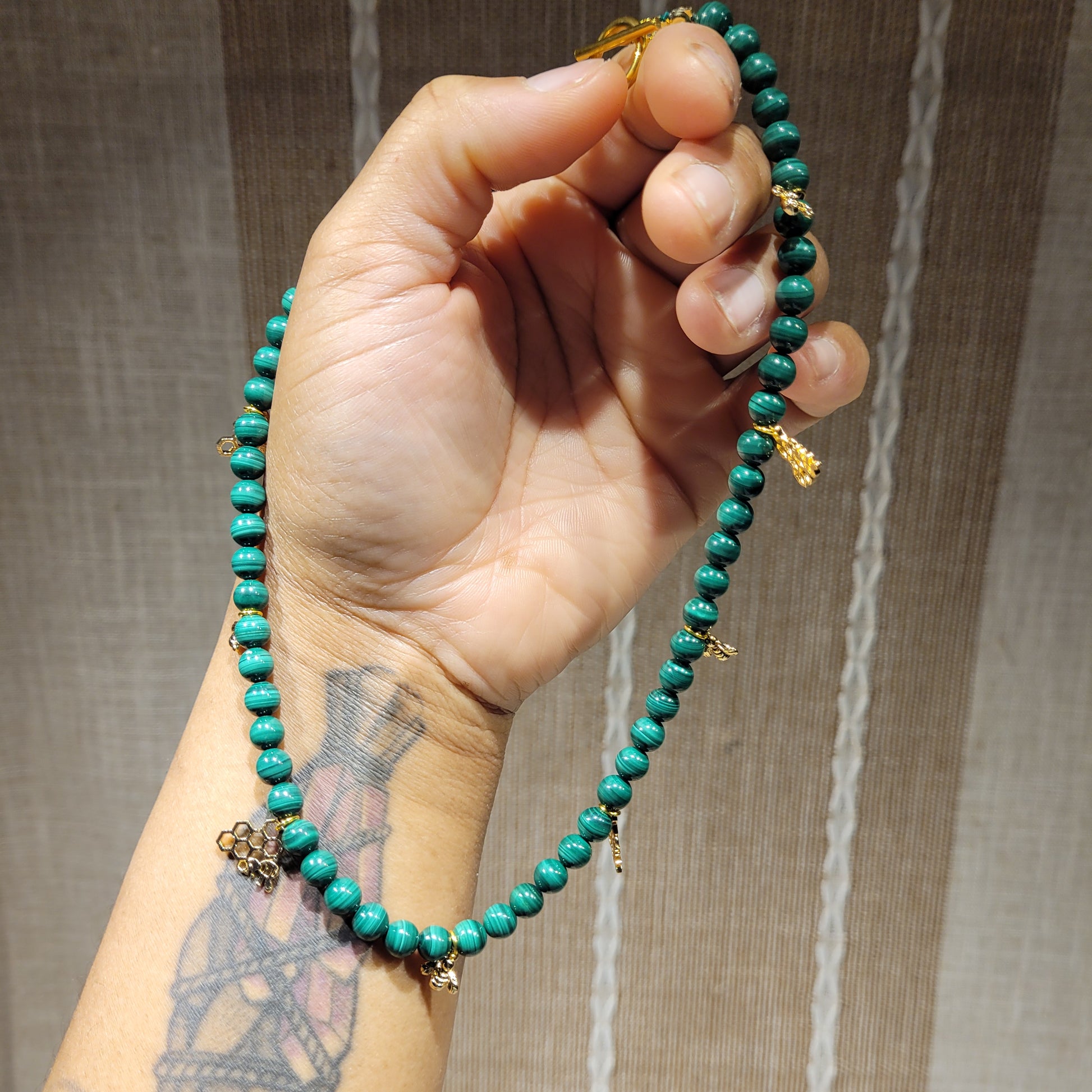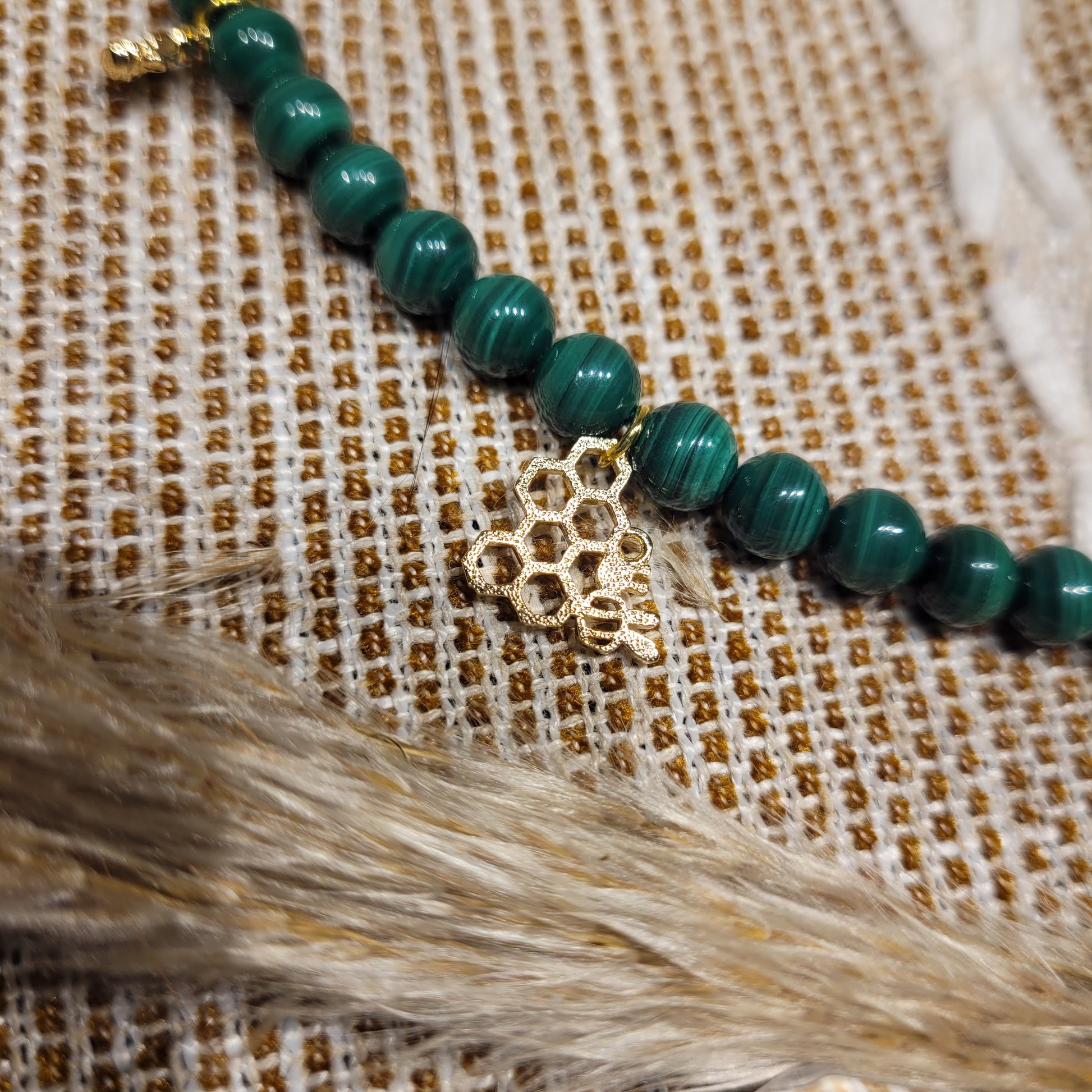 I created this stunning Malachite Necklace with 18k gold plated metal bees and honeycomb charms, 100% natural silk cord, gold stainless steel toggle clasp, and Malachite crystals! Stunning choker/collar bone length!