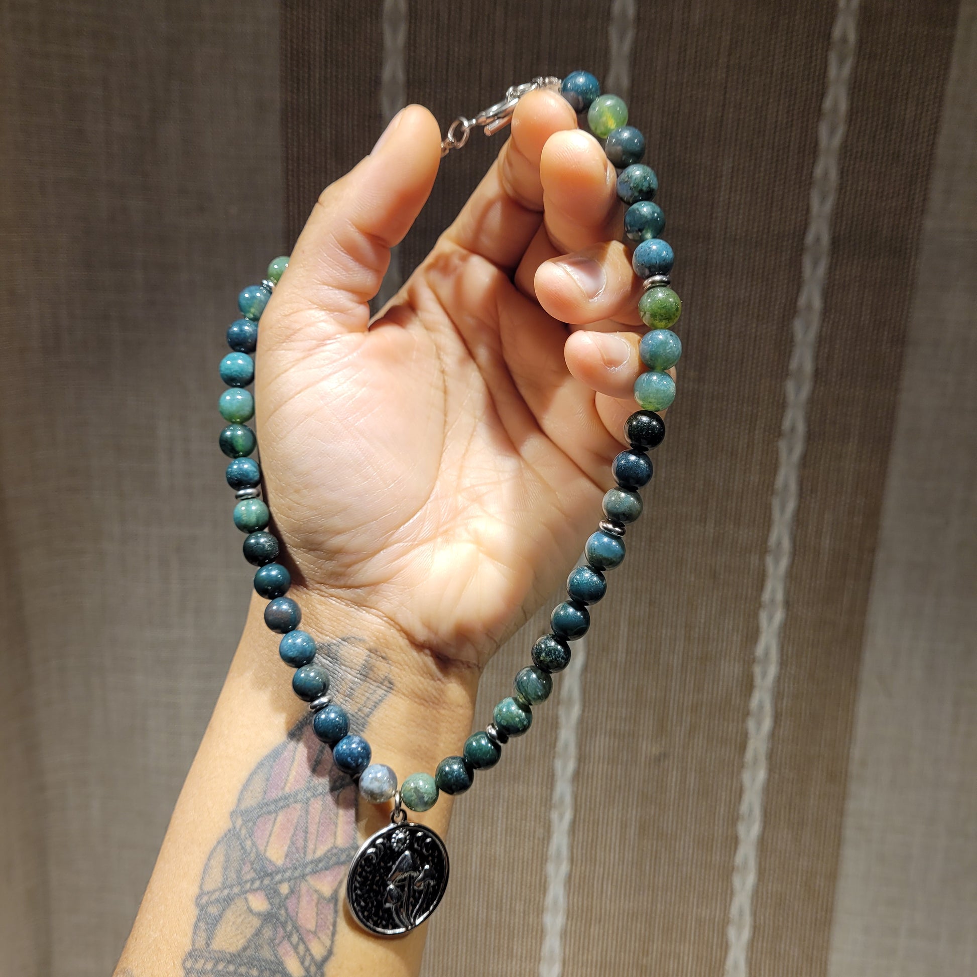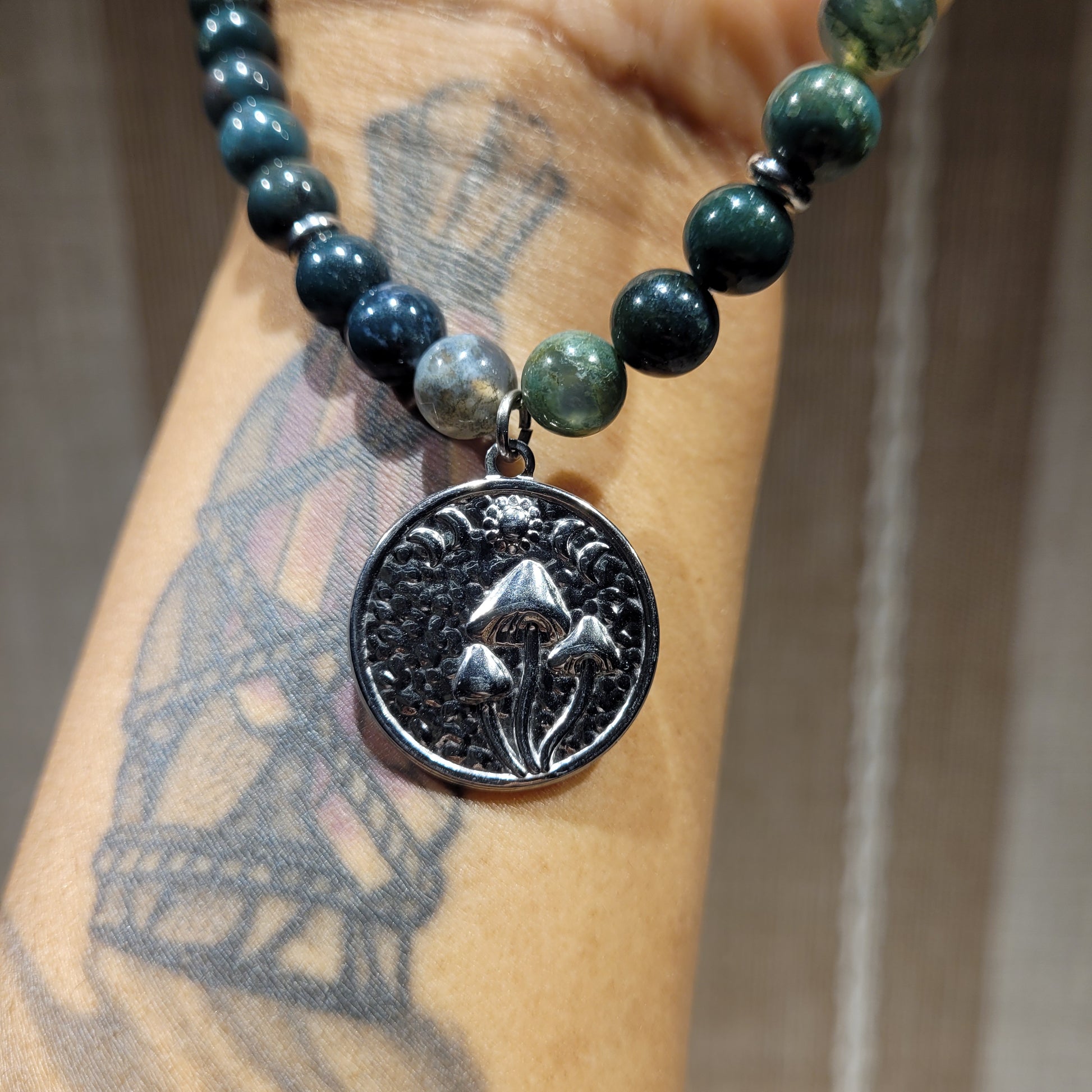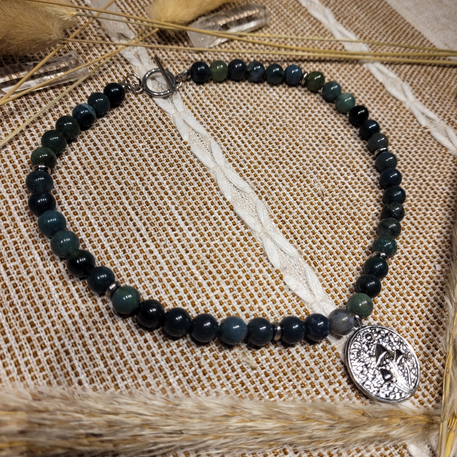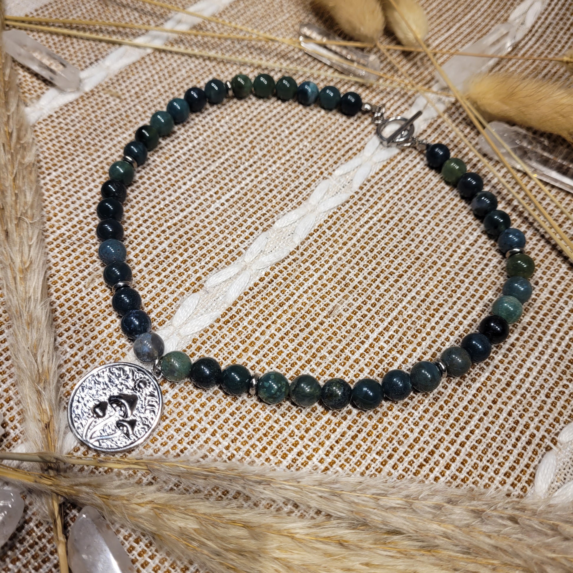 I created this stunning Moss Agate Necklace with a stainless steel mushroom moon phase pendant, stainless steel spacer beads, 100% natural silk cord, stainless steel toggle clasp, aand Moss Agate and Indian Agate crystals! Stunning choker/collar bone length!