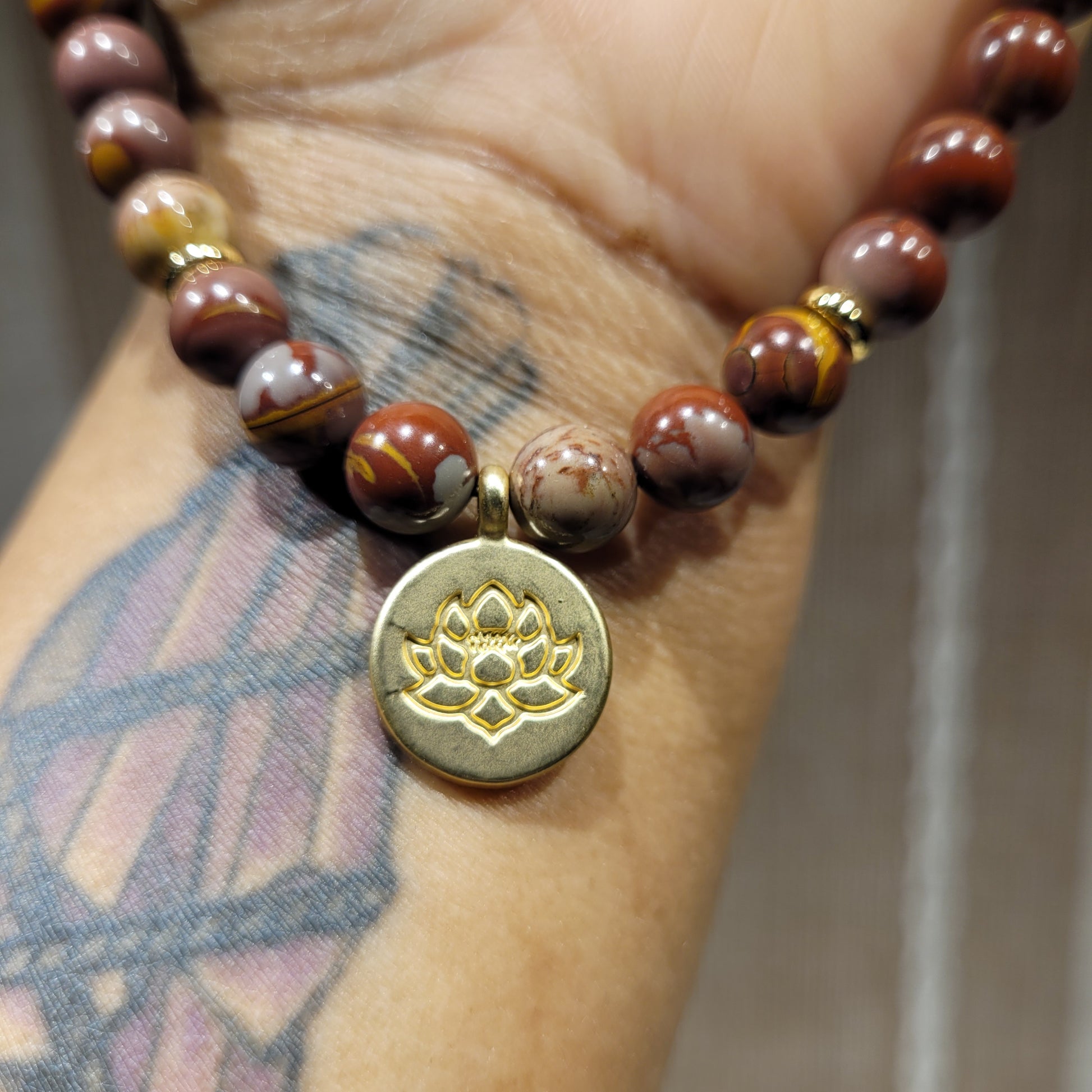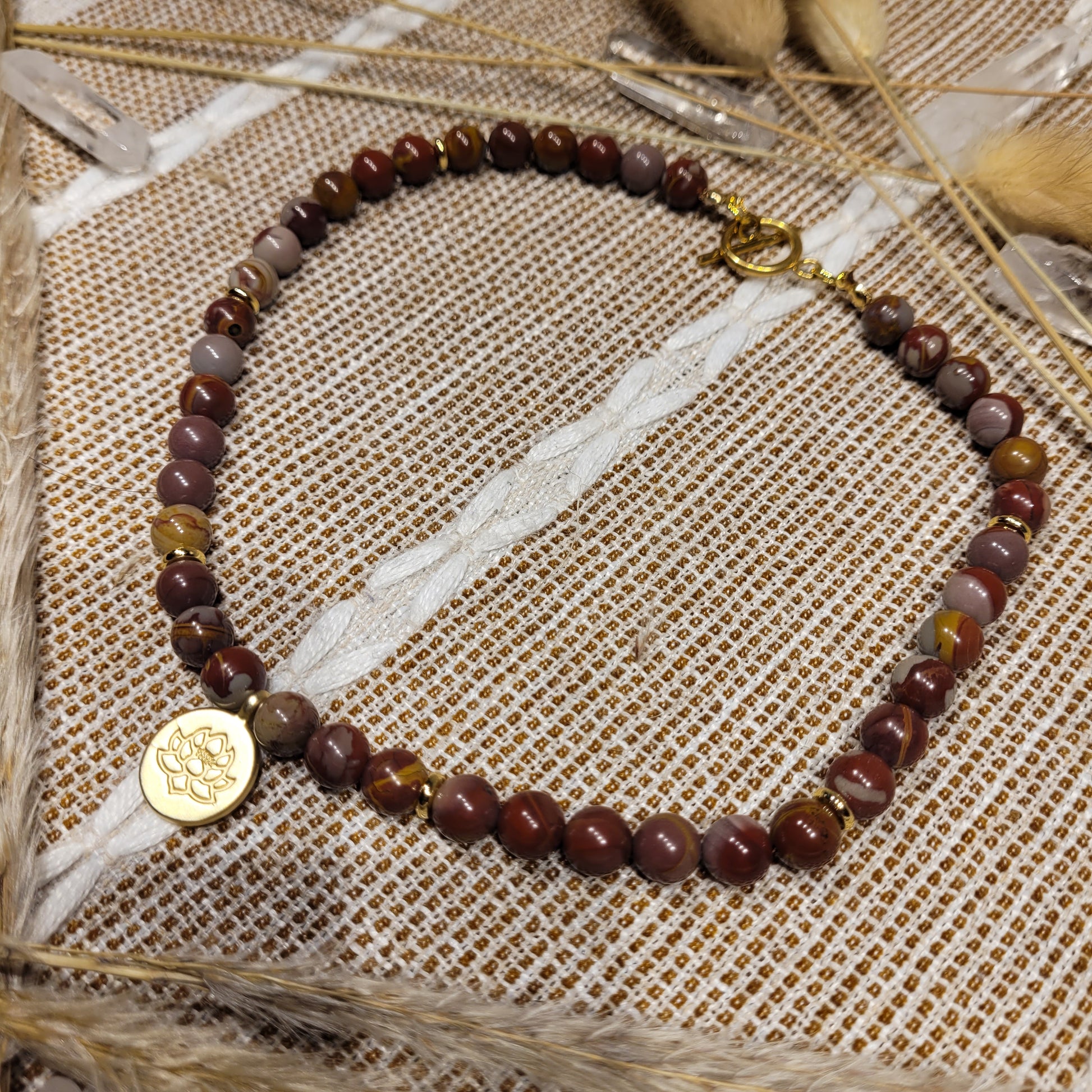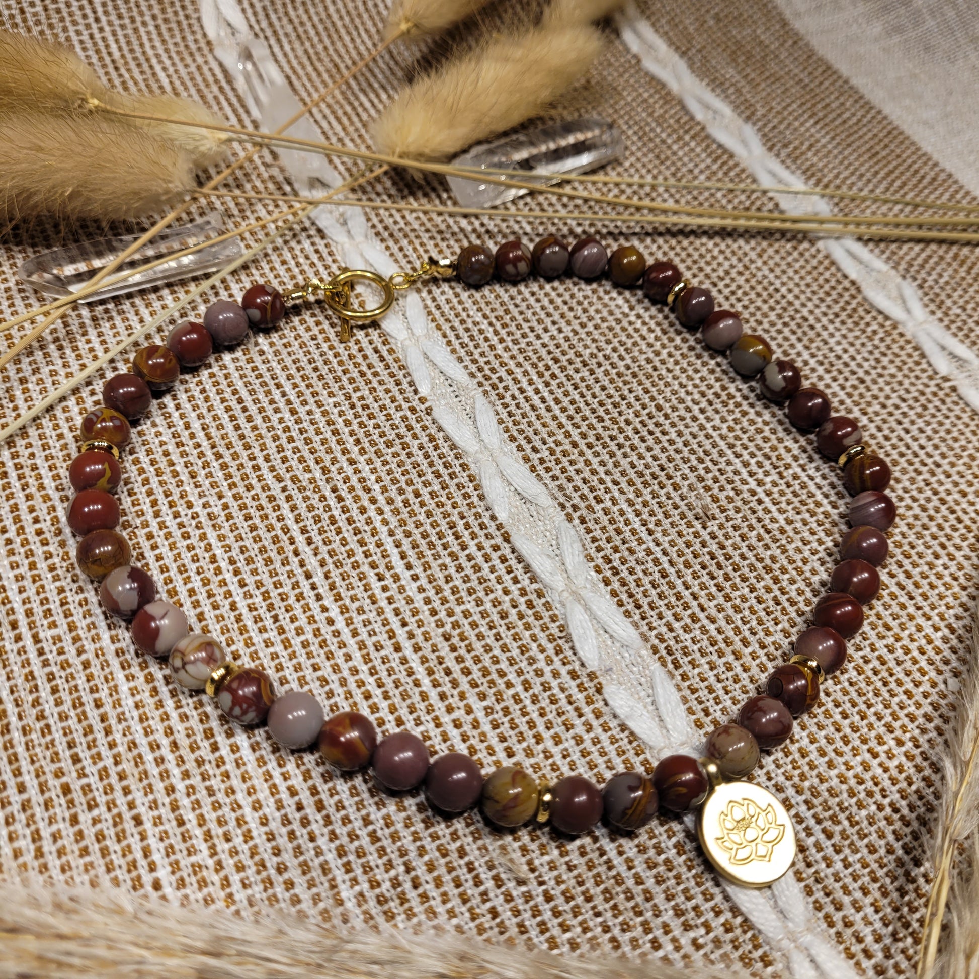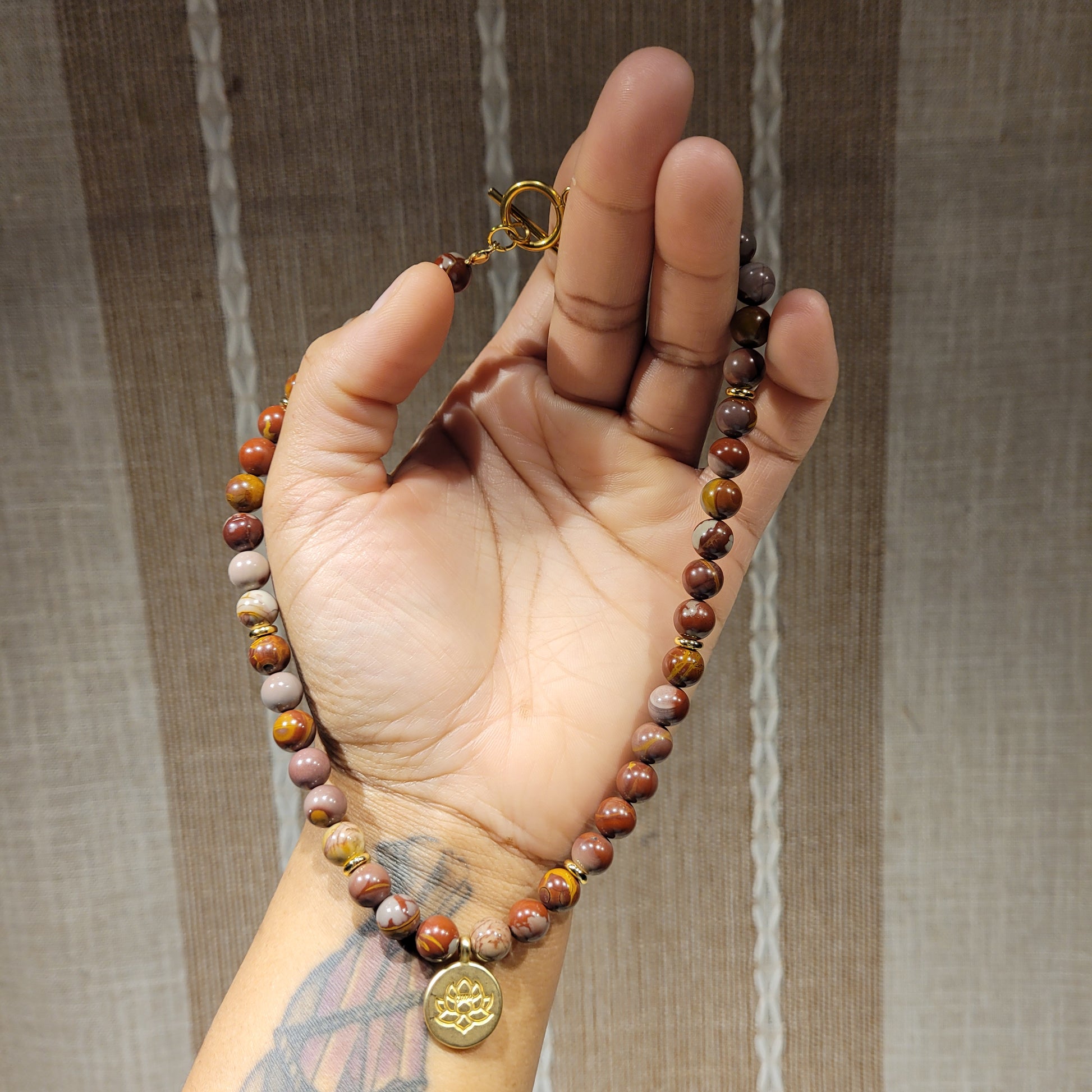 I created this stunning Noreena Jasper Necklace with a 18k gold plated metal lotus pendant, gold stainless steel spacer beads, 100% natural silk cord, gold stainless steel toggle clasp, aand Noreena Jasper crystals! Stunning choker/collar bone length!