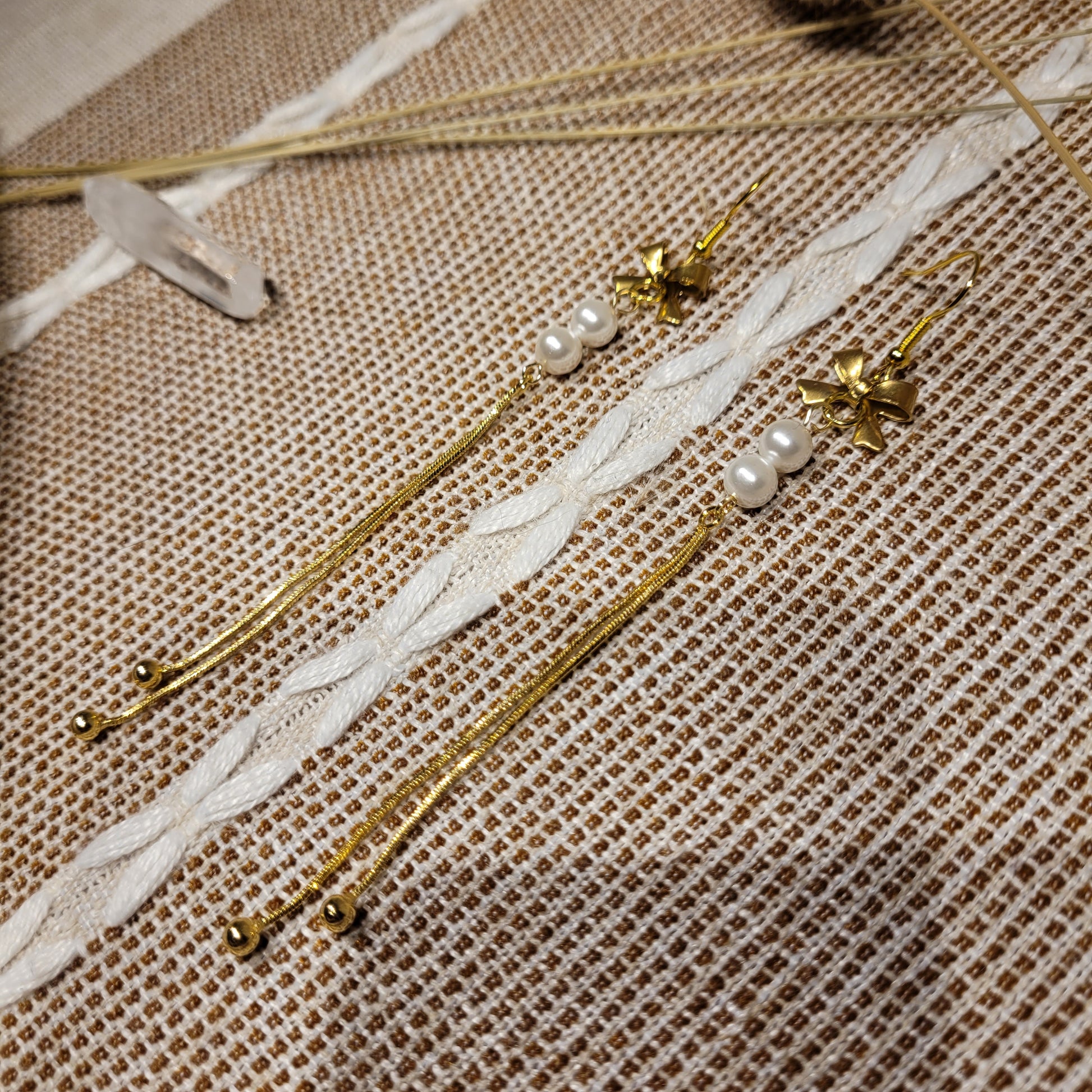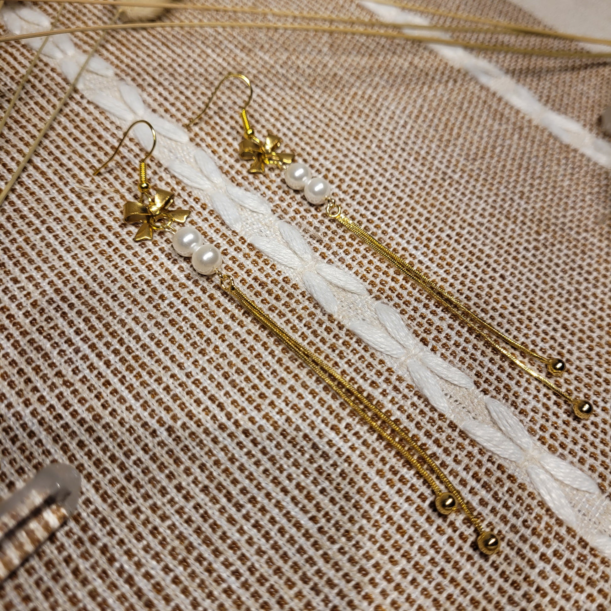 I created these lovely Freshwater Pearl Earrings with high quality Freshwater Pearl crystal beads, gold stainless steel bow and fringe charms, and gold plated steel hooks!
