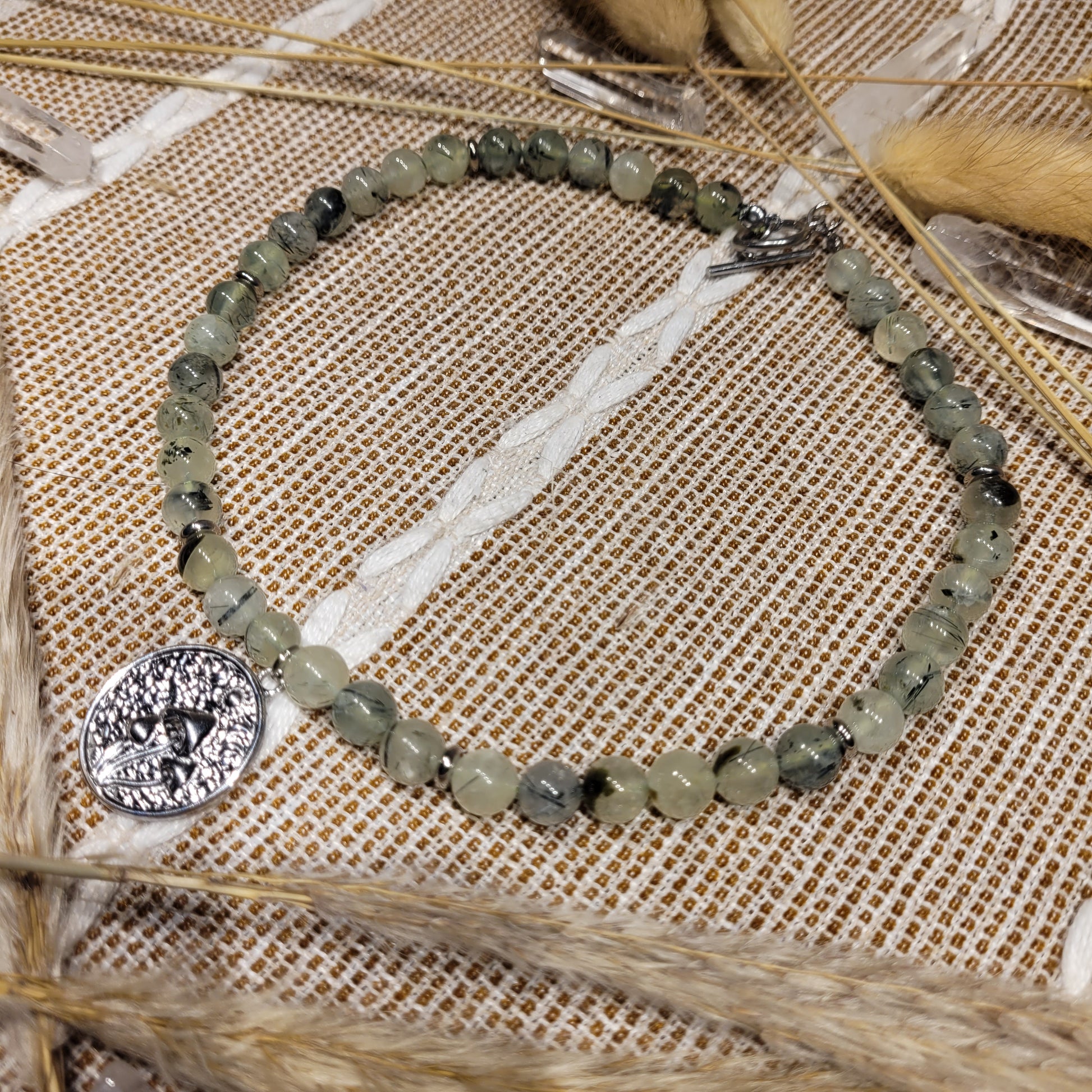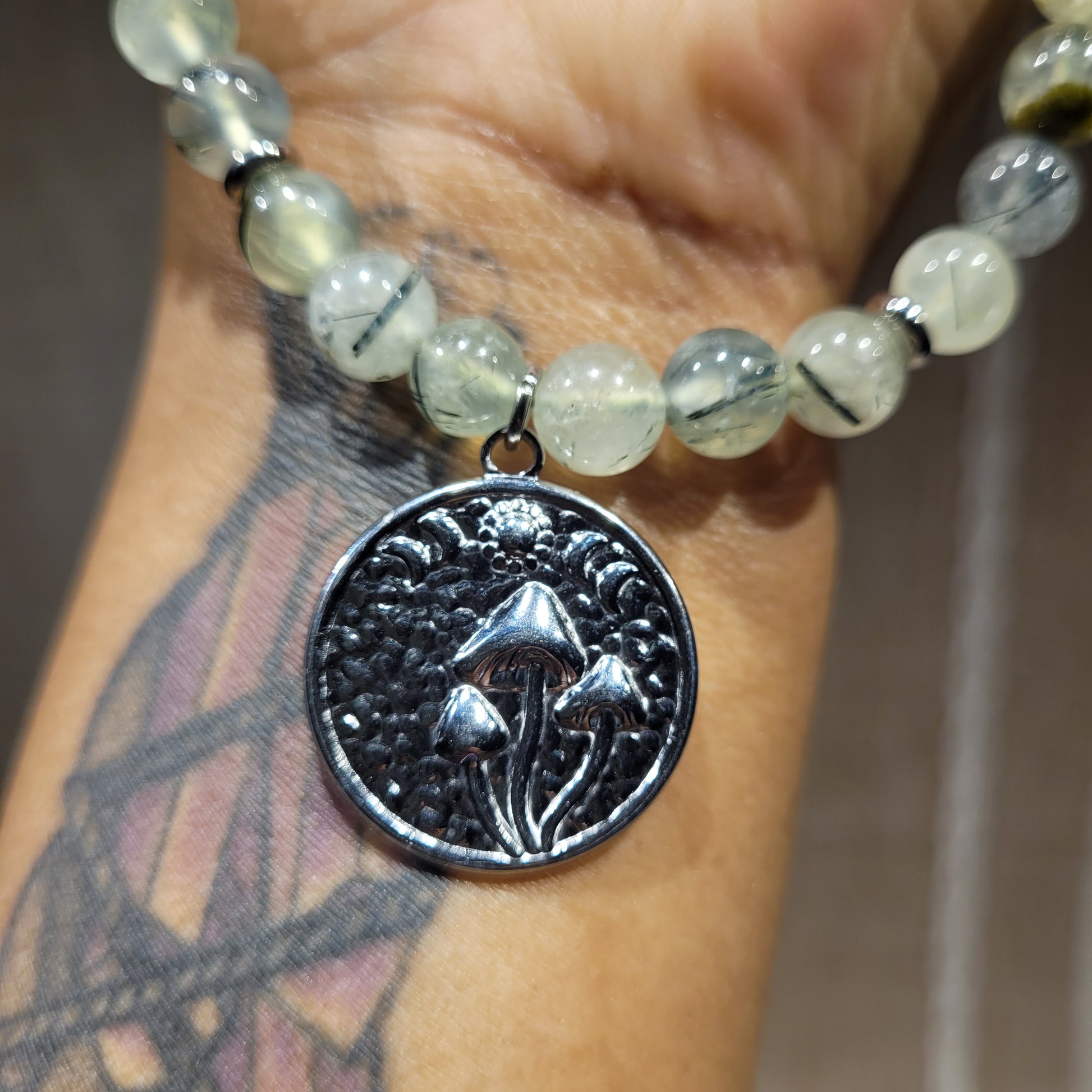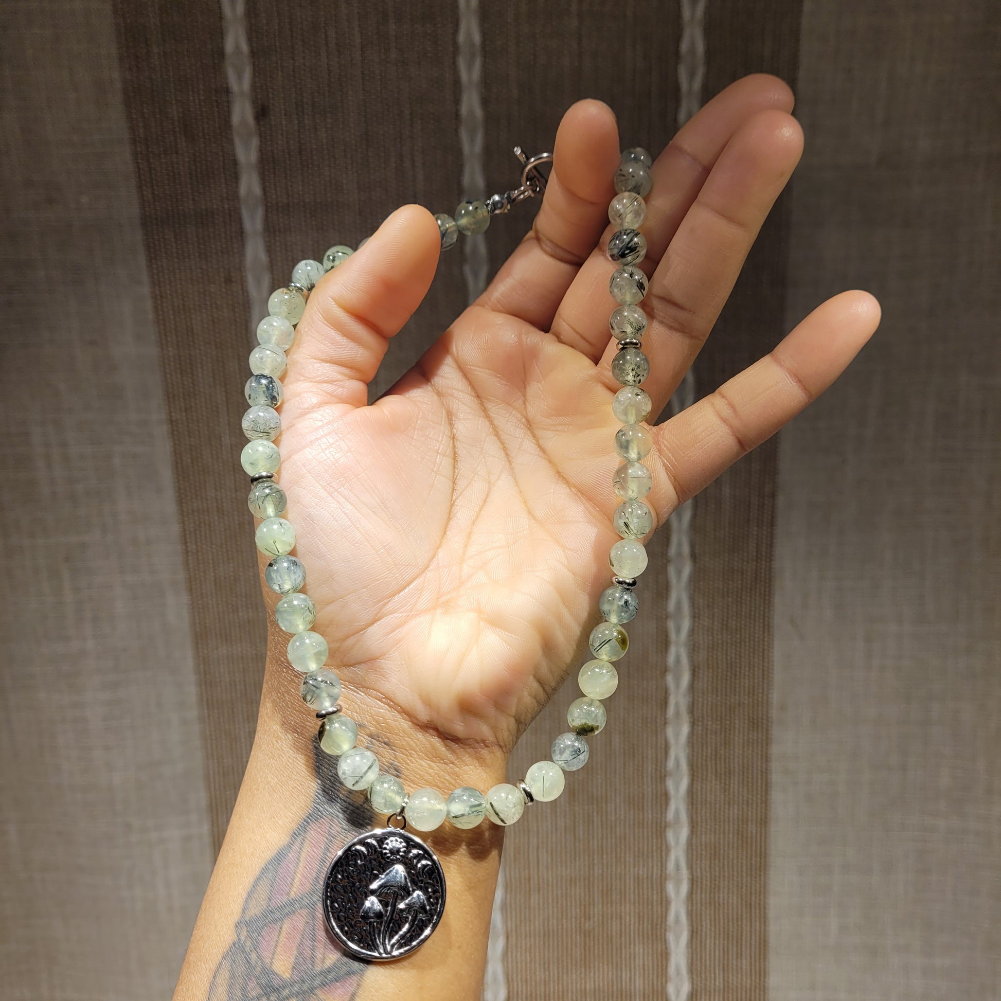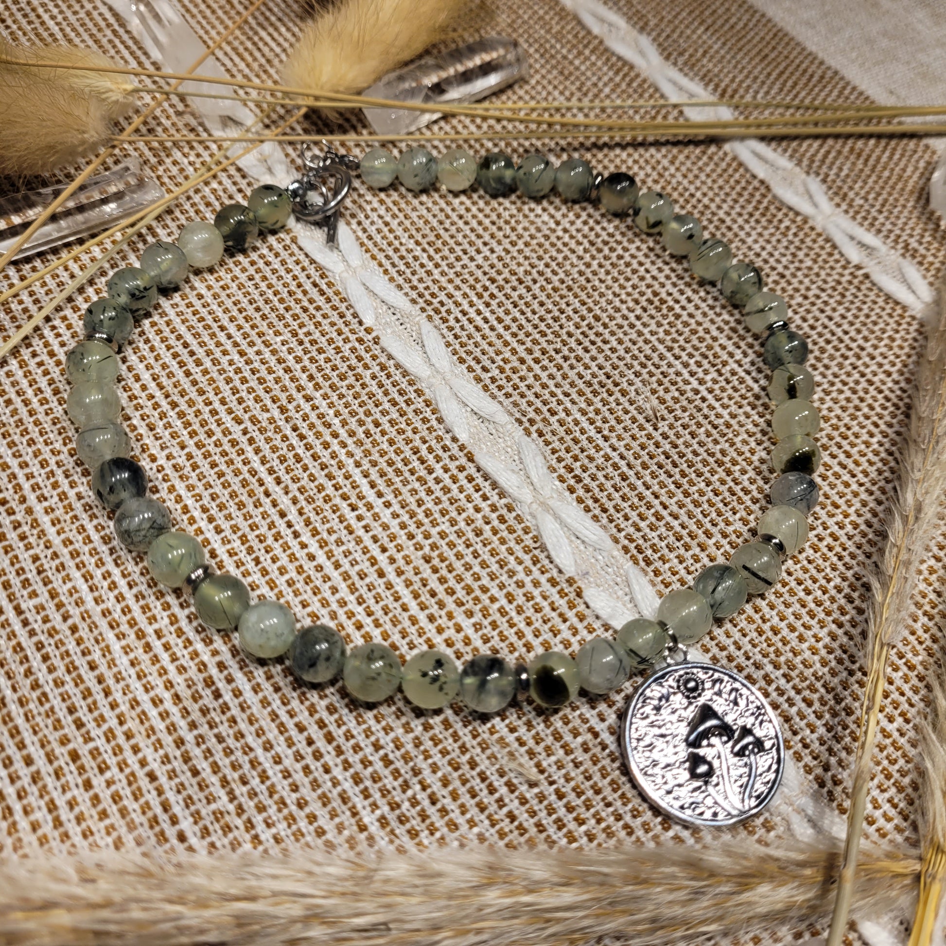 I created this stunning Prehnite Necklace withstainless steel mushroom moon phase pendant, stainless steel spacer beads, 100% natural silk cord,  stainless steel toggle clasp, aand Prehnite crystals! Stunning choker/collar bone length!