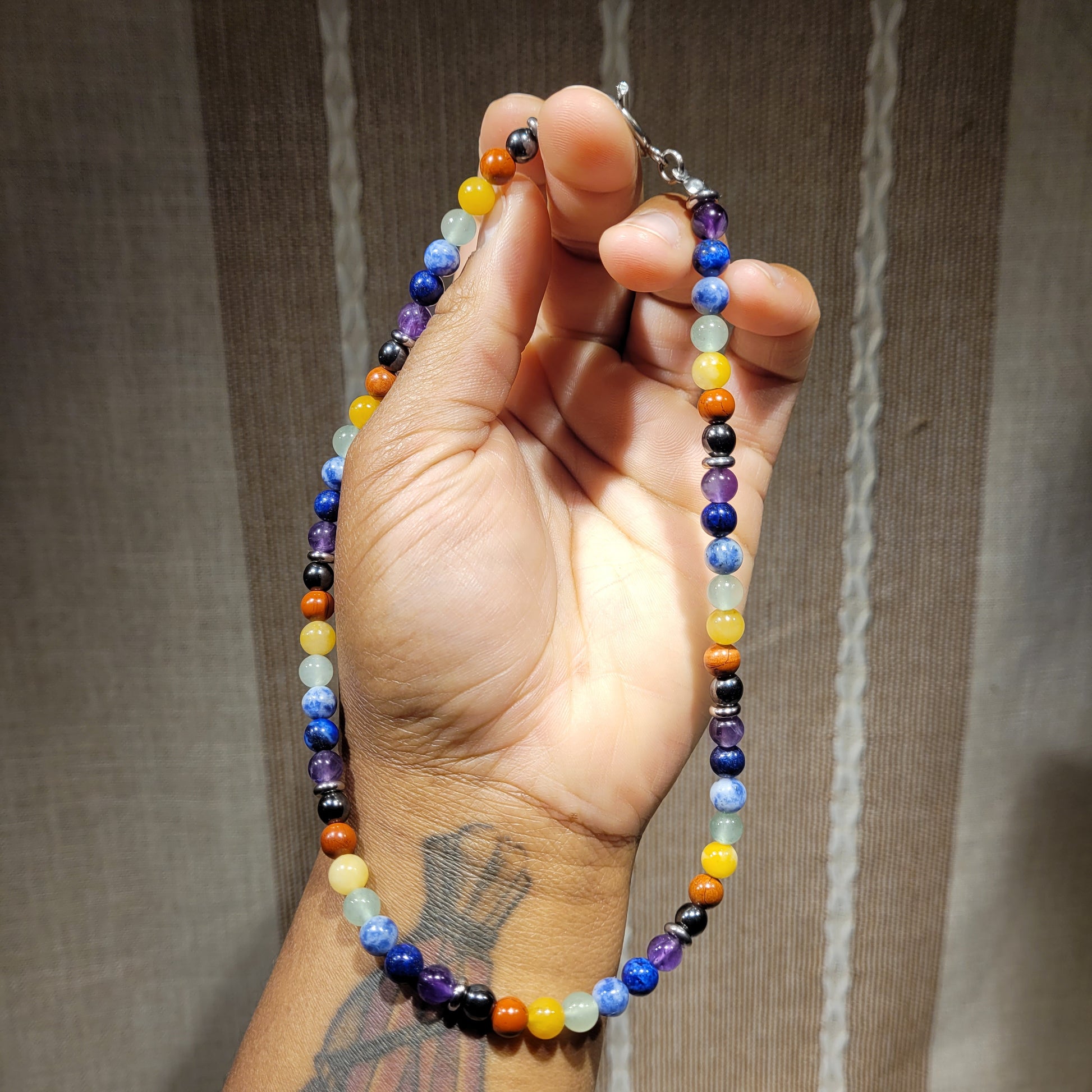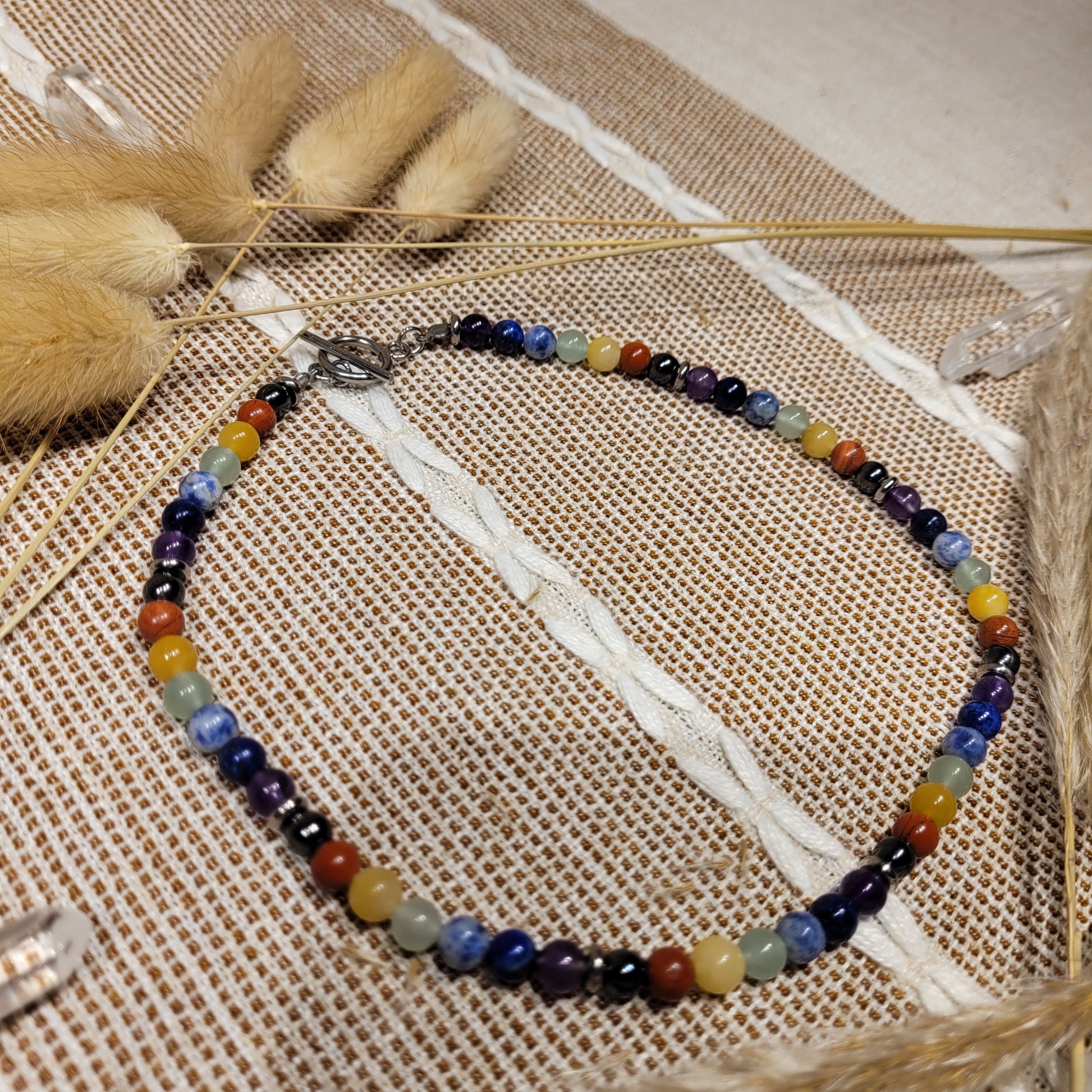 I created this stunning Pride Chakra Rainbkw Necklace with stainless steel rondelle charms, 100% natural white silk cord, stainless steel toggle clasp, and Chakra crystal beads (hematite, red jasper, yellow Aventurine, green aventurine, blue dot jasper, Lapis Lazuli, and amethyst)! Stunning choker/collar bone length!