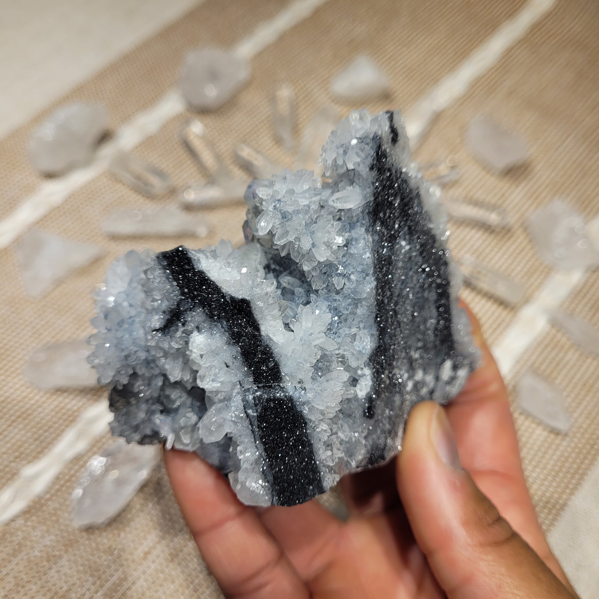 Amazing formation of Quartz, Fluorite, Calcite, and Black Chalcedony in a cluster! Weighs approximately 265g.