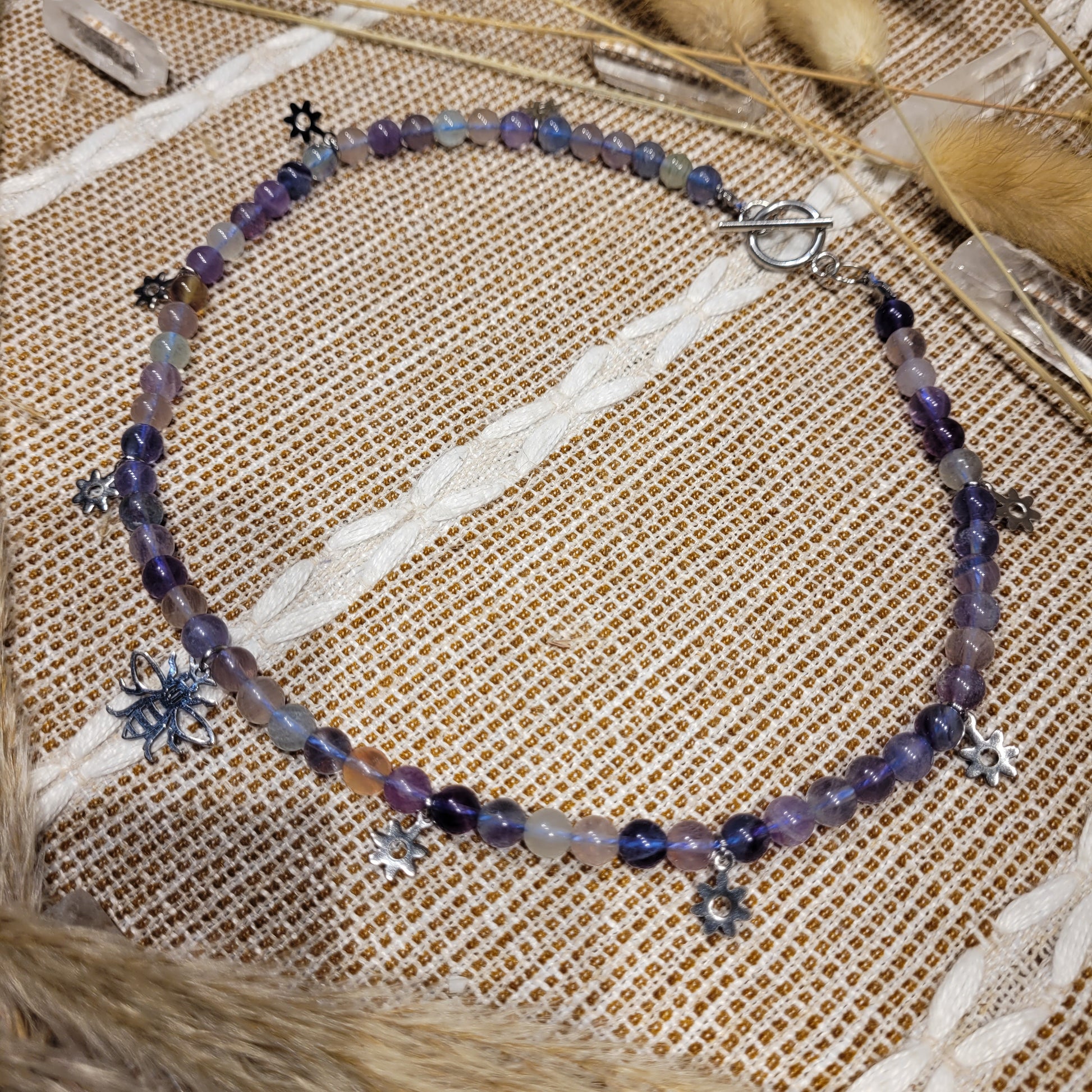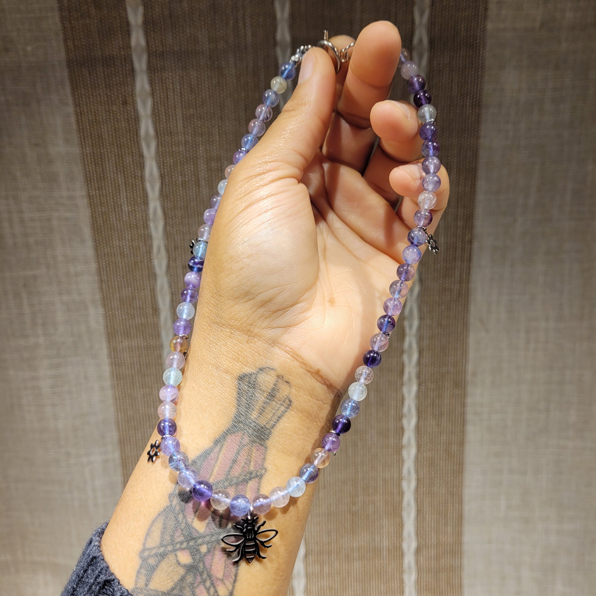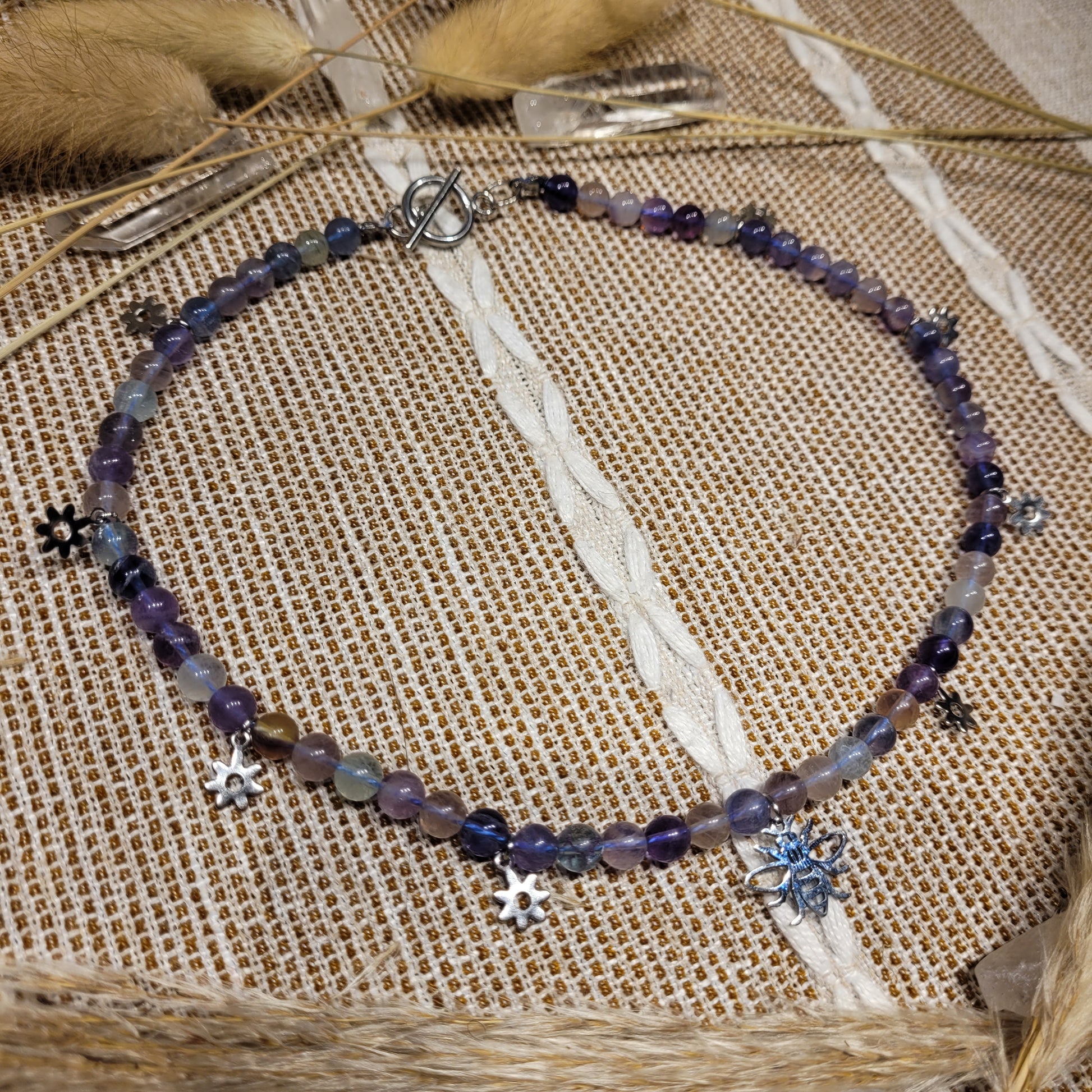 I created this stunning Rainbow Fluorite Necklace with stainless steel bees and flower charms, 100% natural silk cord, stainless steel toggle clasp, and Rainbow Fluorite crystals! Stunning choker/collar bone length!