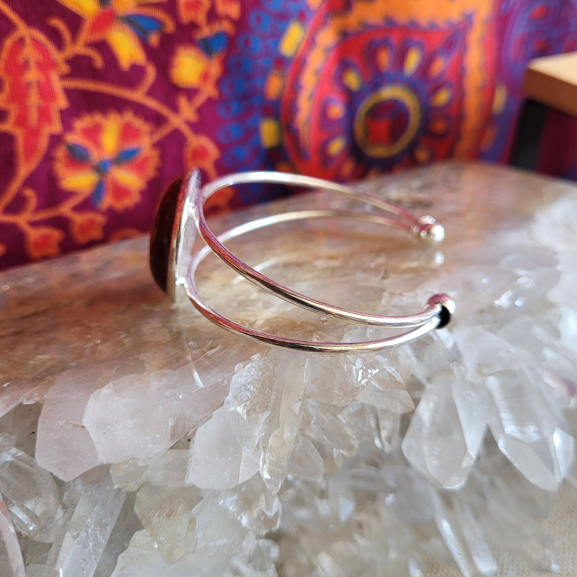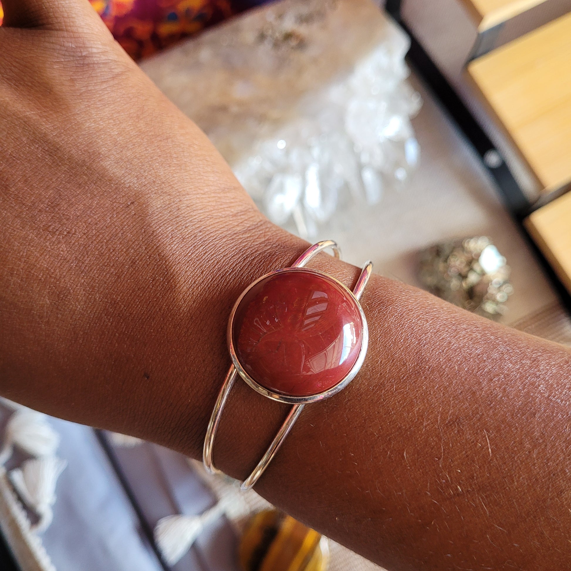 I created this Red Jasper cuff Bracelet  made with brass silver color electroplating and a large statement Red Jasper crystal. Adjustable too! Gently open up to desired fit.