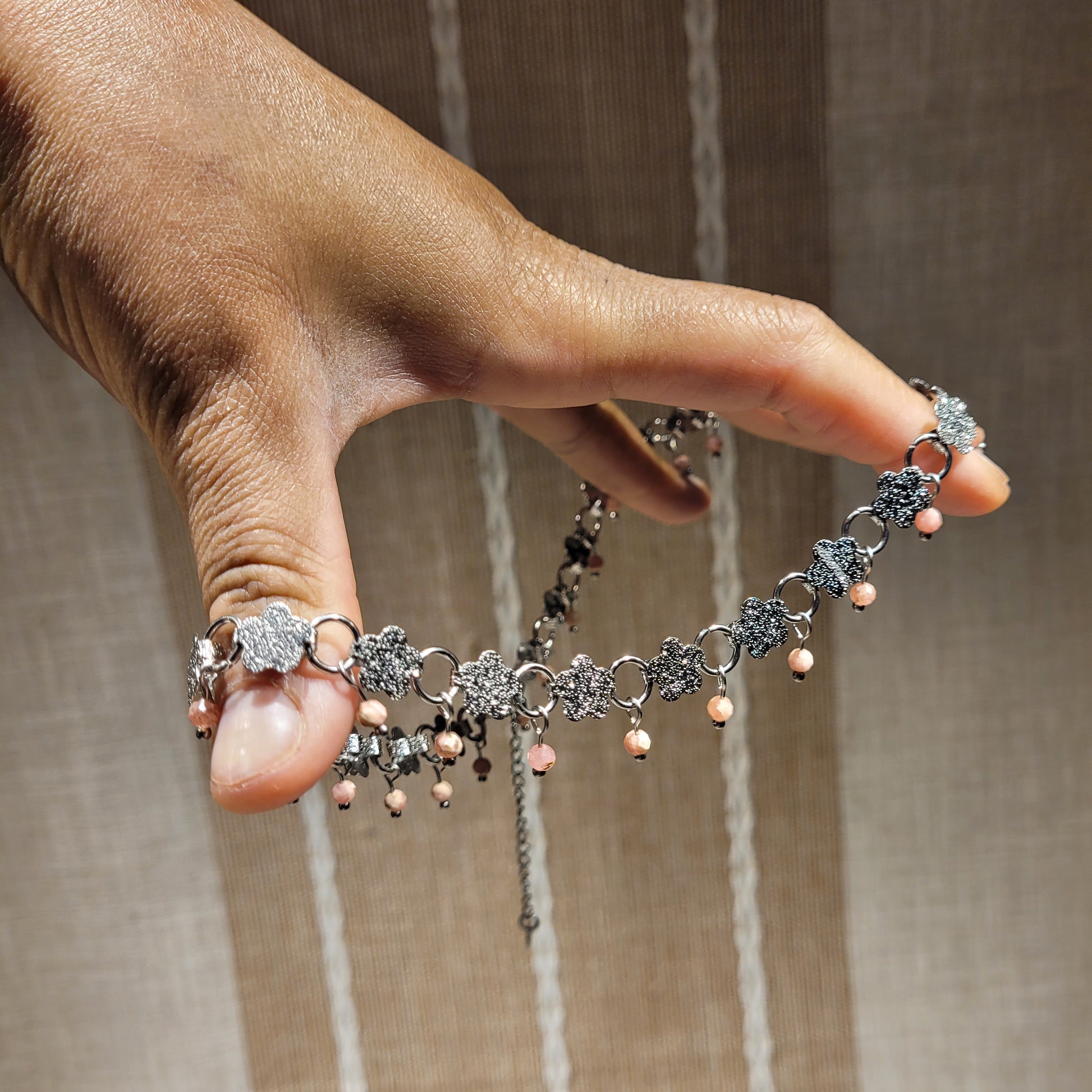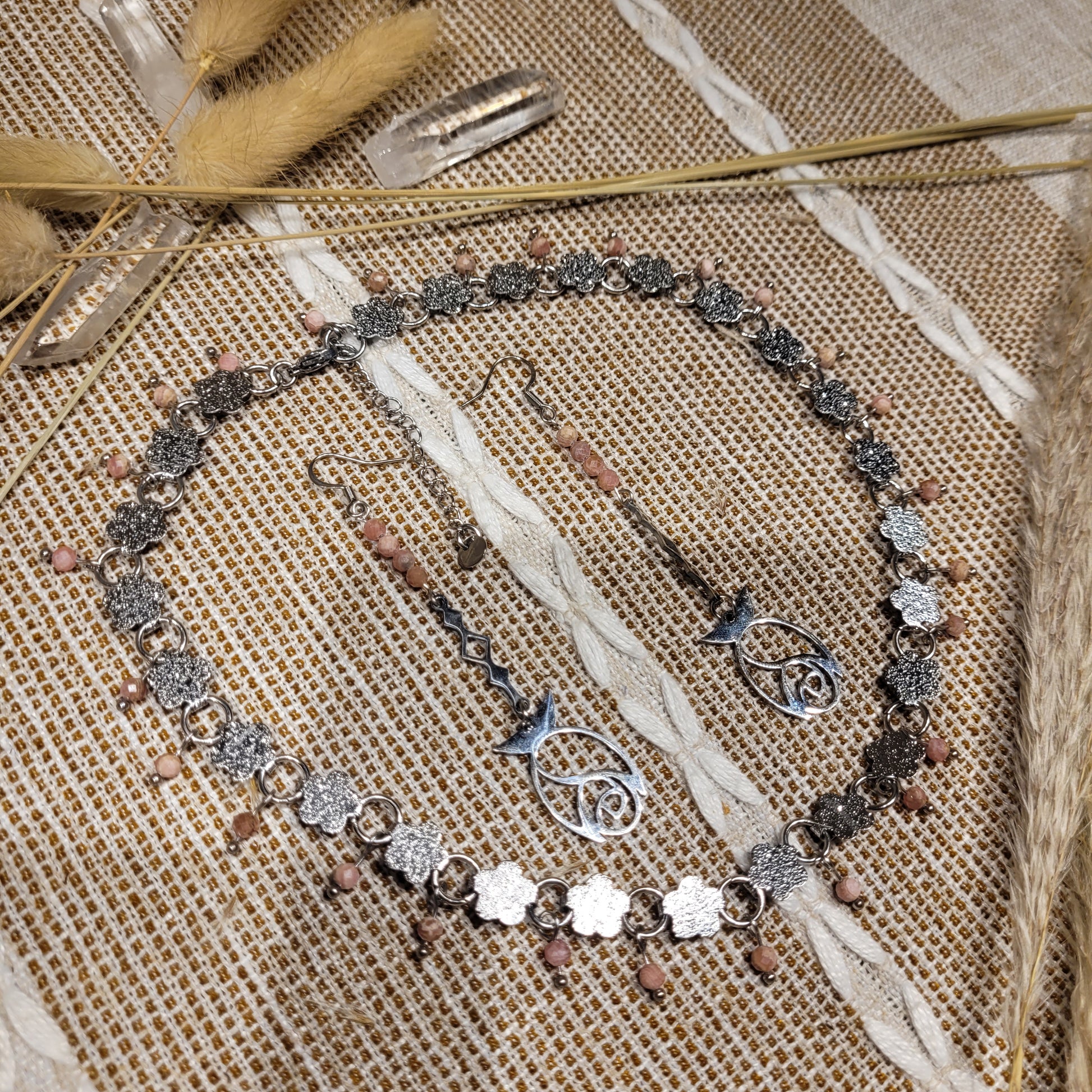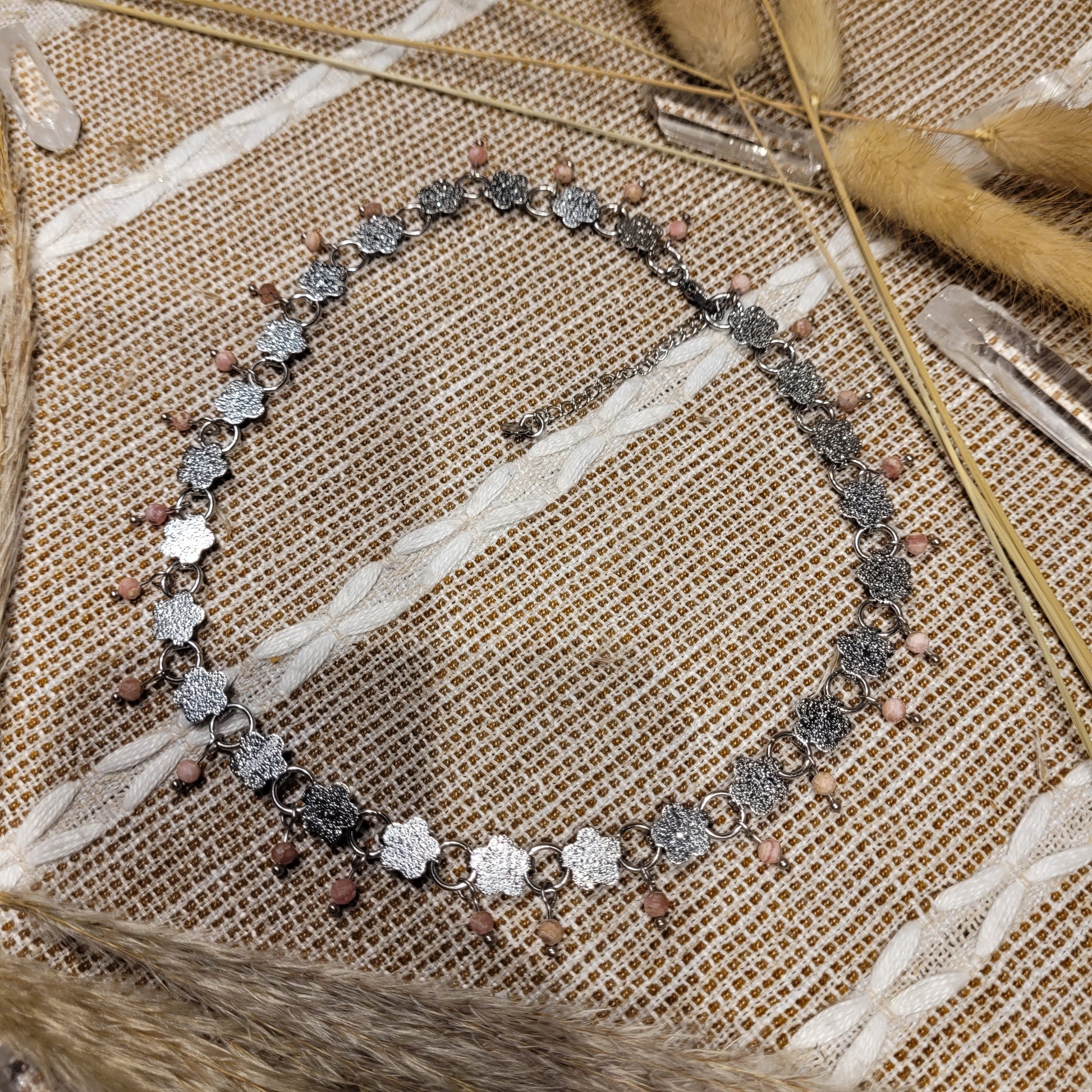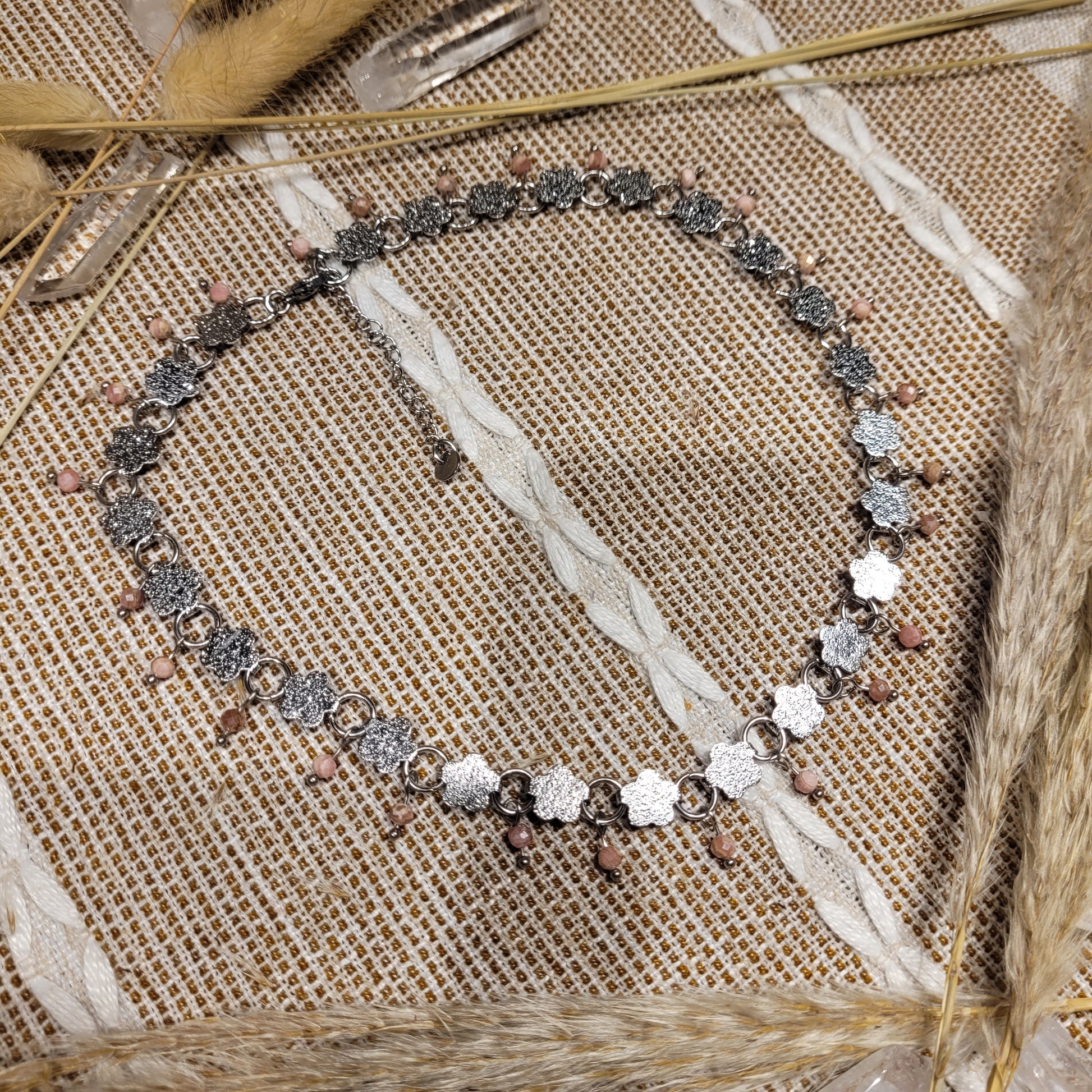I created this stunning Rhodochrosite Necklace with  stainless steel floral flower chain, stainless steel pins, and faceted Rhodochrosite crystals! Wear on your collar bone length or adjust tighter for a choker length!