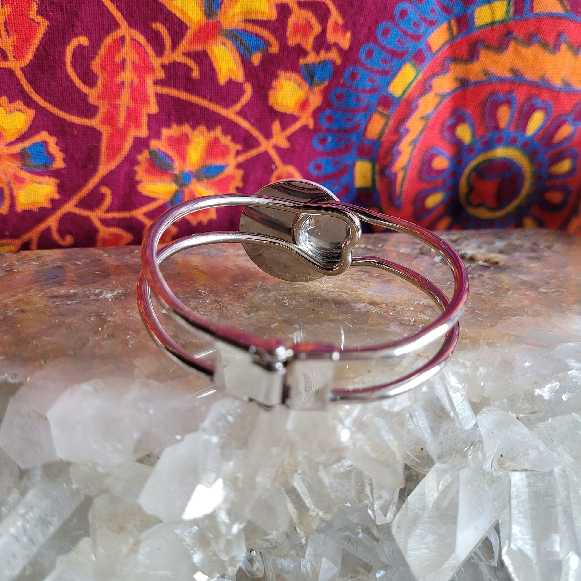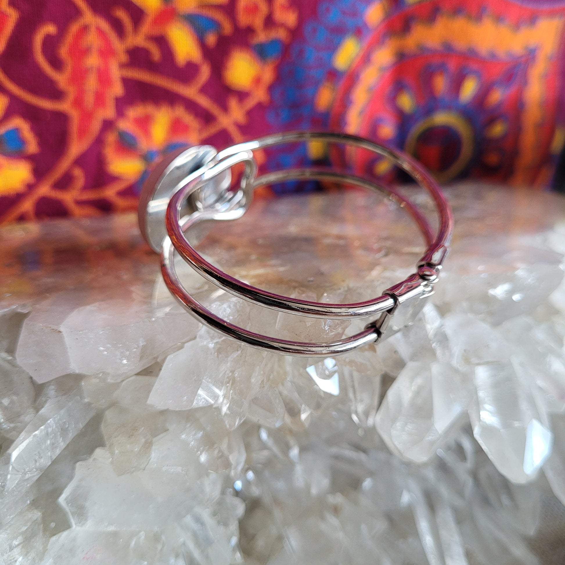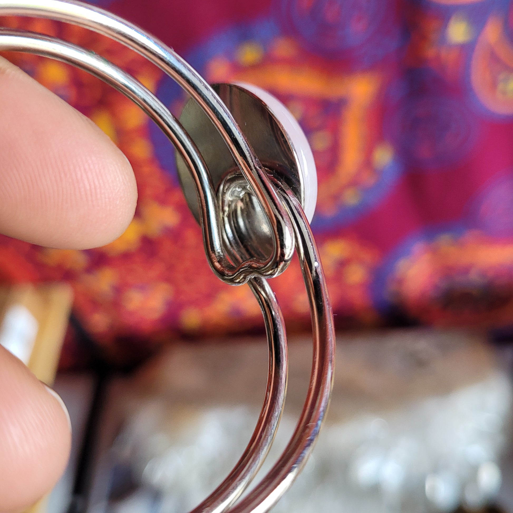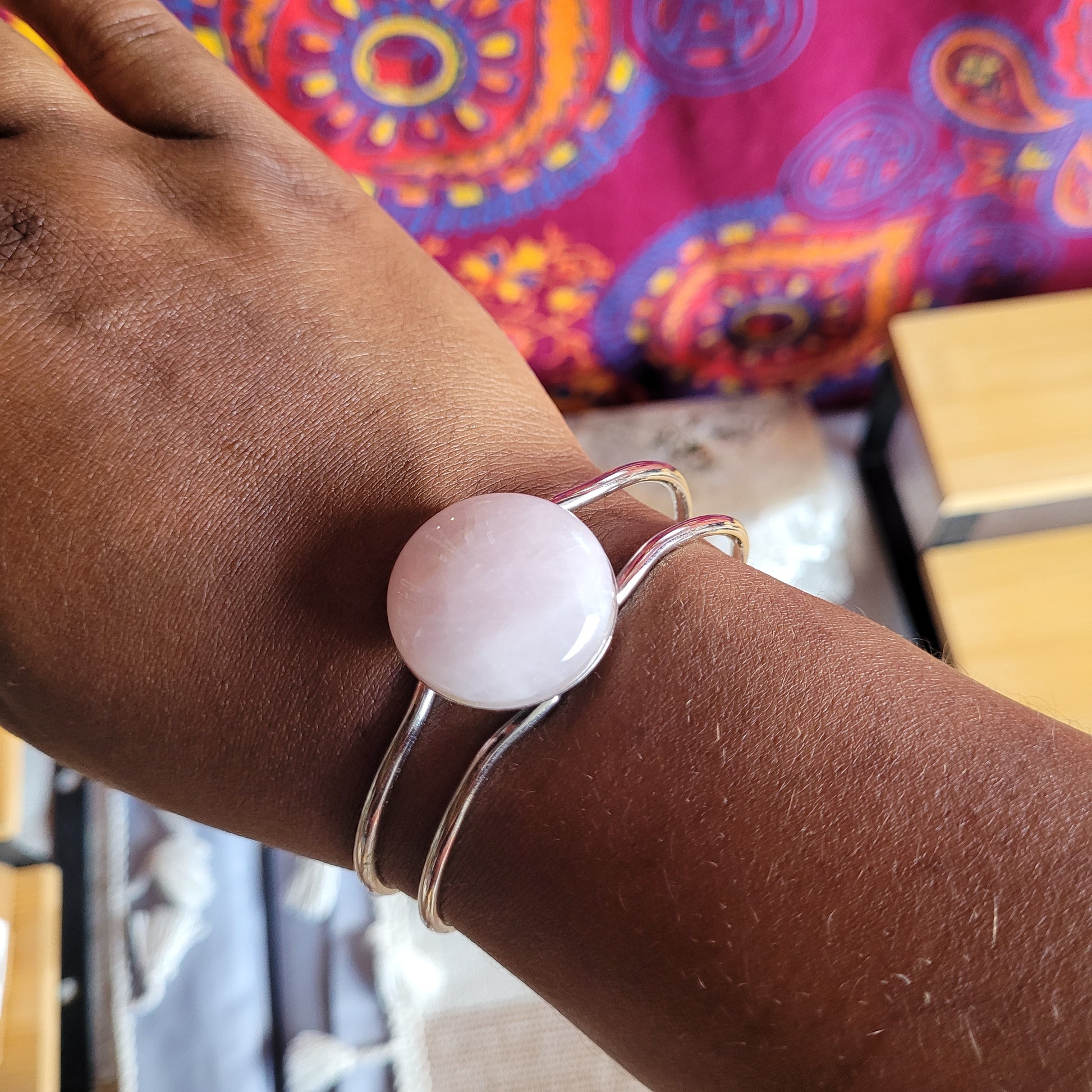 I created this Rose Quartz clip on cuff Bracelet with cuff bangle made with brass that platinum plated and a large statement Rose Quartz crystal.