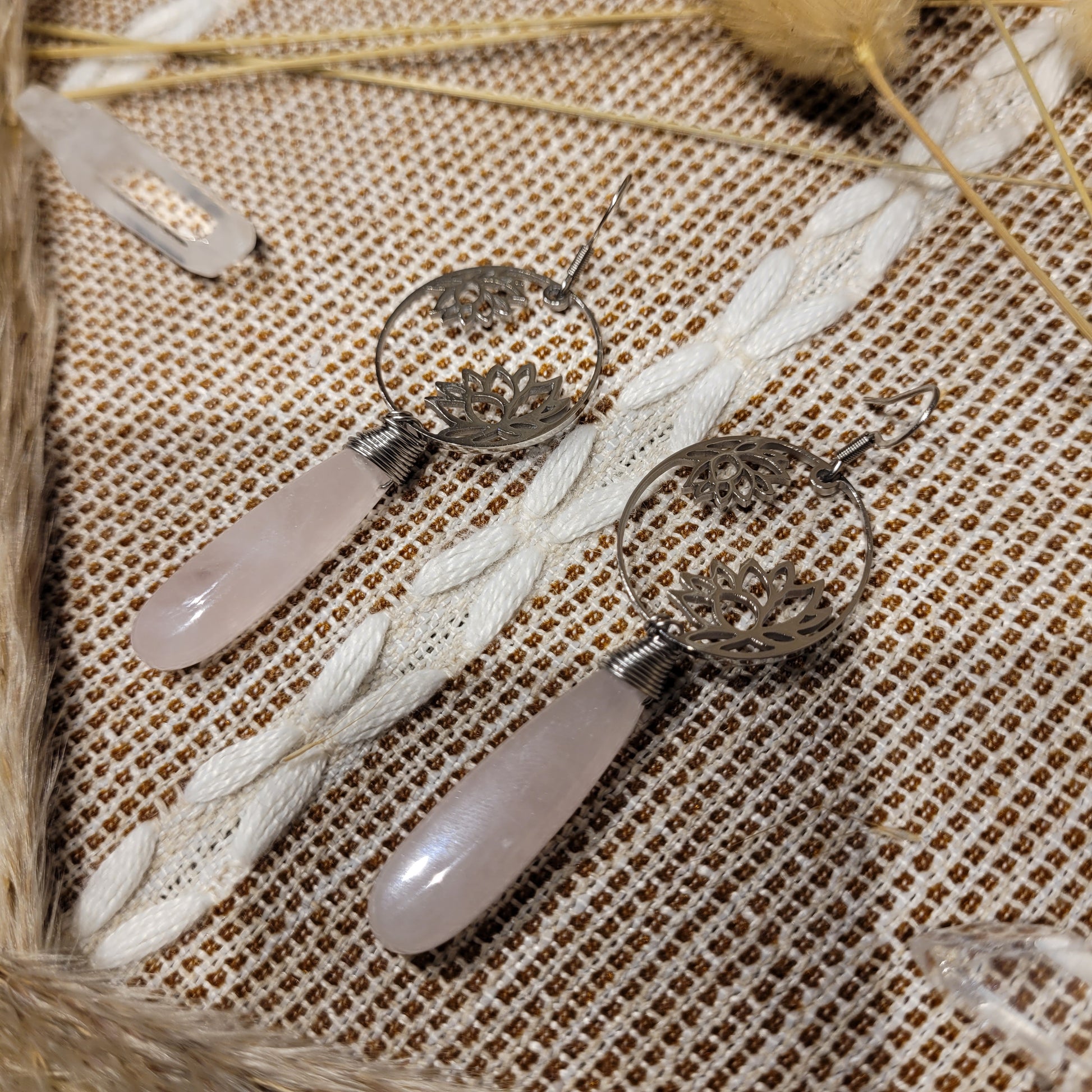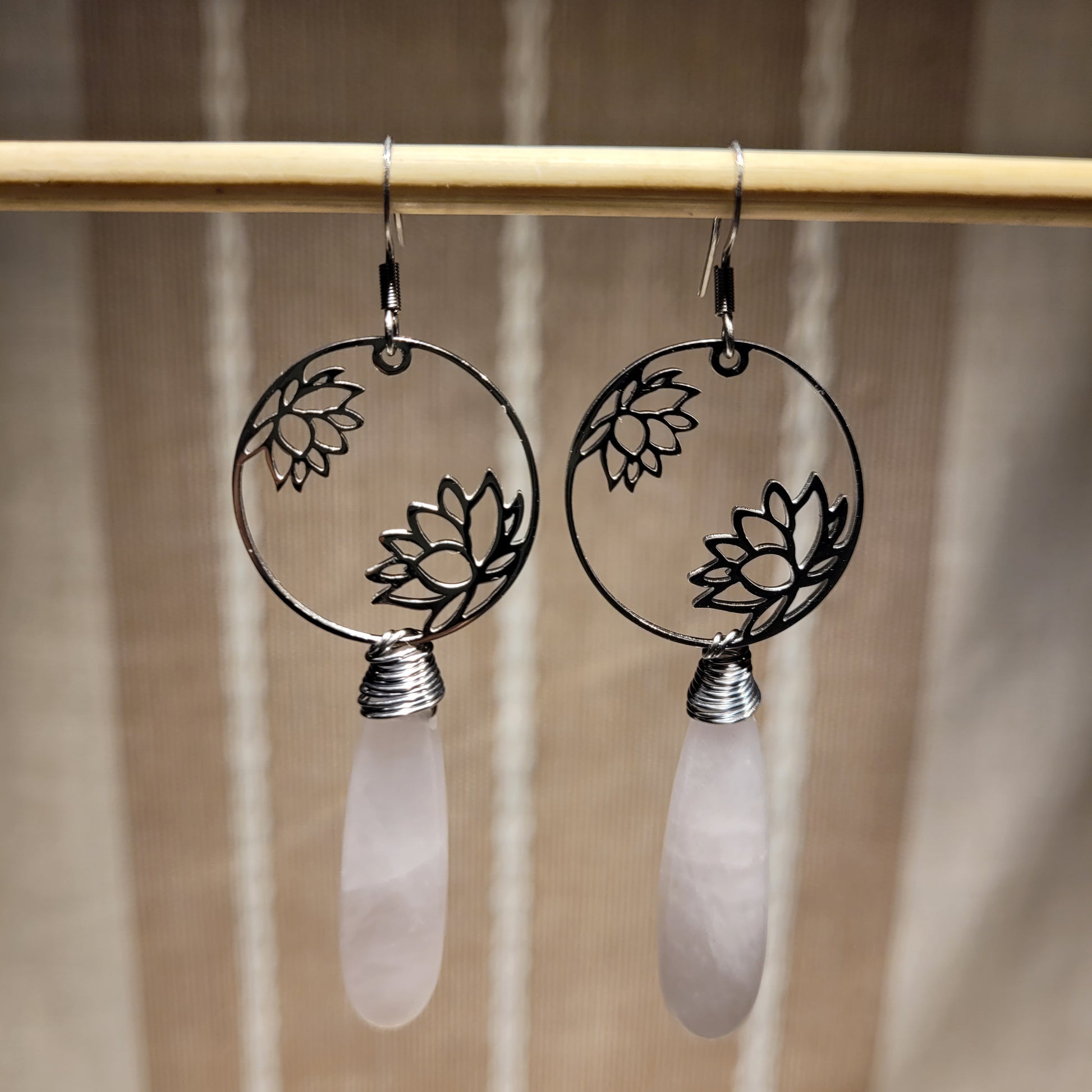 I created these beautiful earrings with stainless steel lotus flower charms, stainless steel hooks, and Rose Quartz crystals that are high quality and ethically sourced from Brazil!
