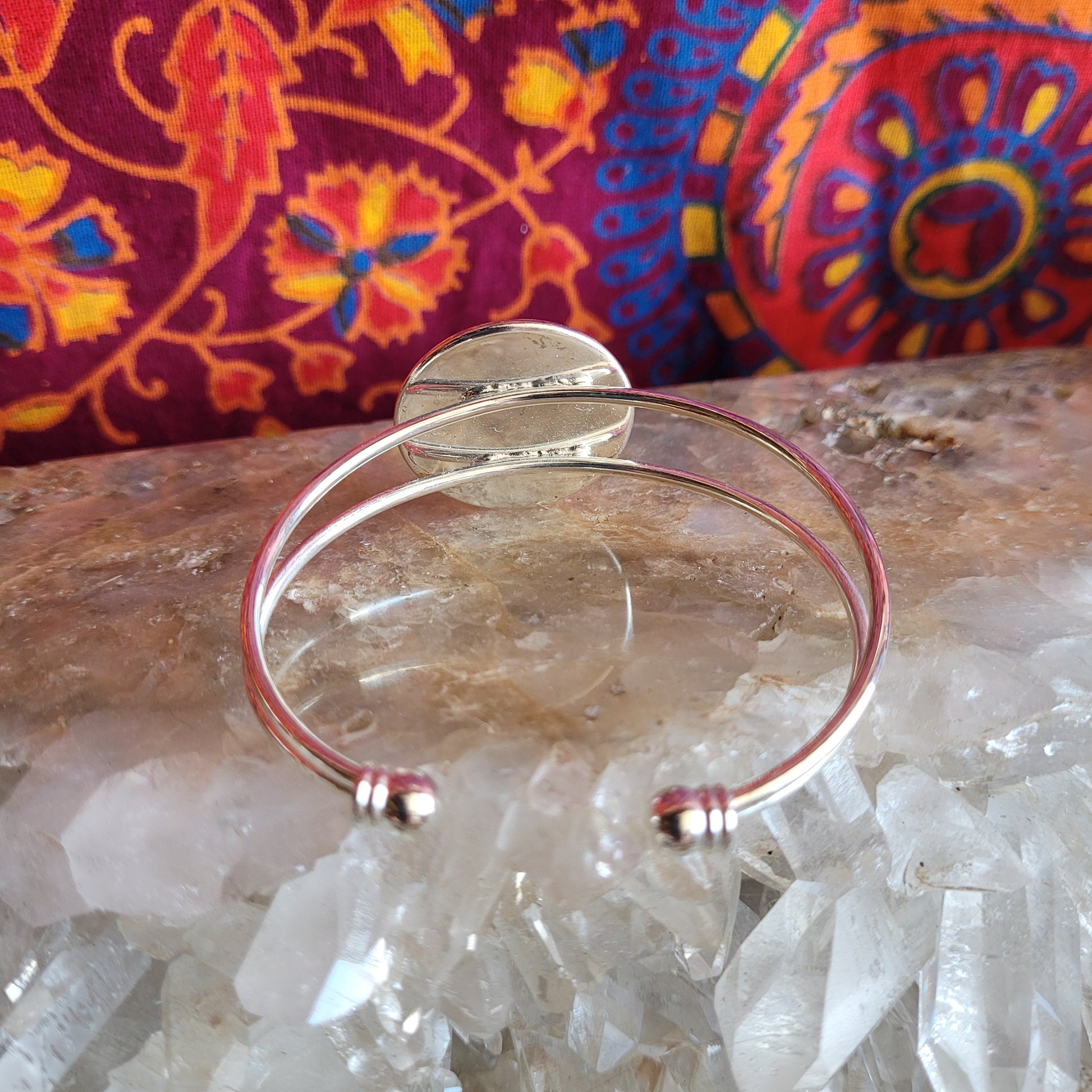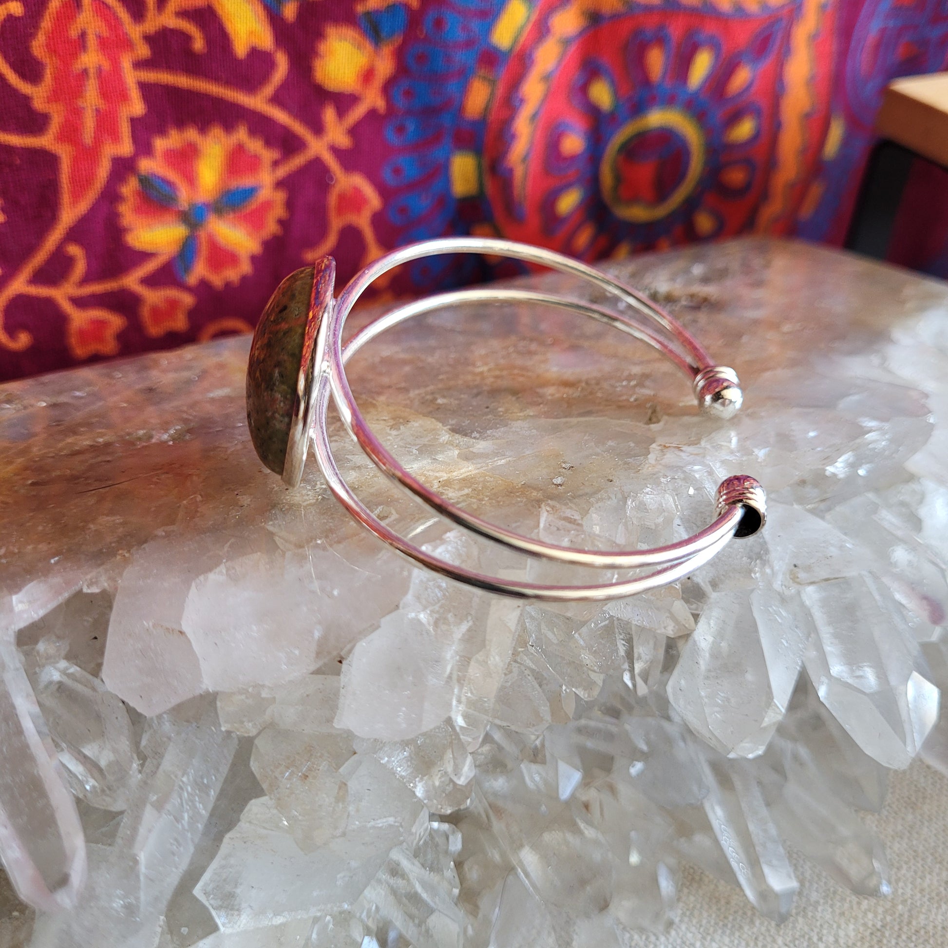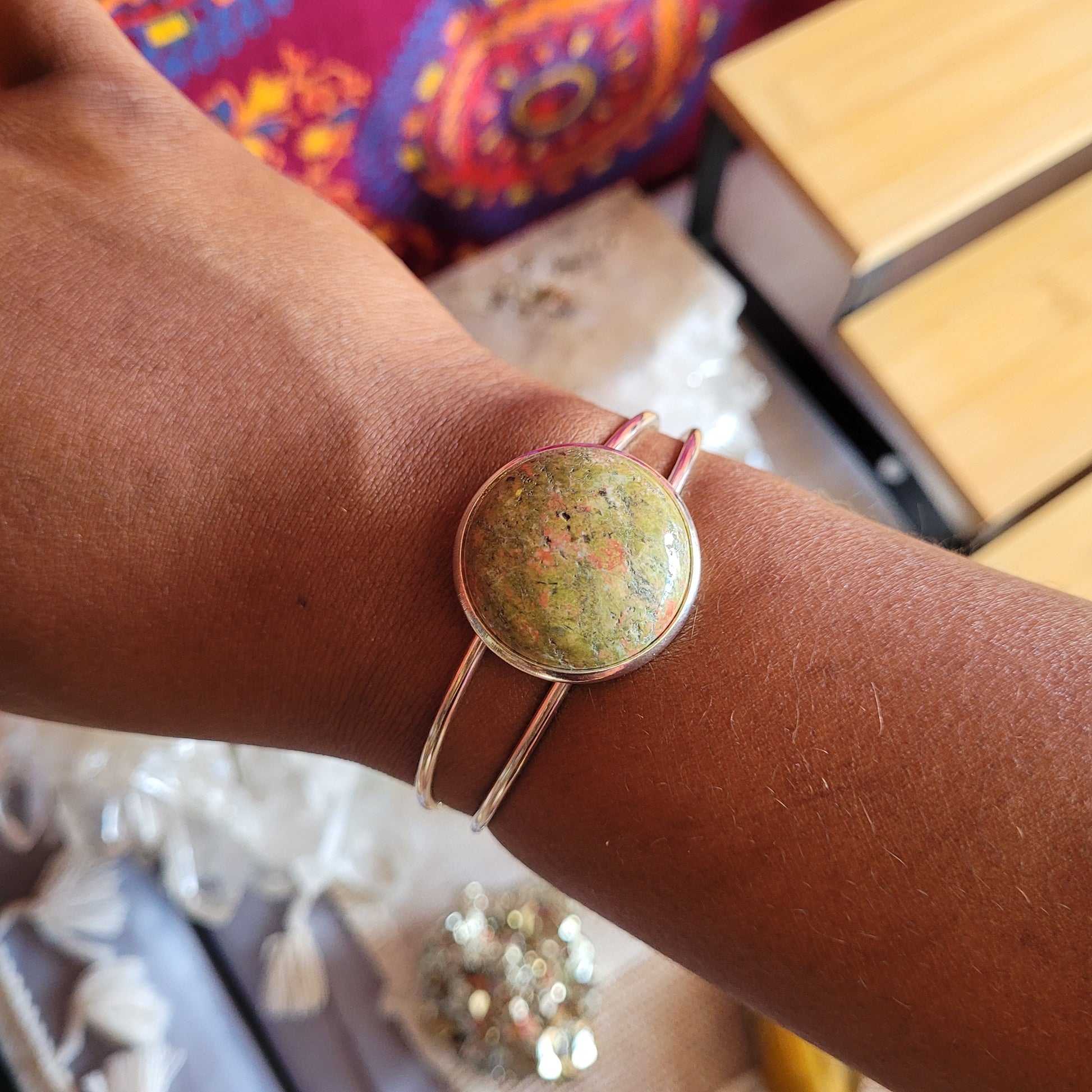 I created this Unakite cuff Bracelet made with brass silver color electroplating and a large statement Unakite crystal. Adjustable too! Gently open up to desired fit.