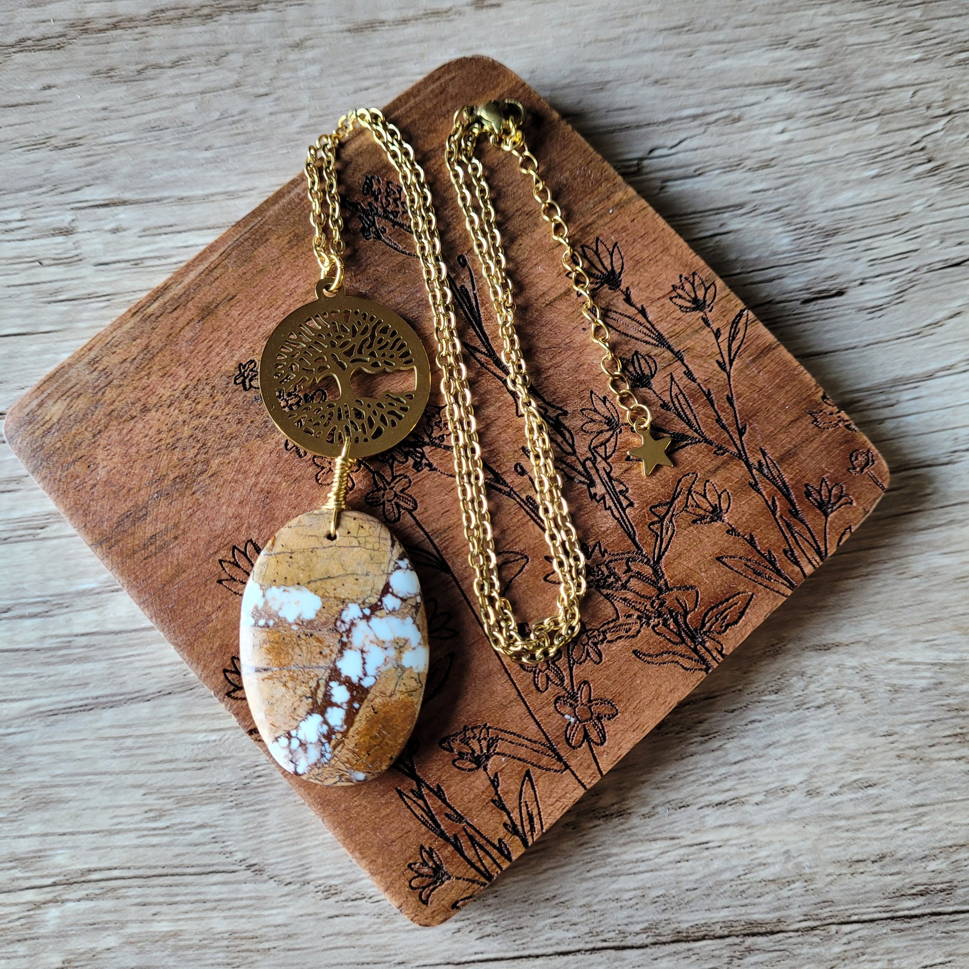 I created this stunning necklace with a 14k gold plated stainless steel chain, Wild Horse Jasper crystal ethically sourced from Oregon, USA, and a gold plated stainless steel tree of life charm!