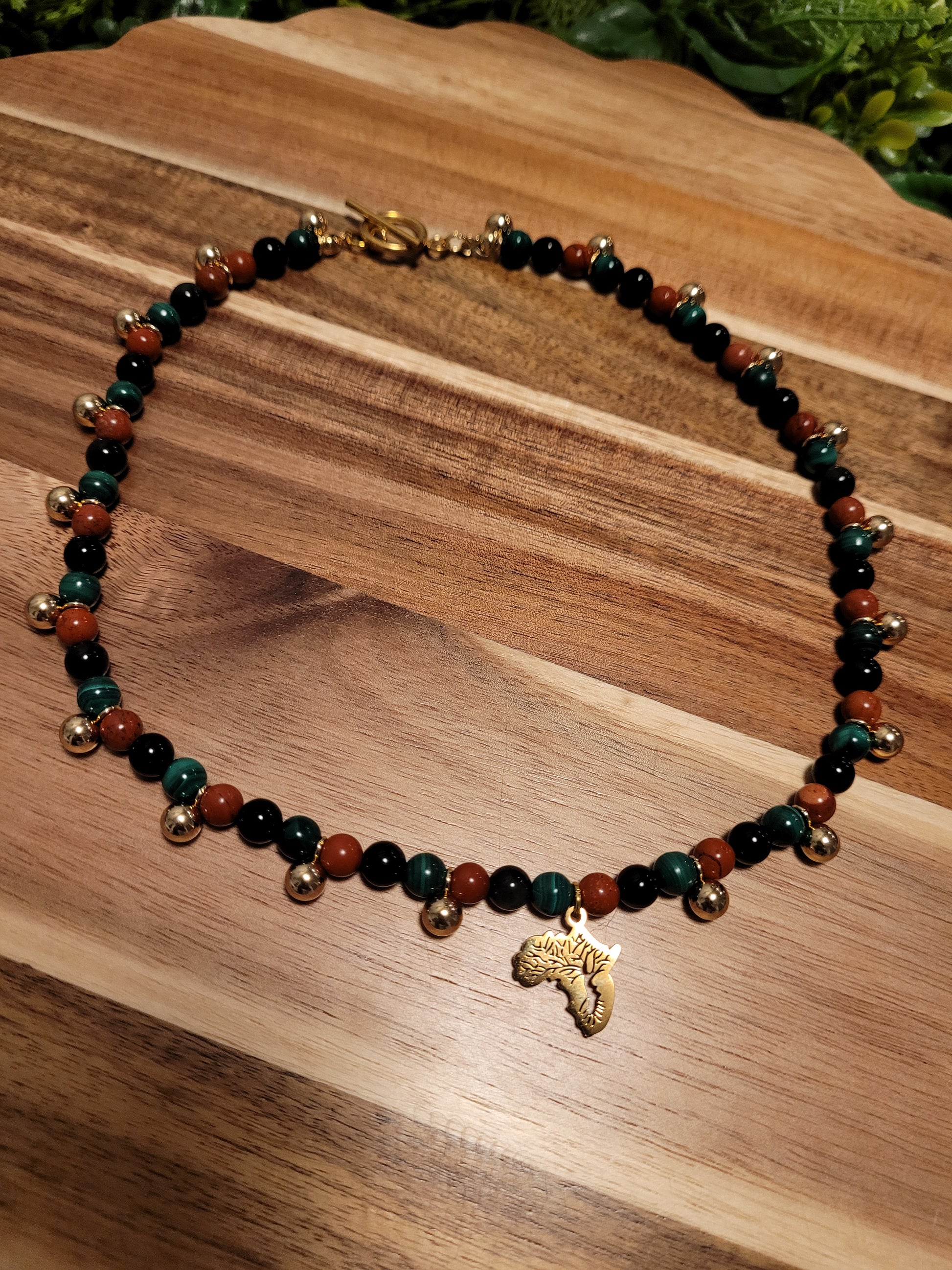 I created this stunning African Pride Necklace with gold plated stainless steel African map charms, gold stainless steel beads, 100% natural silk cord, and gold stainless steel toggle clasp, and Red Jasper Green Aventurine Black Obsidian crystals!