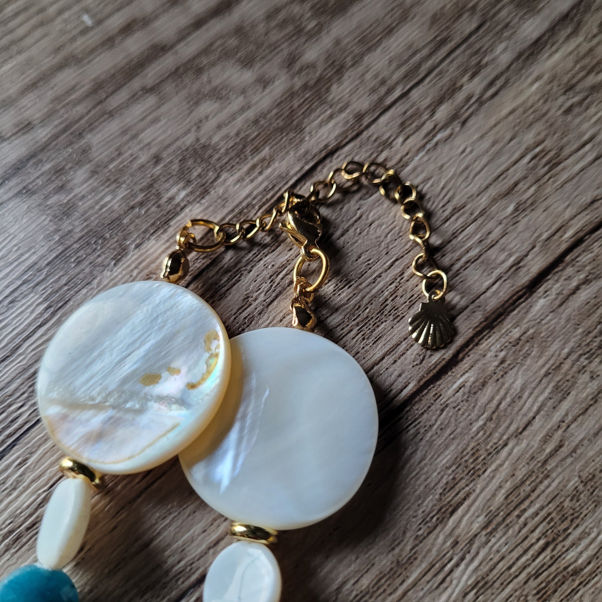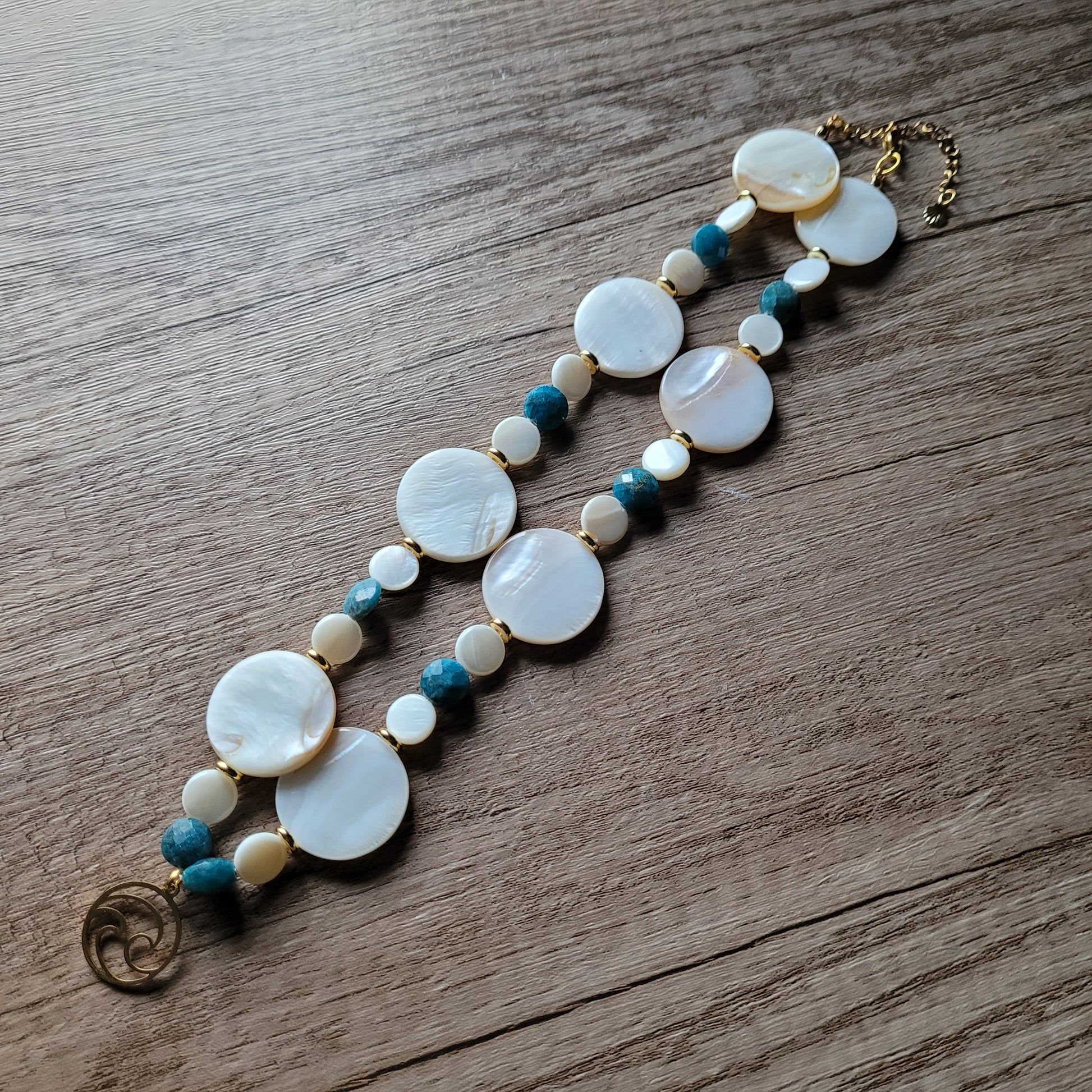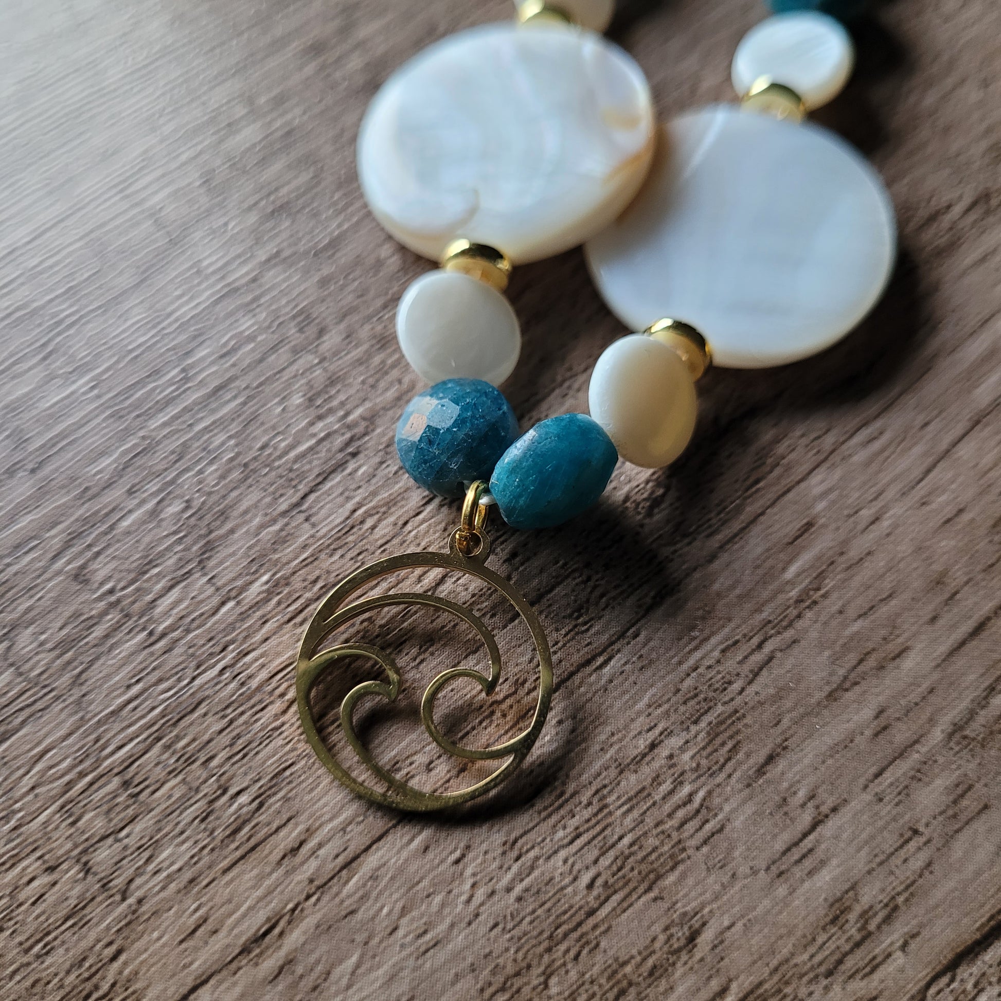 I created this high quality Blue Apatite Mother of Pearl necklace with 100% silk cord, gold plated ocean wave charm, gold plated beads, and the Blue Apatite and White Mother of Pearl crystals are ethically sourced!