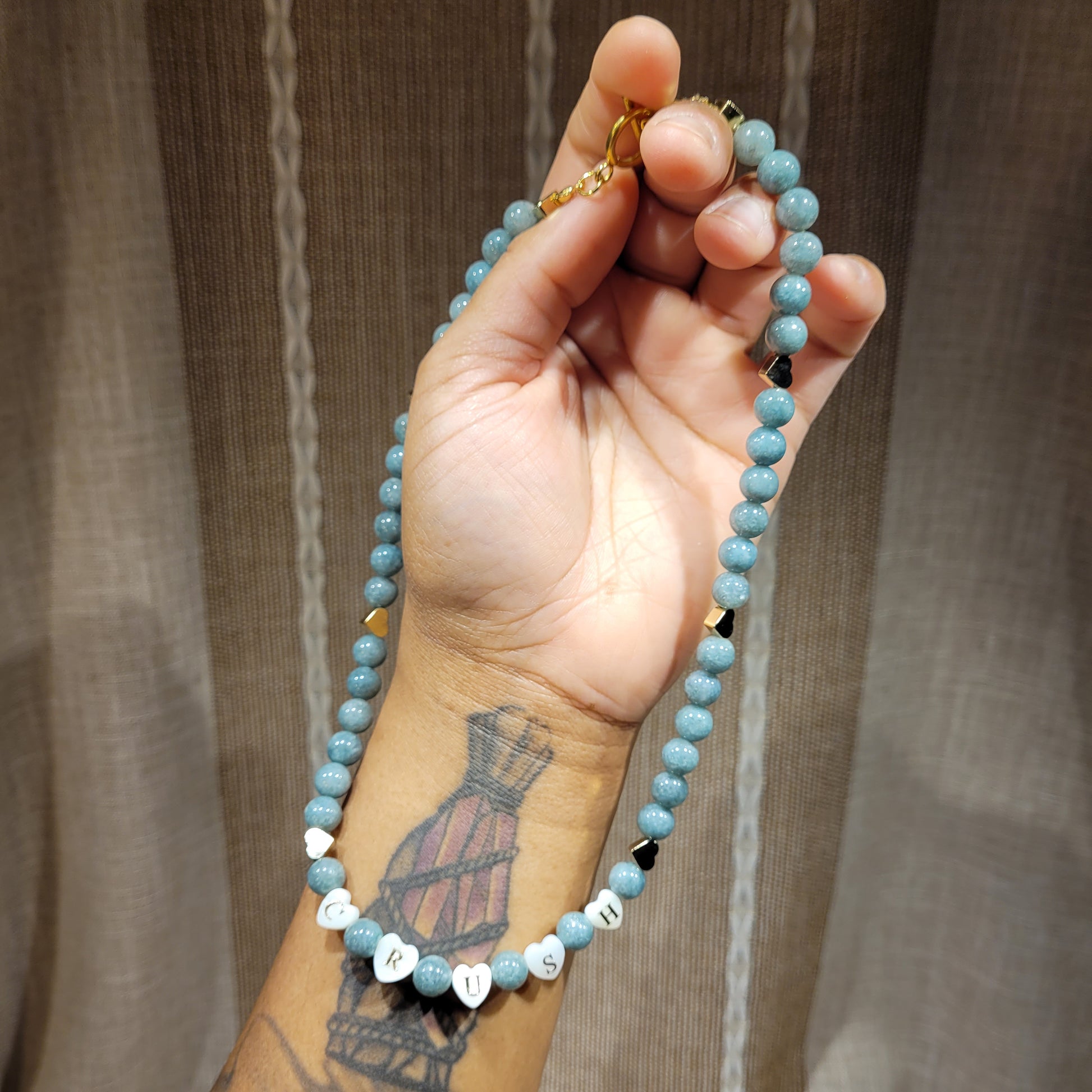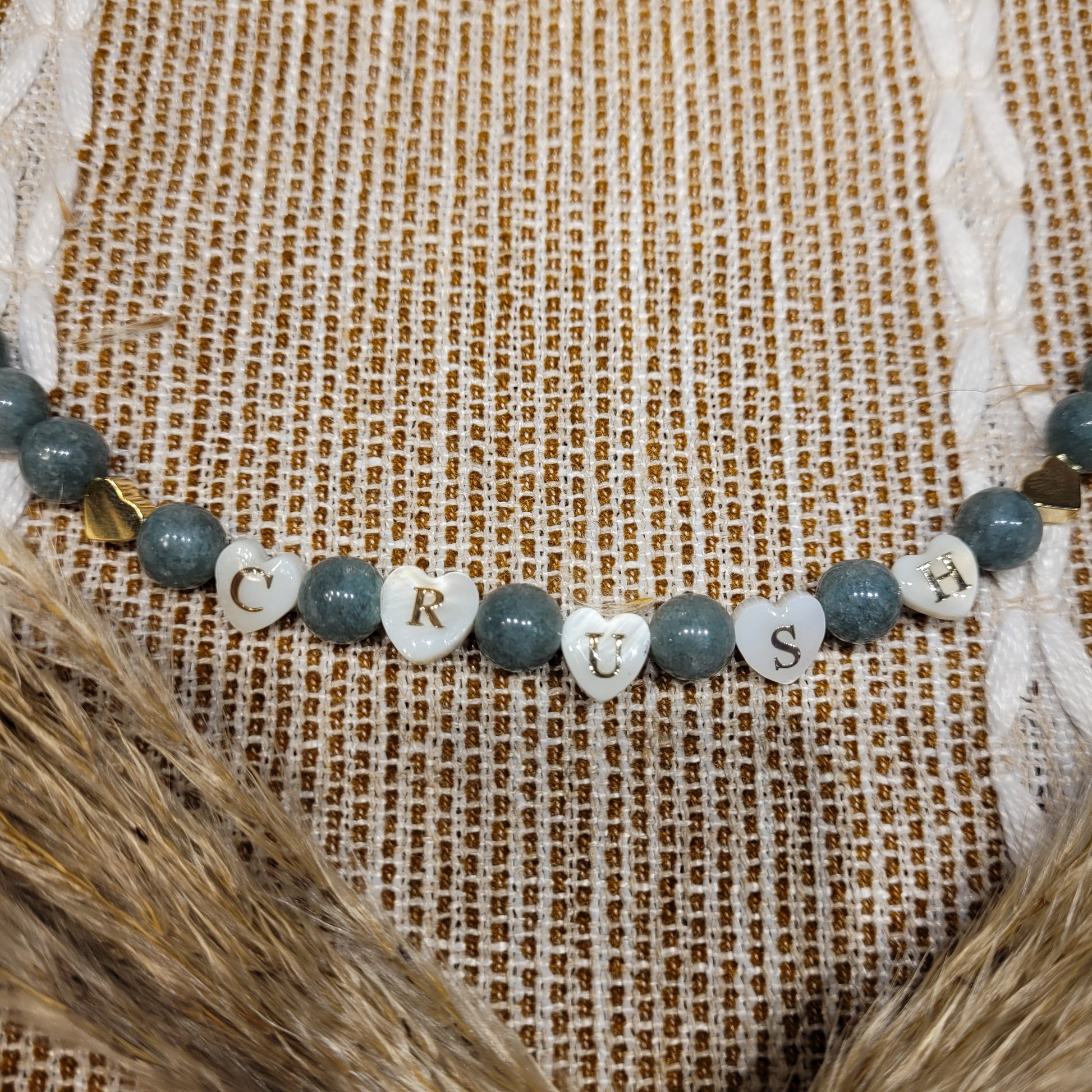 I created this stunning Burma Jade Heart Necklace with gold stainless steel heart statement pendant, gold stainless steel mini hearts, 100% natural silk cord, and gold stainless steel toggle clasp, mother of pearl heart shaped crystals spelled "Crush", and Burma Jade crystals! Stunning choker/collar bone length!