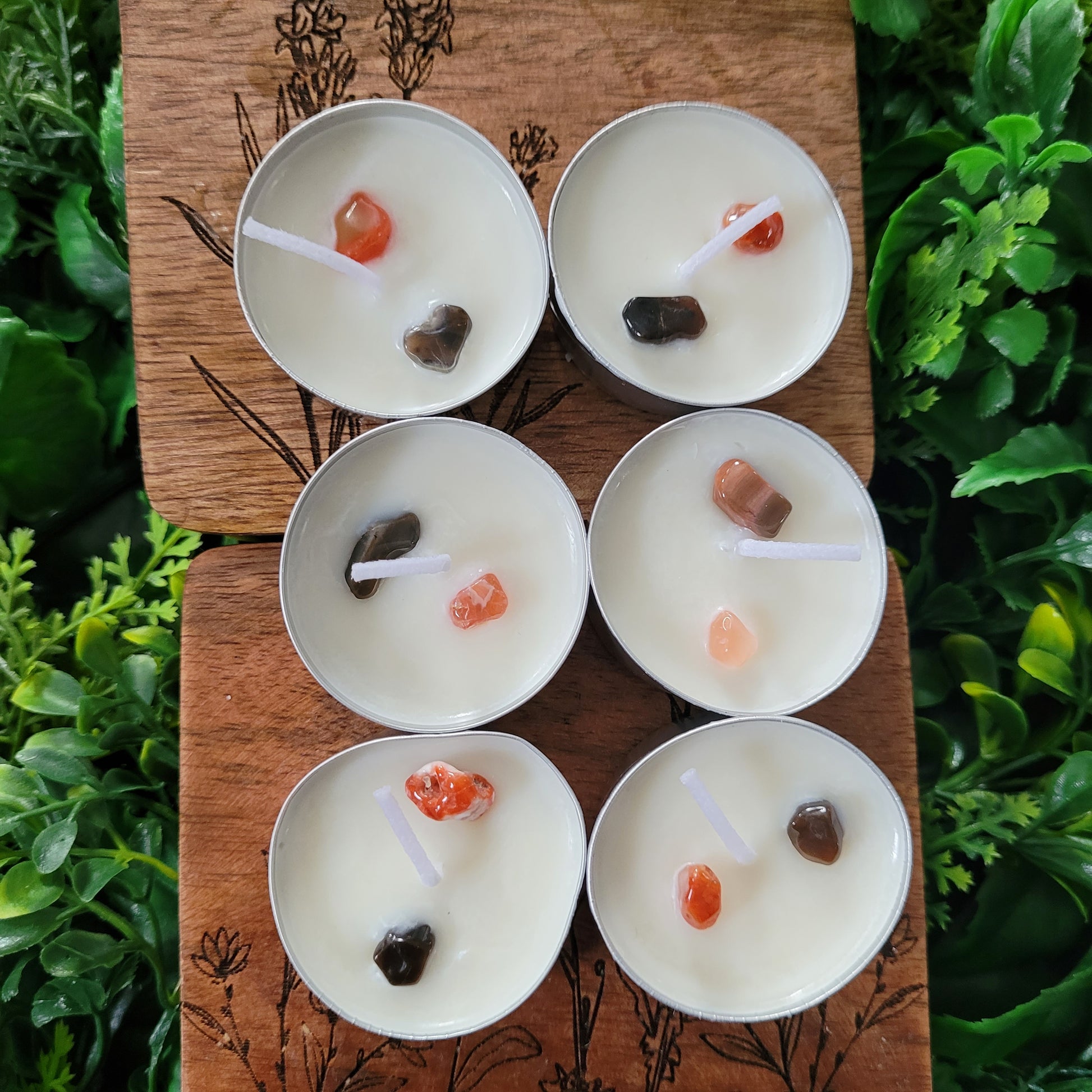 Chai Tea scented candle with decorated with Carnelian and Petrified Wood Crystal chips on top!
