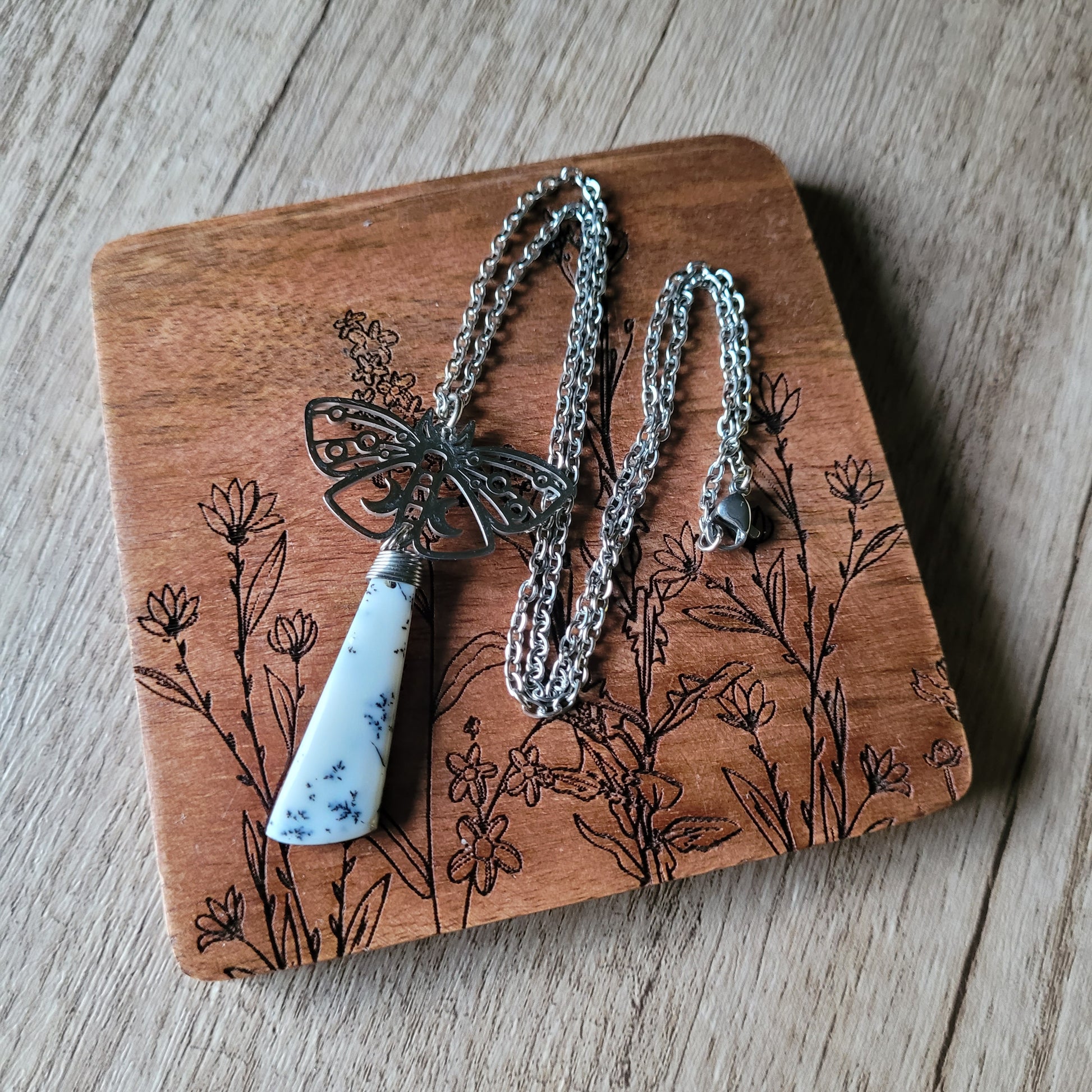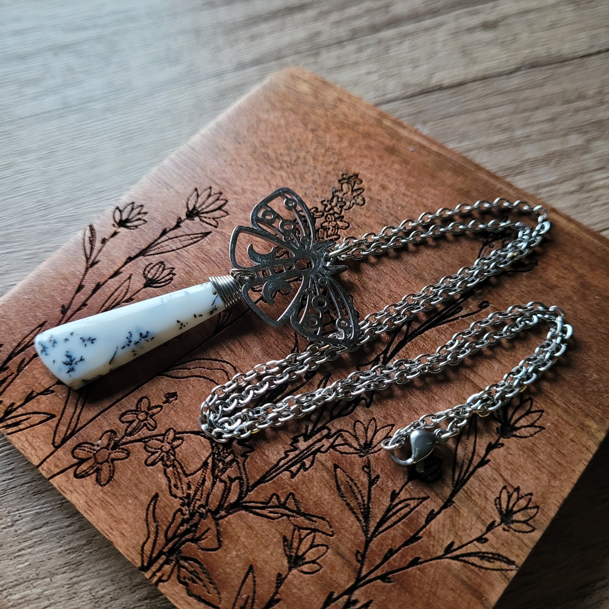 I created this high quality Dendritic Opal necklace with stainless steel chain, stainless steel moth moon butterfly charm, stainless steel wire wrap, and tthe Dendritic Opal crystal is ethically sourced!