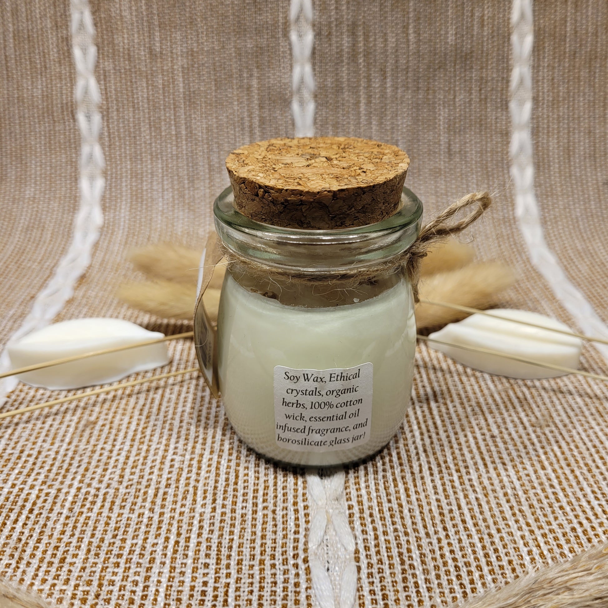 Handmade soy candles created with high-quality clean burning essential oil infused fragrance, 100% cotton wick, lead free borosilicate glass jar, decorated with organic dried herbs and ethically sourced crystals in a 3.4 oz Jar. Plus there is a hidden crystal on the bottom!