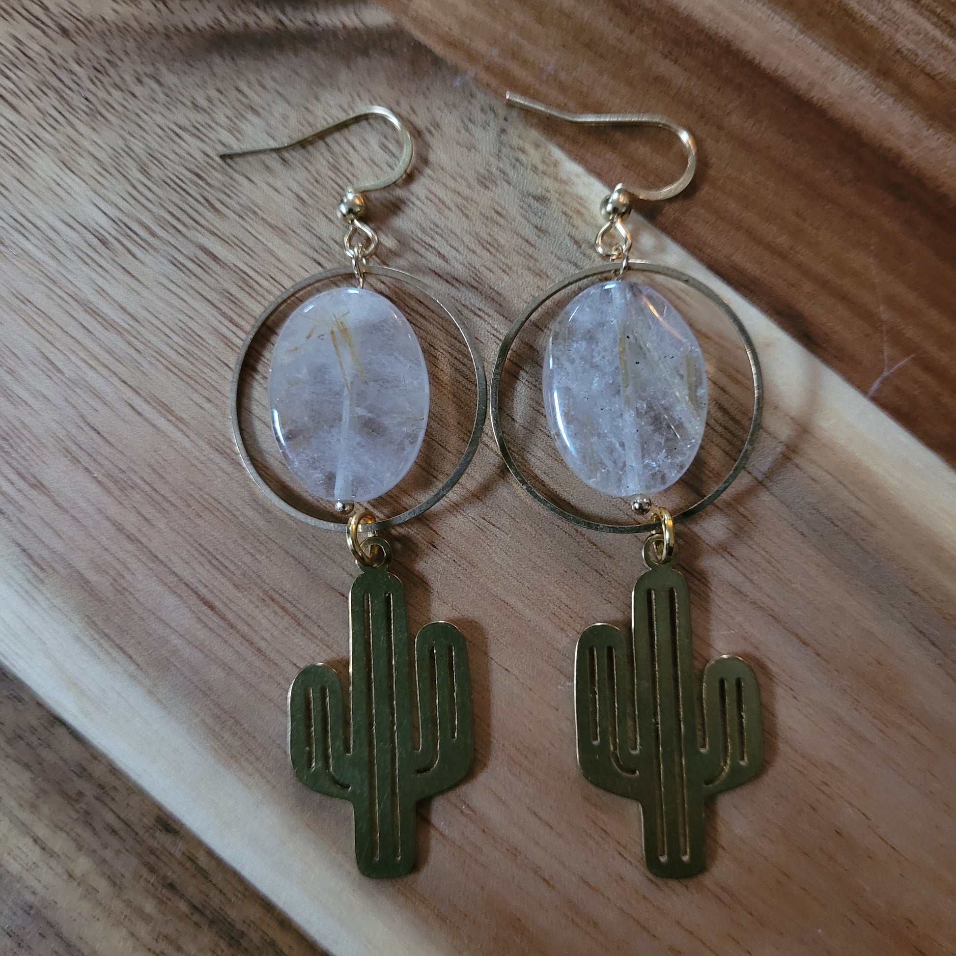 I created these high quality Gold Rutile Quartz Earrings with brass cactus charms, gold plated steel hooks, and high-quality Gold Rutile Quartz crystals!