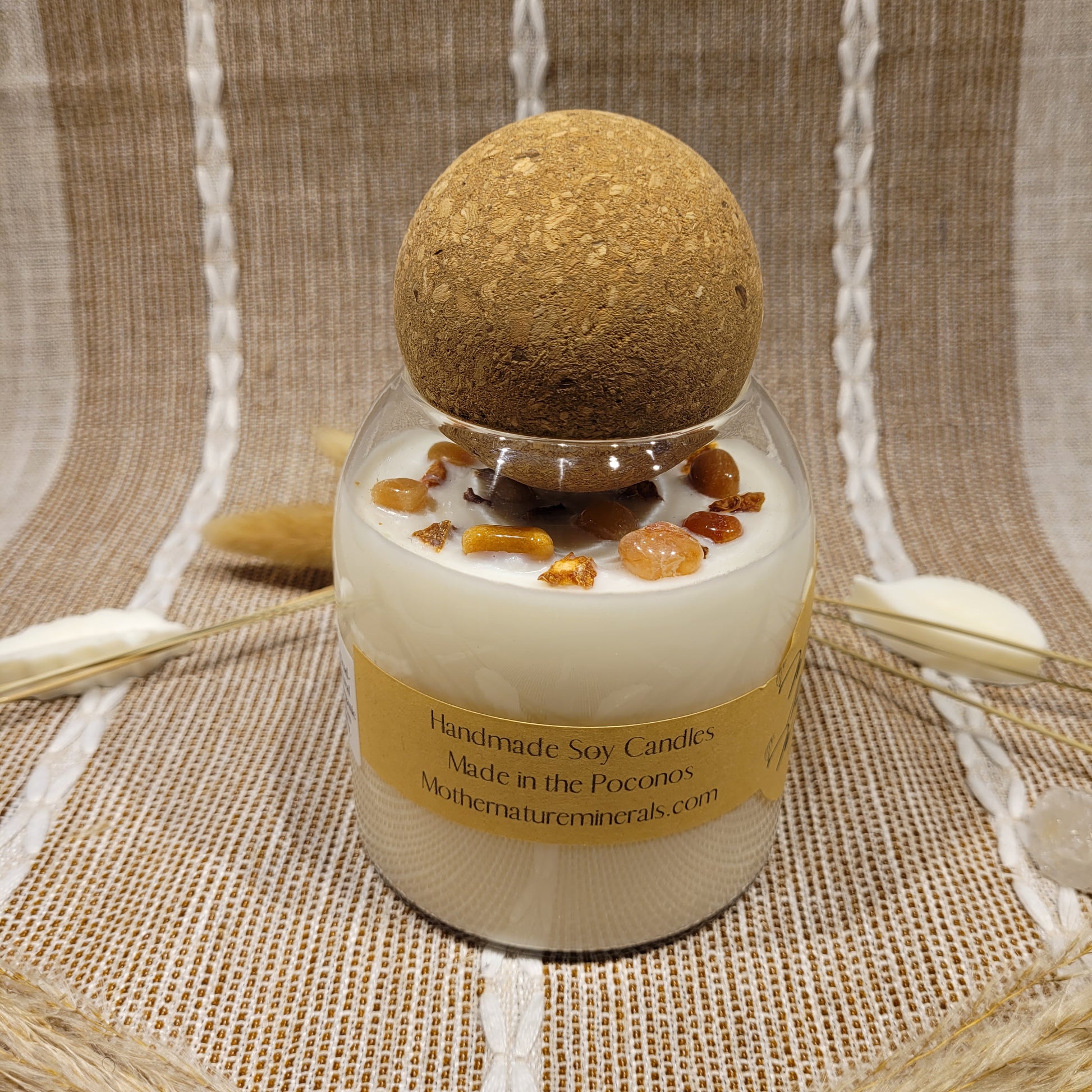 Handmade soy candles created with high-quality clean burning essential oil infused fragrance, 100% cotton wick, lead free borosilicate glass jar, decorated with organic dried herbs and ethically sourced crystals in a 17 oz Jar. Plus there is a hidden crystal on the bottom!