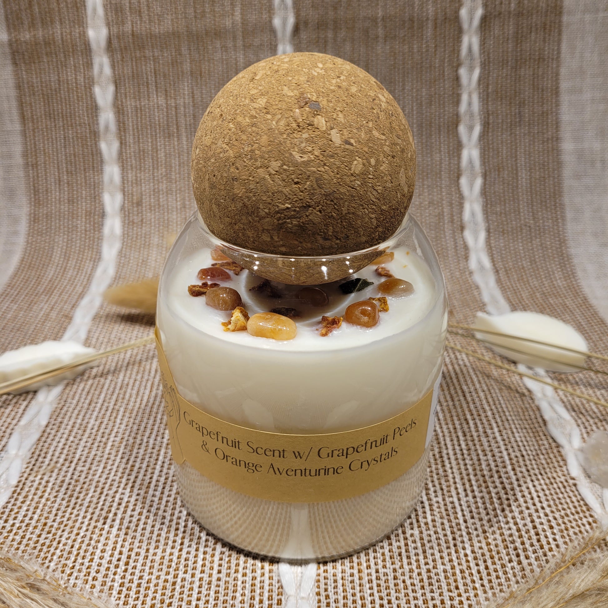This candle has a lovely Grapefruit scent and decorated with Grapefruit peels and Orange Aventurine Crystal chips on top!