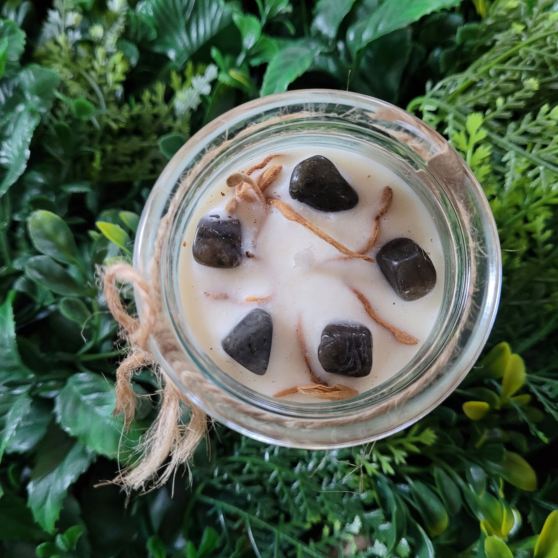 Handmade soy candles created with high-quality clean burning essential oil infused fragrance, 100% cotton wick, lead free borosilicate glass jar, decorated with organic dried herbs and ethically sourced crystals in a 7 oz Jar. Plus there is a hidden crystal on the bottom!