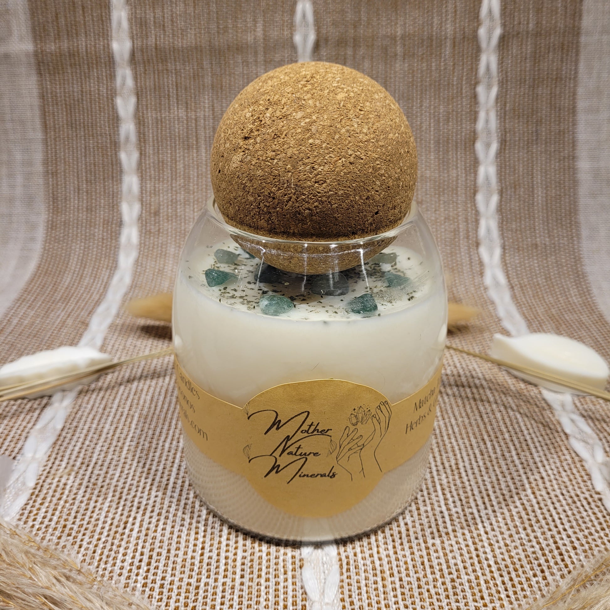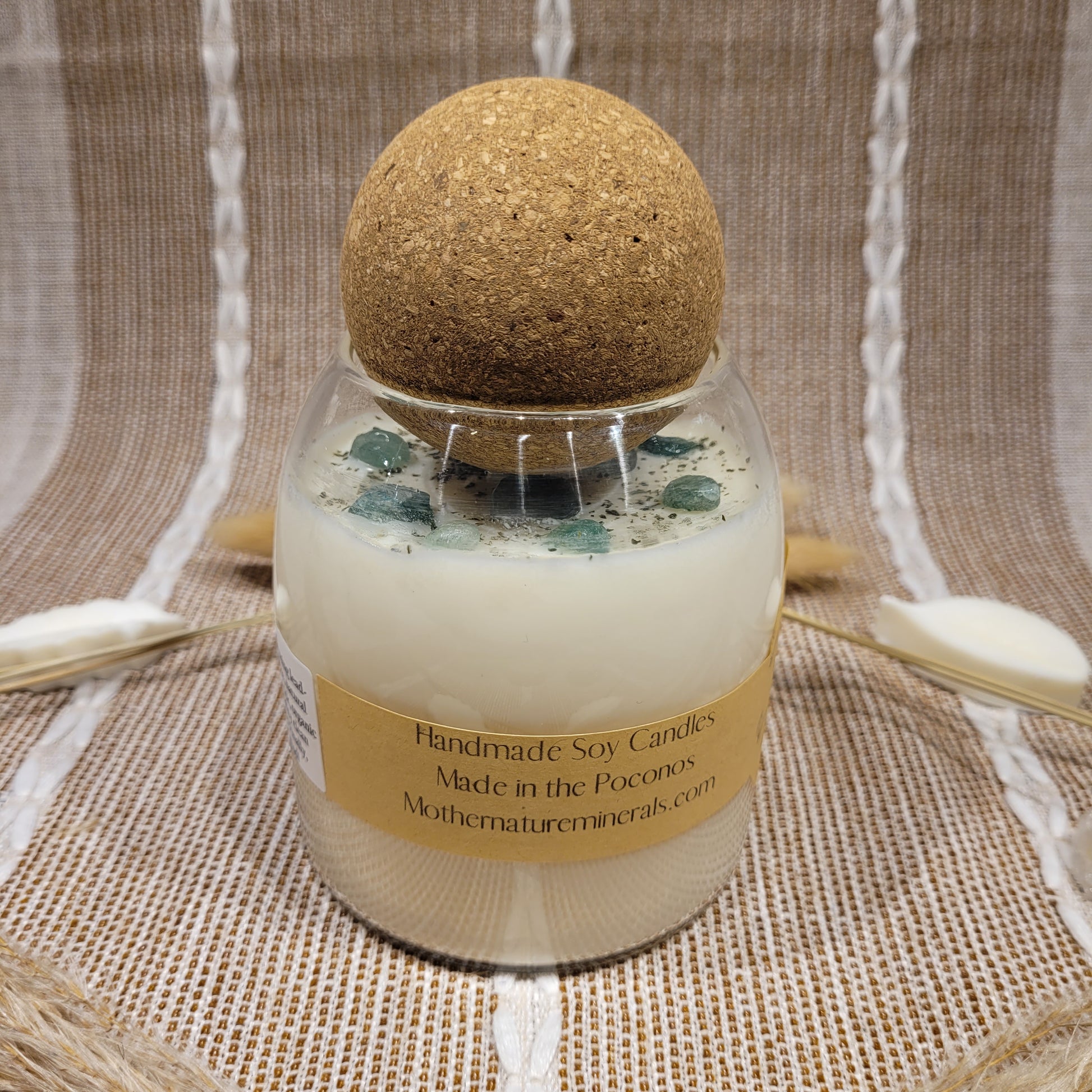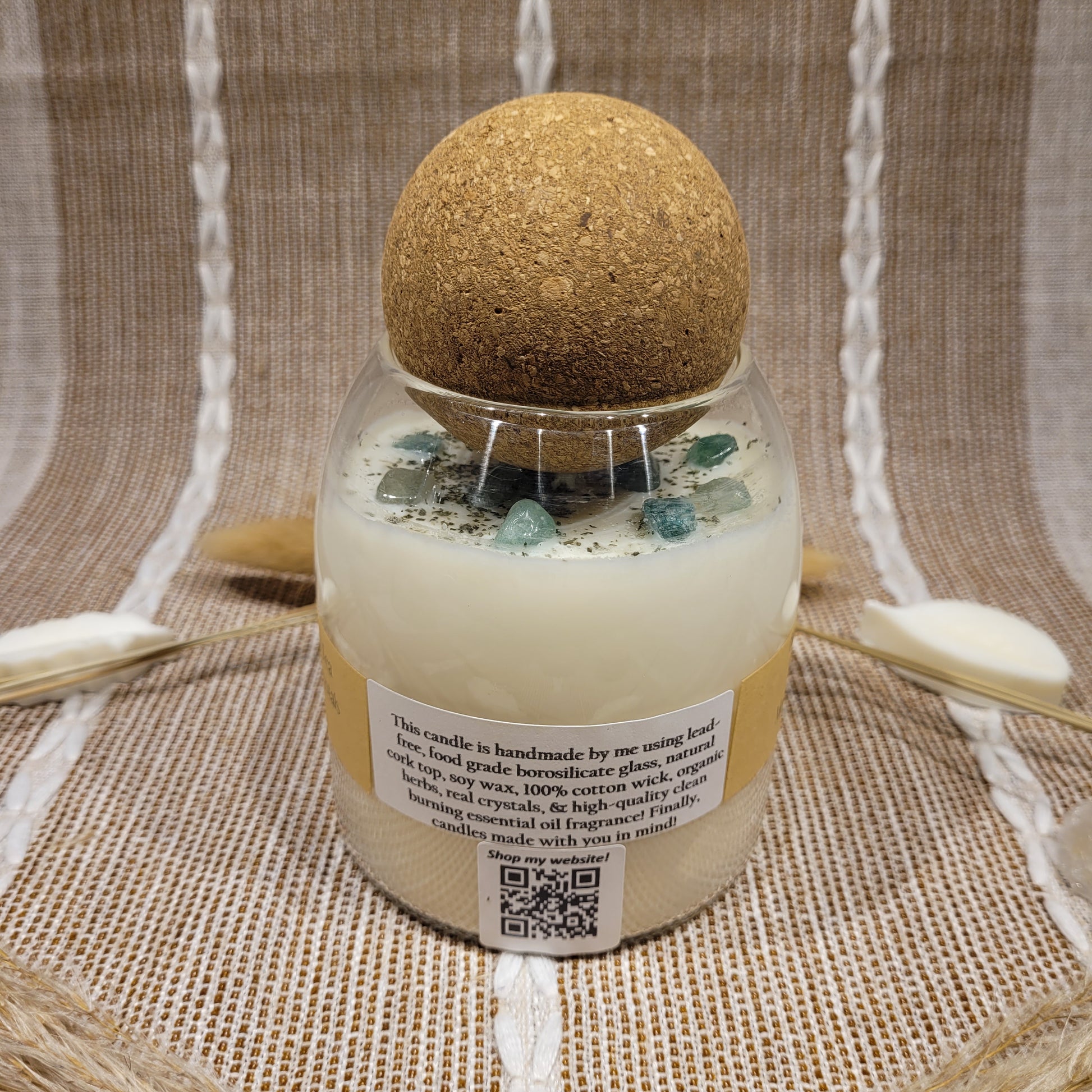 Handmade soy candles created with high-quality clean burning essential oil infused fragrance, 100% cotton wick, lead free borosilicate glass jar, natural cork lid, decorated with organic dried herbs and ethically sourced crystals in a 17 oz jar. Plus there is a hidden crystal on the bottom!