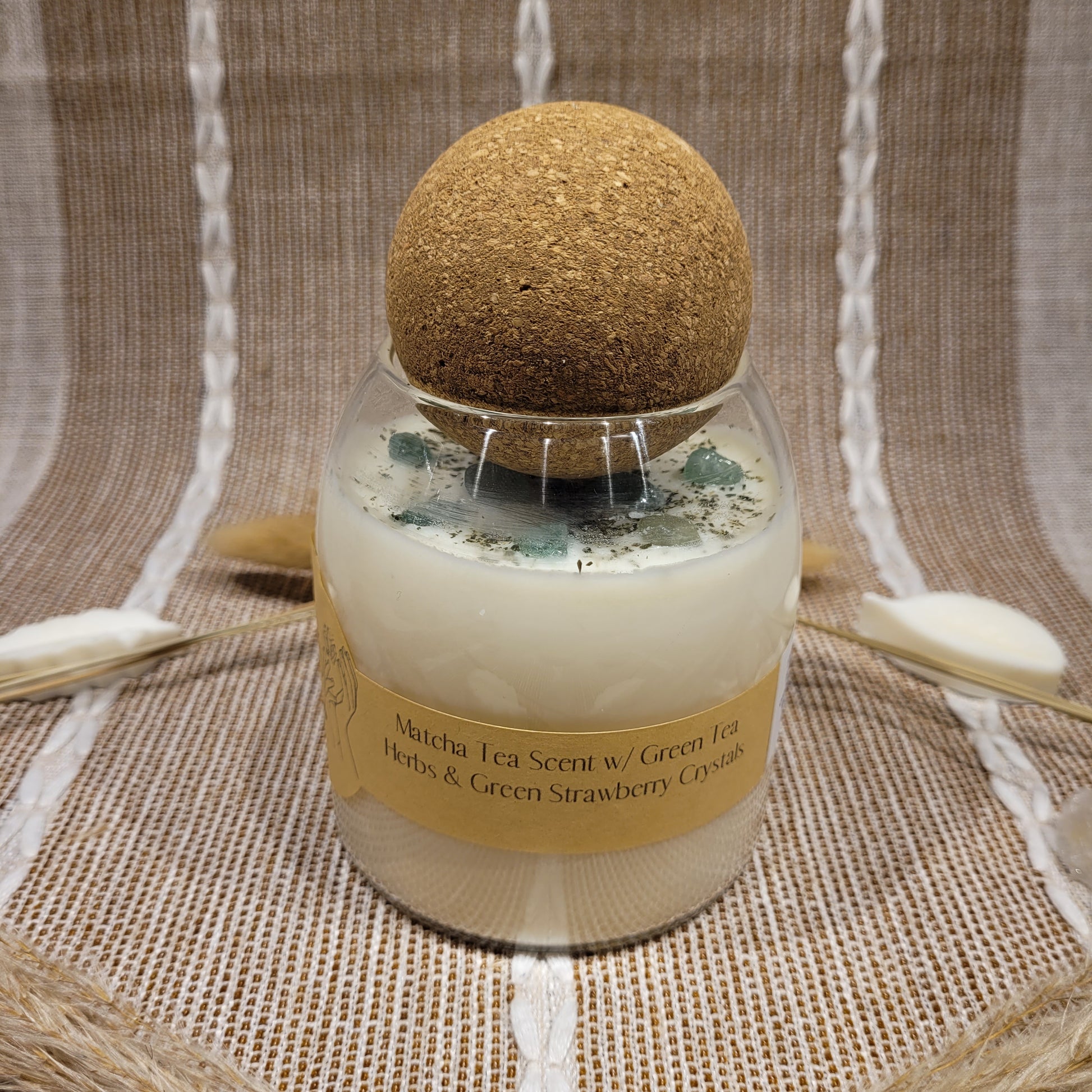 This candle has a lovely Matcha Tea scent and is decorated with Green Tea herbs and Green Strawberry Quartz Crystal chips on top!