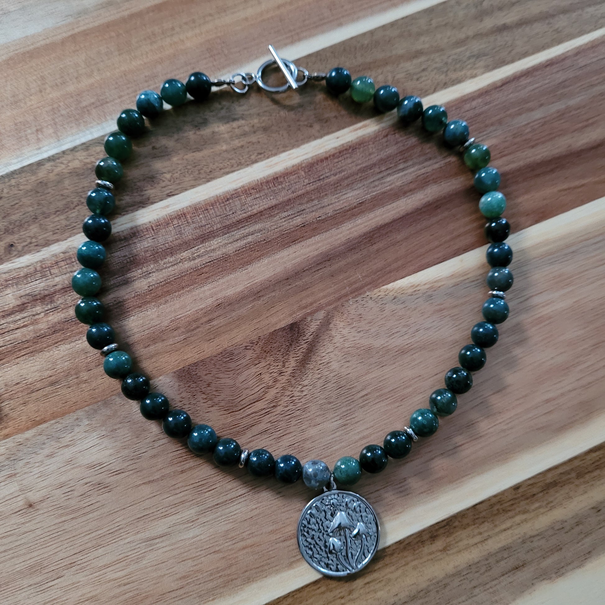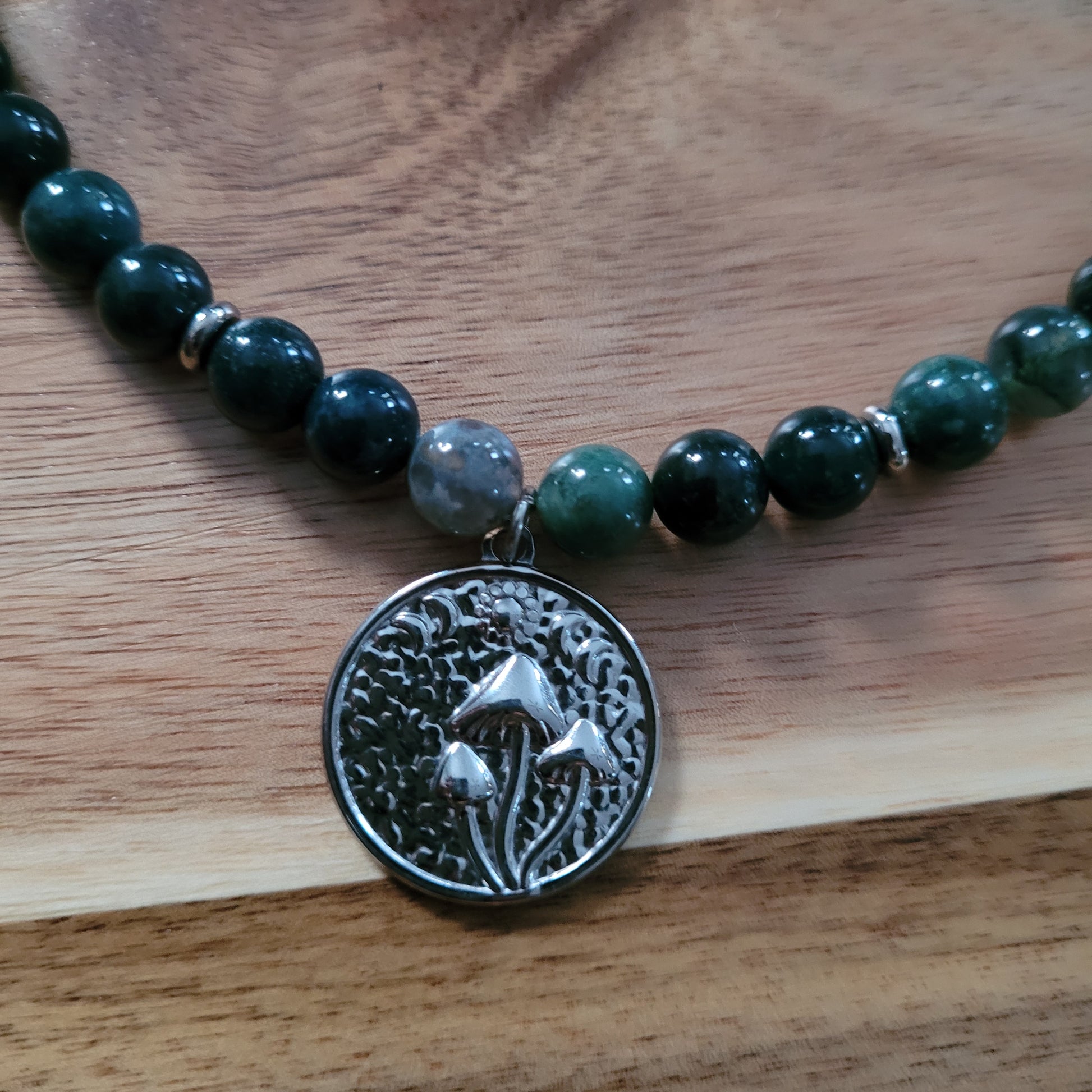 I created this stunning Moss Agate Necklace with a stainless steel mushroom moon phase pendant, stainless steel spacer beads, 100% natural silk cord, stainless steel toggle clasp, aand Moss Agate and Indian Agate crystals! Stunning choker/collar bone length!