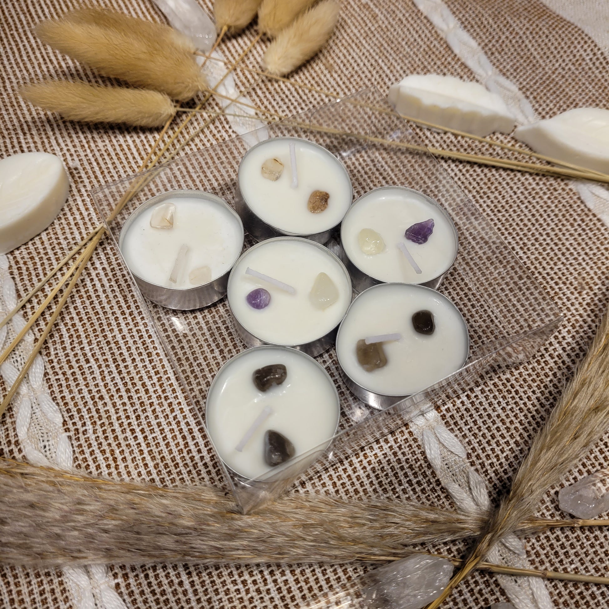 Handmade soy candles created with high quality, clean burning fragrance oil, cotton wick, and decorated with high-quality crystals on top!