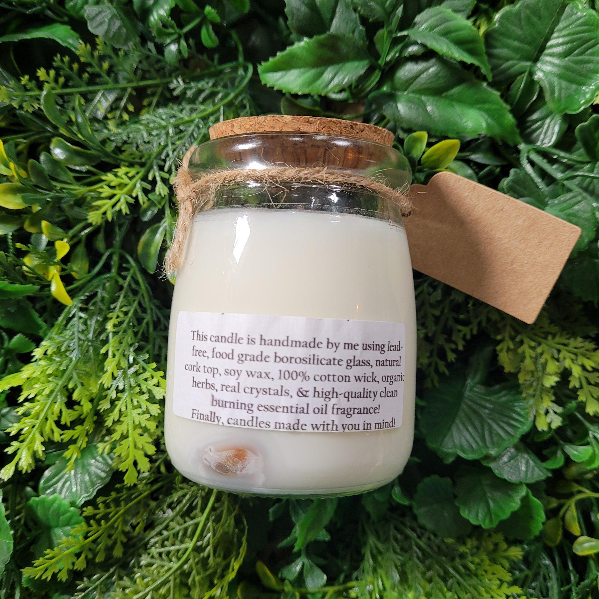 Handmade soy candles created with high-quality clean burning essential oil infused fragrance, 100% cotton wick, lead free borosilicate glass jar, natural cork lid, decorated with organic dried herbs and ethically sourced crystals in a 3.4 oz jar. Plus there is a hidden crystal on the bottom!