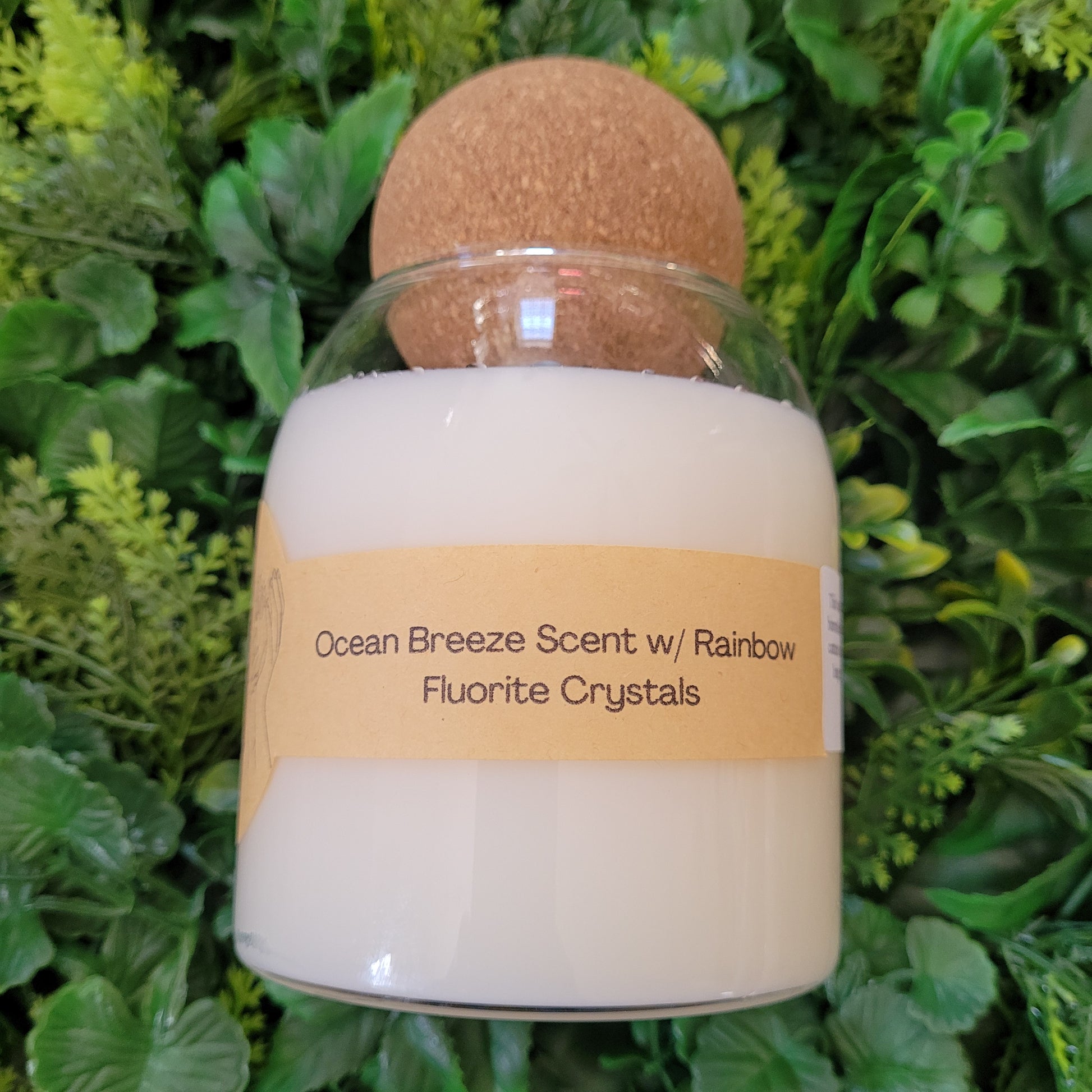 This candle has a lovely Ocean Breeze scent and is decorated with sea shells and Rainbow Fluorite chips on top!