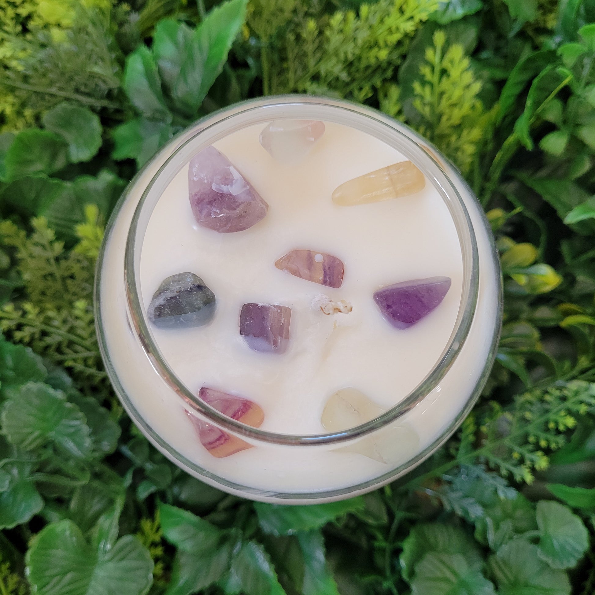 Handmade soy candles created with high-quality clean burning essential oil infused fragrance, 100% cotton wick, lead free borosilicate glass jar, natural cork lid, decorated with organic dried herbs and ethically sourced crystals in a 17 oz jar. Plus there is a hidden crystal on the bottom!