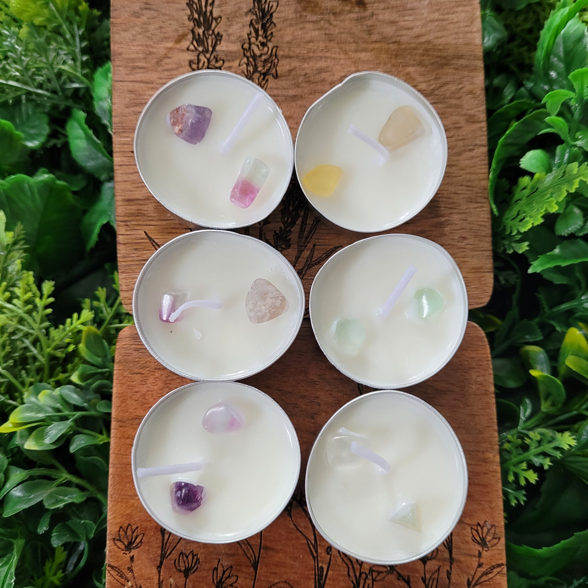 Handmade soy candles created with high quality clean burning fragrance oil, cotton wick, natural soy wax, and decorated with natural ethically sourced crystals!