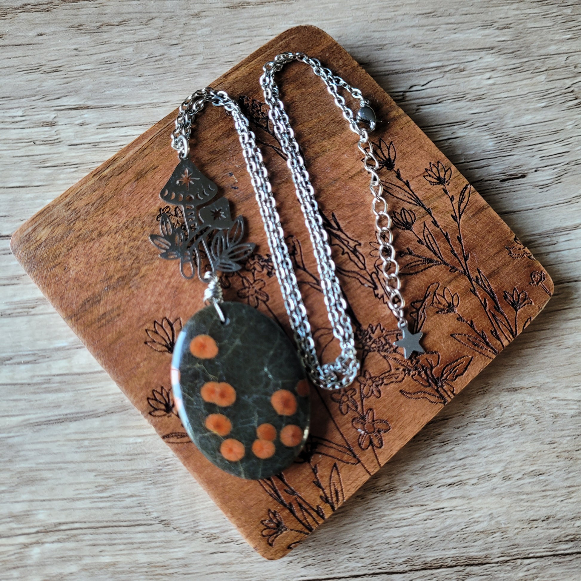 I created this high quality Peanut Obsidian necklace with stainless steel chain, stainless steel  mushroom moon charm, and the Peanut Obsidian crystal is ethically sourced from Mexico!
