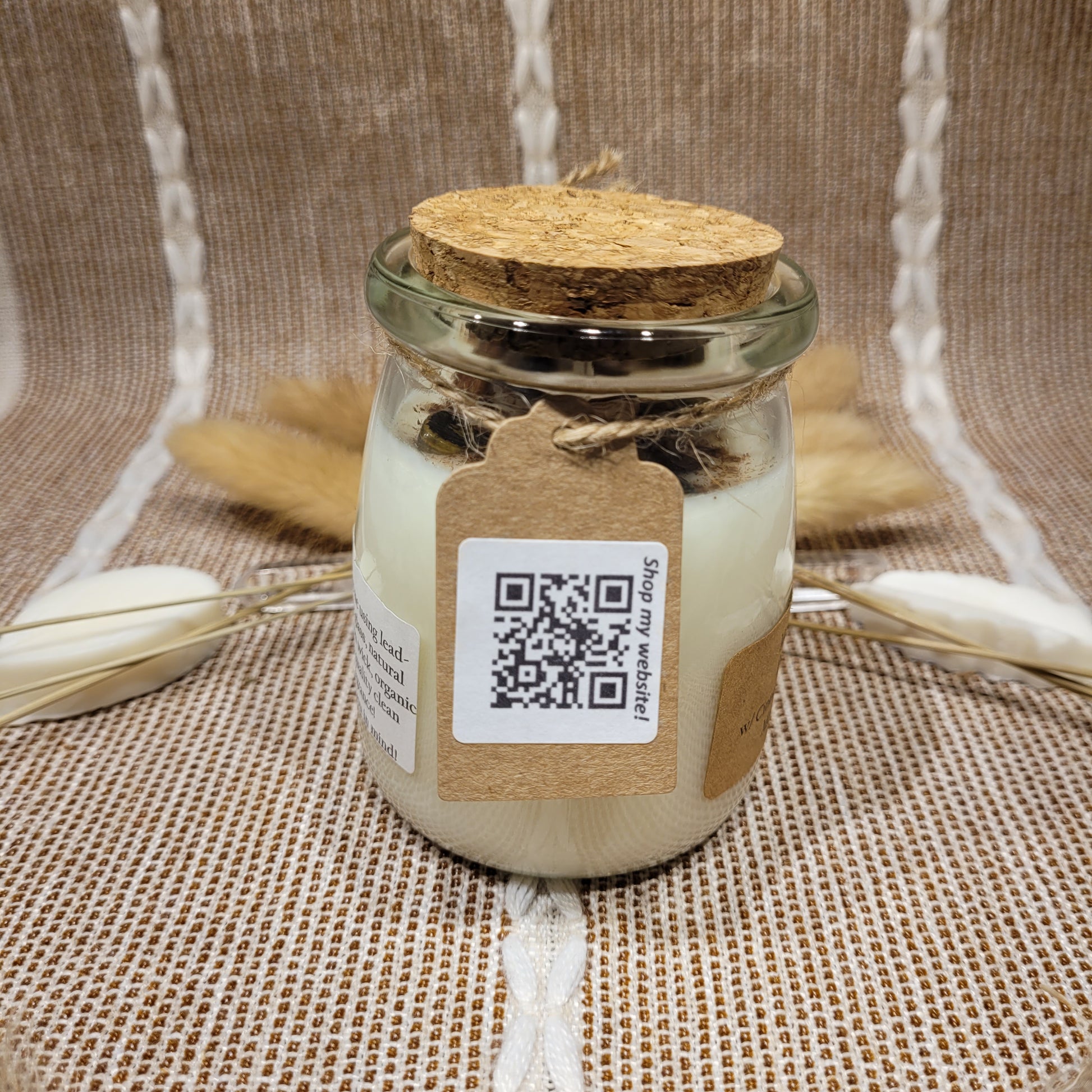 Handmade soy candles created with high-quality clean burning essential oil infused fragrance, 100% cotton wick, lead free borosilicate glass jar, natural cork lid, decorated with organic dried herbs and ethically sourced crystals in a 7 oz jar. Plus there is a hidden crystal on the bottom!