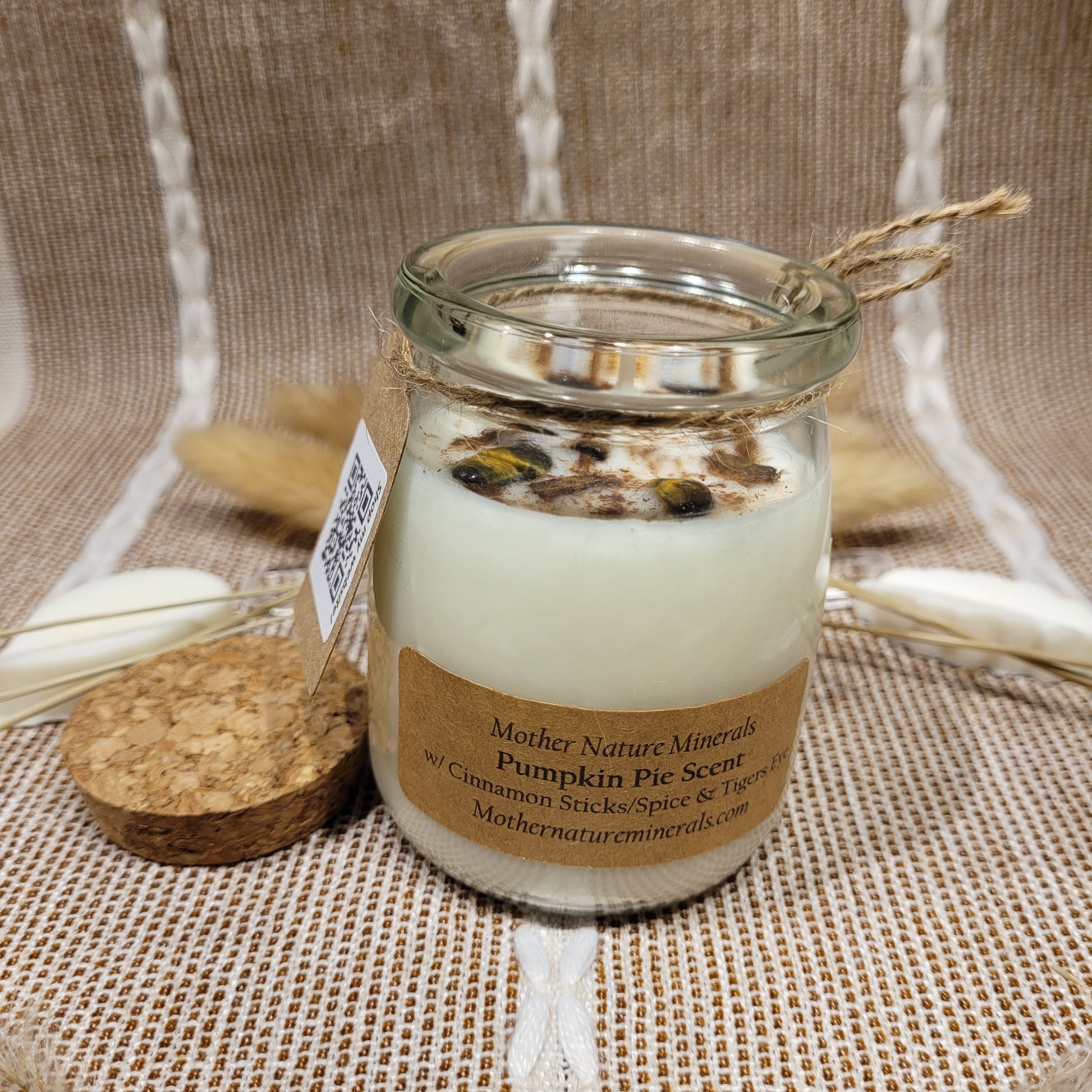 This candle has a lovely Pumpkin Pie scent with Cinnamon bark, nutmeg spice, and Tigers Eye crystal chips on top!